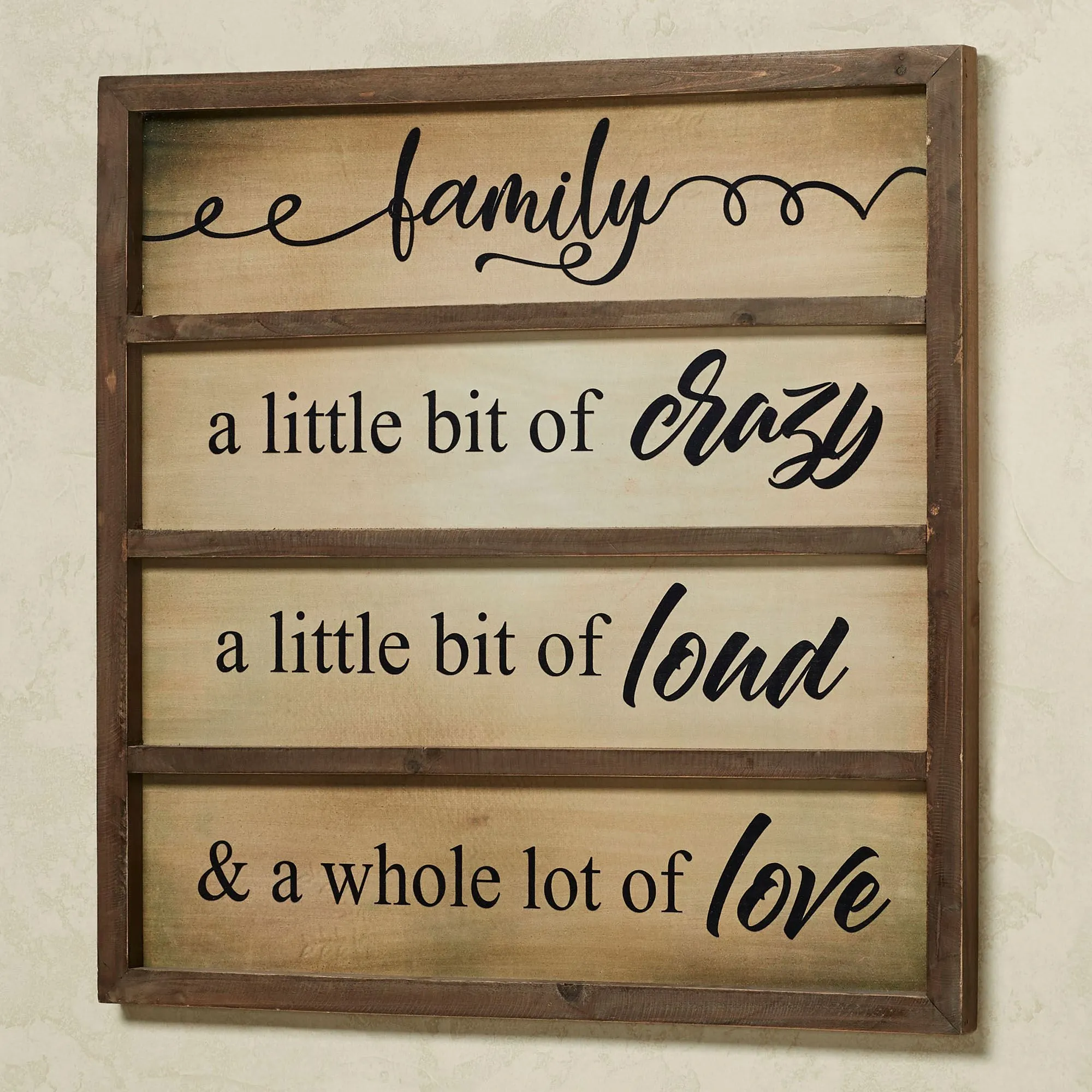 Celebrate the unique blend of love, laughter, and life that family brings into a home with this heartwarming wall plaque. Each natural-finished wooden section, elegantly framed in brown, carries a message that resonates deeply: "a little bit of crazy, a little bit of loud, & a whole lot of love." Perfect for adding a touch of warmth and personality to any living space, this piece serves as a constant reminder of the joy and bond family provides. Crafted with meticulous attention to detail, it embodies both a modern and traditional aesthetic, making it a versatile addition to your decor collection. Whether adorning the walls of a cozy living room or enhancing the ambiance of a welcoming entryway, this plaque infuses spaces with love and light, reflecting the essence of home and the irreplaceable value of family connections.