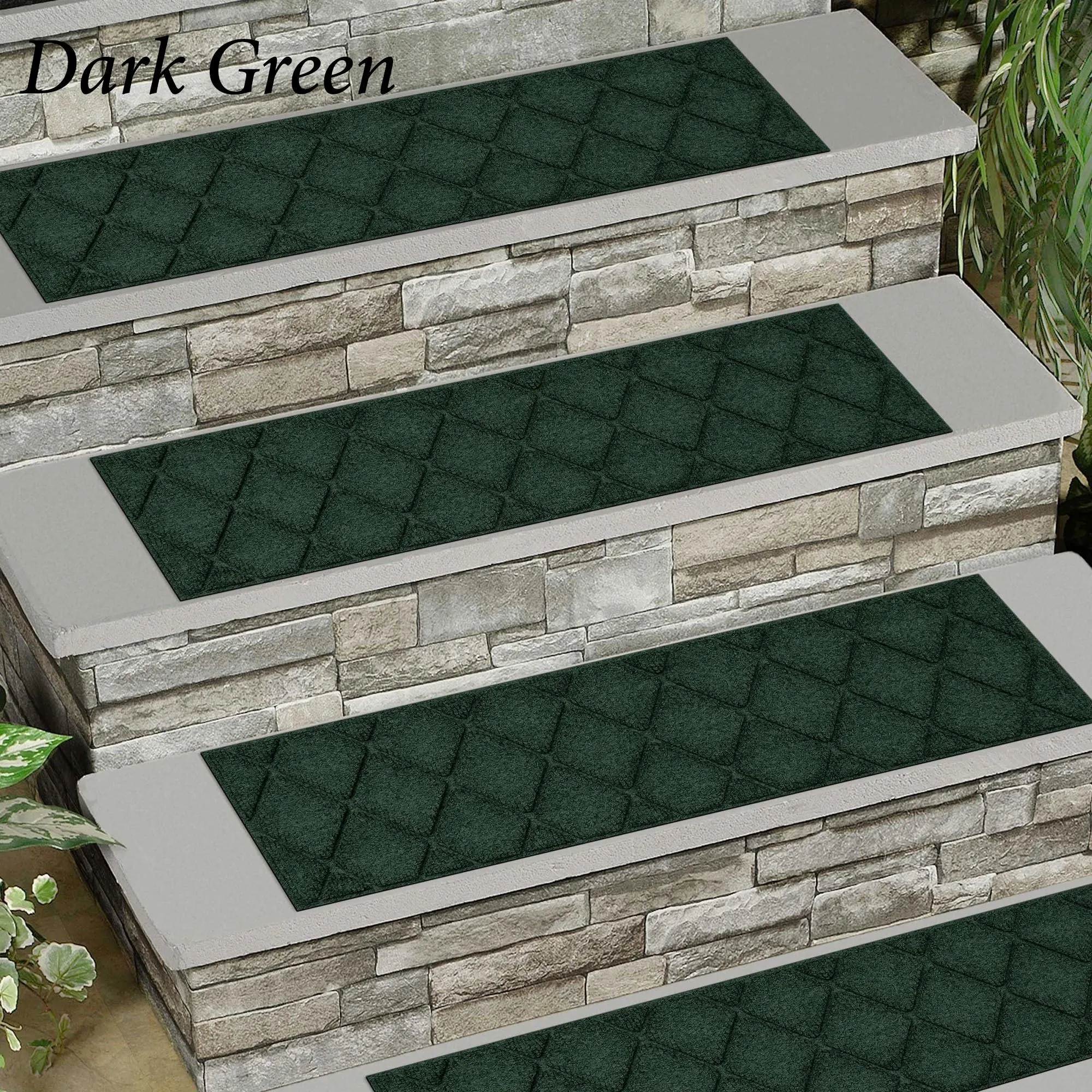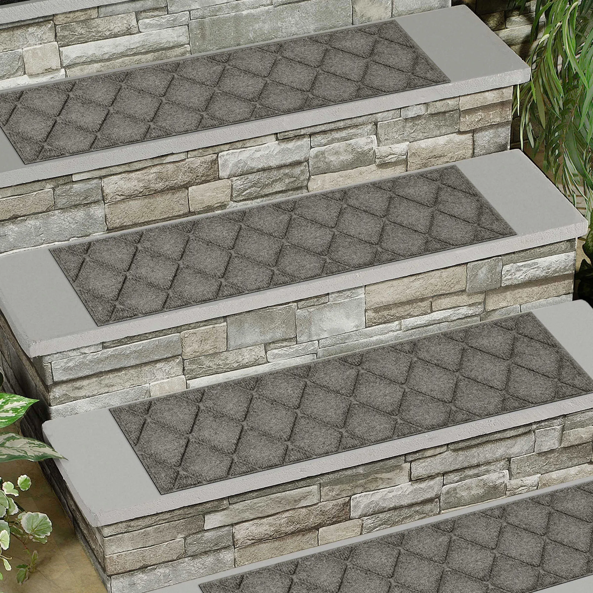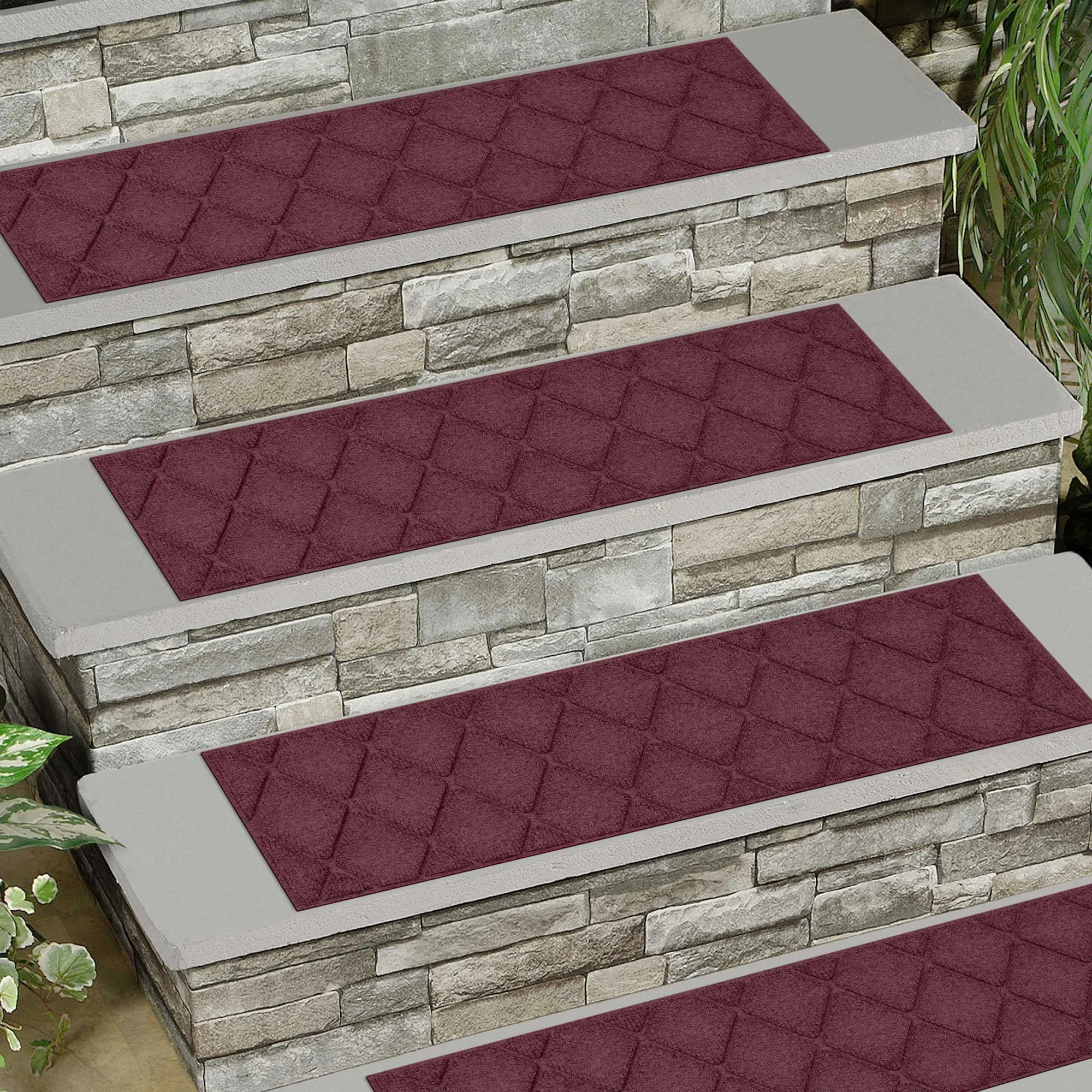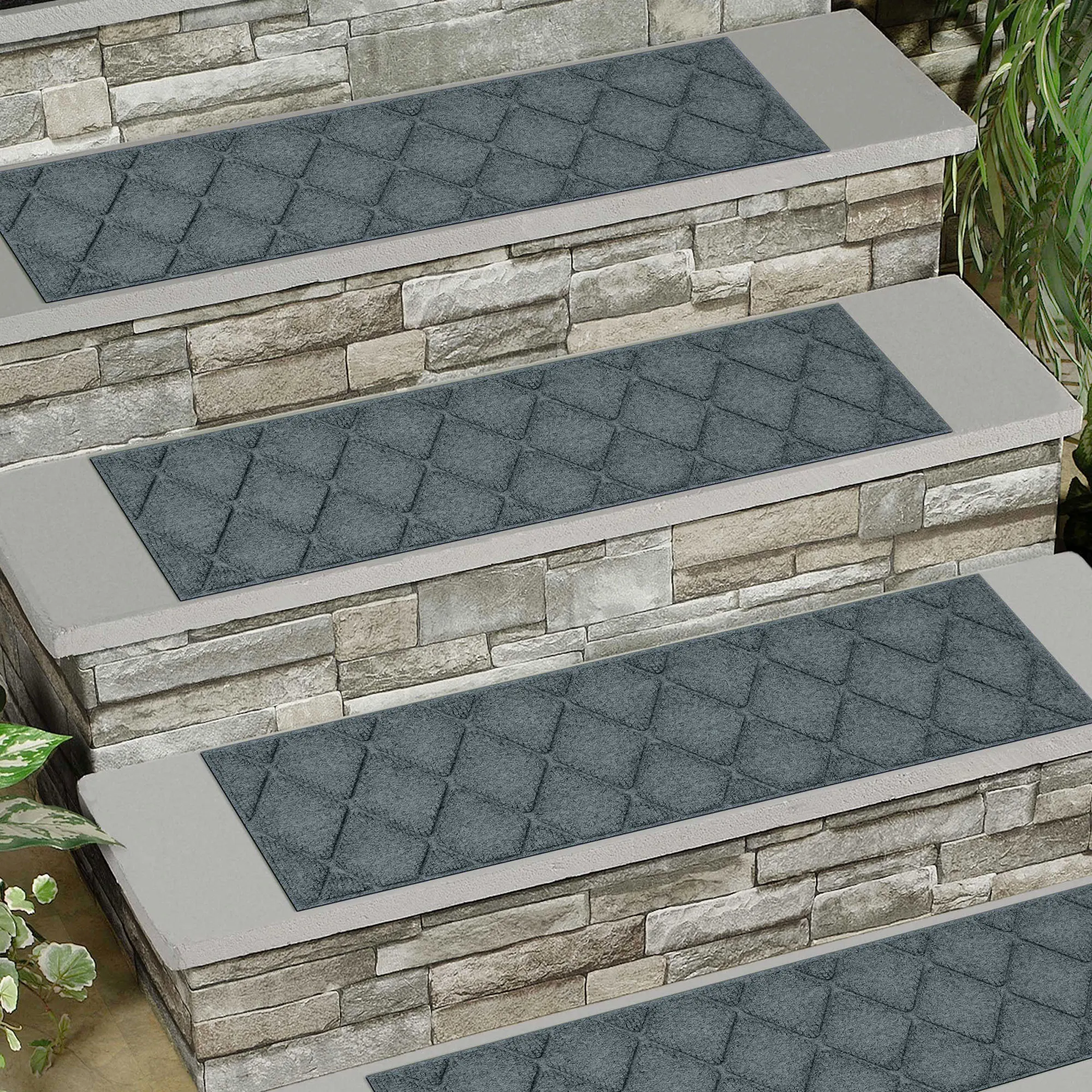 A diamond pattern decorates the indoor/outdoor Abalynn Argyle WaterHog(R) Stair Tread Set. The antistatic PET polyester fiber stair treads have a slip-resistant SBR rubber backing that is skid-resistant and certified by the National Floor Safety Institute. The WaterHog(R) property keeps dirt and water on the treads and not your floor. Stair treads are mildew-, mold-, and rot-resistant. Specify Khaki, Burgundy, Charcoal, Dark Brown, Dark Green, Gray, Navy, or Slate Blue. Stair treads are each 30"x8.5"; sold as a four-piece set. Indoor use or outdoor use year round. Hose off to clean.