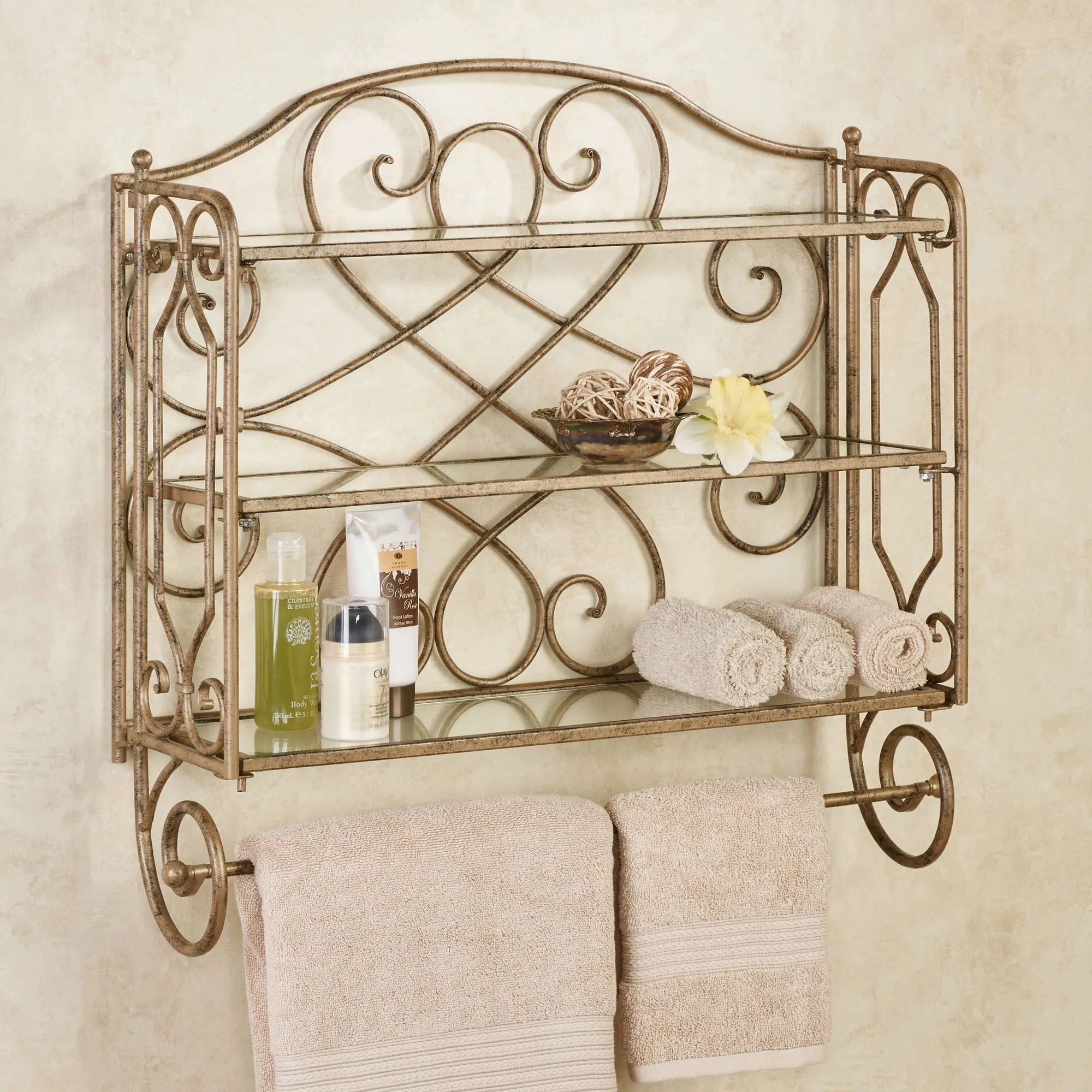 Graceful scrolls add refined elegance to your bathroom from the Abbianna Wall Shelf with Towel Bar. Handpainted in stately antique gold, the handcrafted, wrought iron wall accent features three glass shelves, with 6"H spacing between for your storage needs; and a lower bar for hanging your towel. Measures 24"Wx7.5"Dx24"H; weighs 17 lbs.