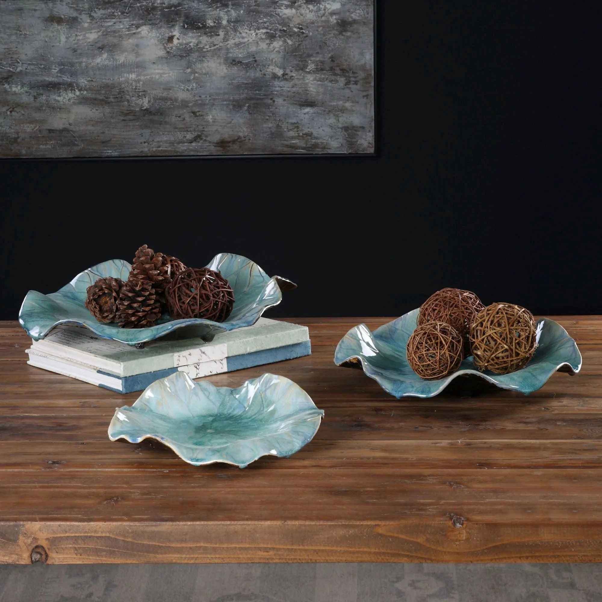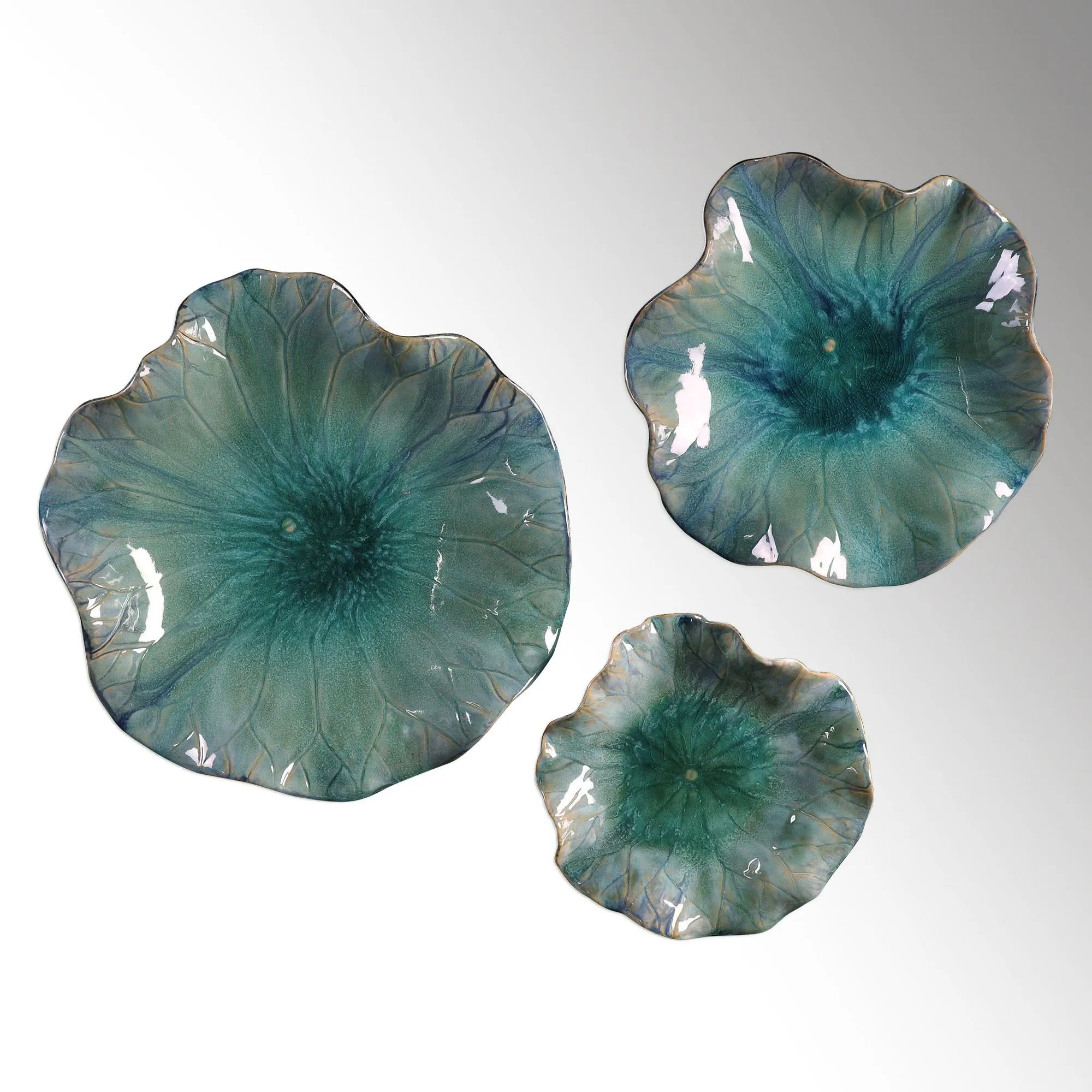 Arrange the Abella Flowers in an artful display. Ceramic blossoms, with detailed veining, are beautifully glazed in fresh Caribbean blue shades. This flower trio, designed by artist Billy Moon from Uttermost, may be hung on the wall or used as a tabletop accessory. Small is 11"dia.x3"D; medium is 15"dia.x3"D; large is 18"dia.x4"D. Set weighs 14 lbs. Four sets are shown in the main image.