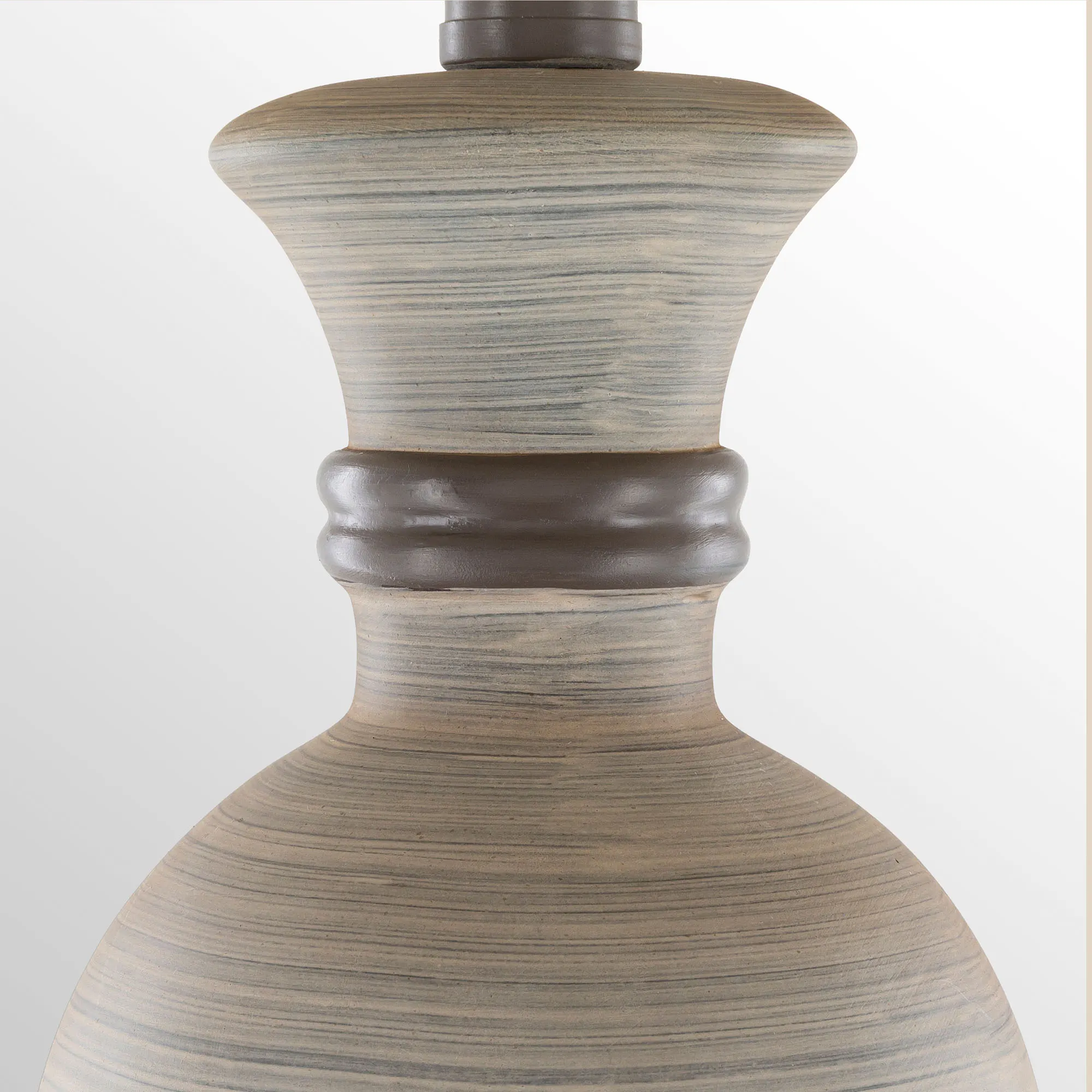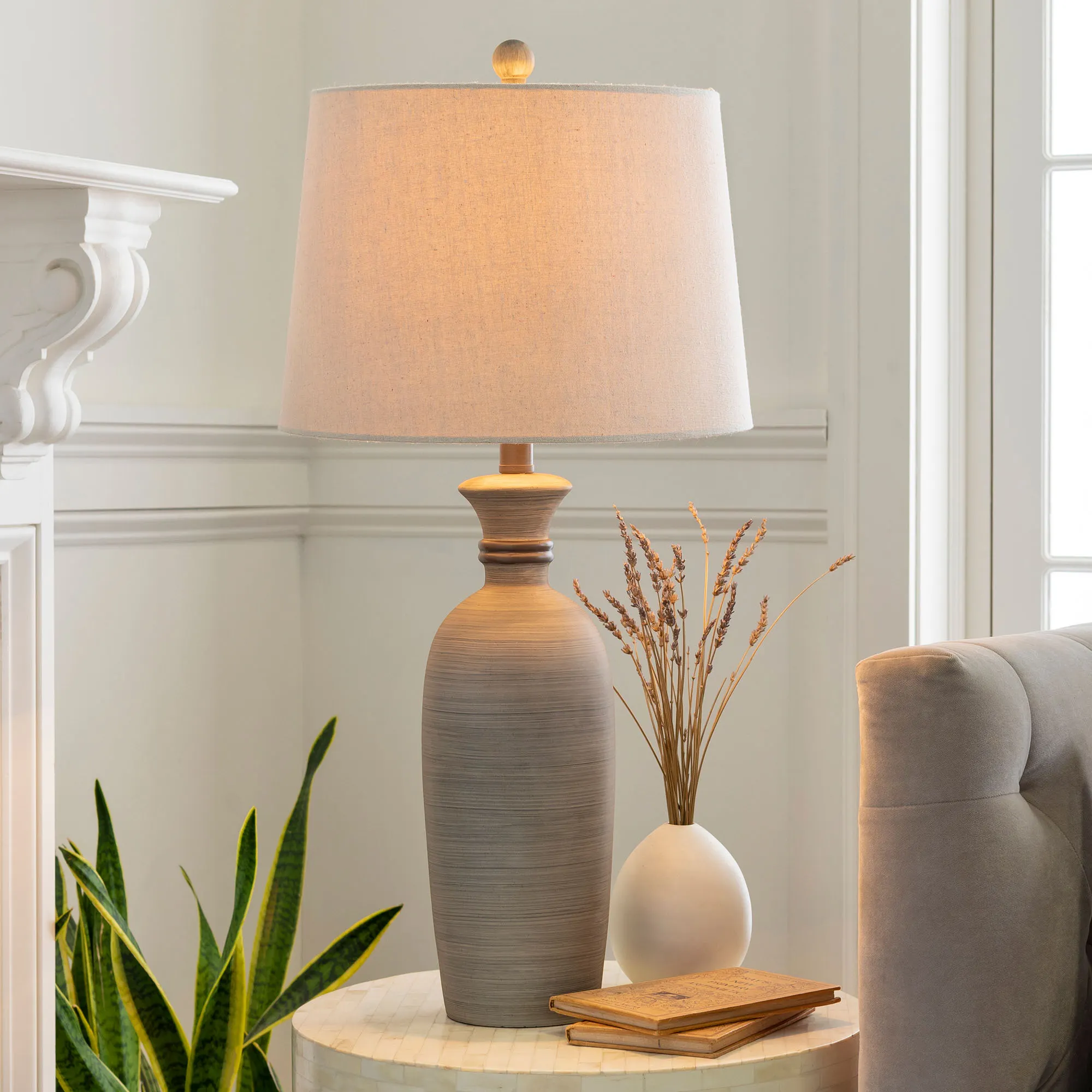 Resembling a ginger jar-style vase, the Abellona Table Lamp brightens your home with its classy style. Made of resin, this table lamp has a hand-finished brushed light and medium gray finish and a charcoal ribbed accent. The hardback shade is natural linen polyester. UL listed. Requires one 150W max. 3-way bulb. Measures 14"dia.x29"H, including the finial.