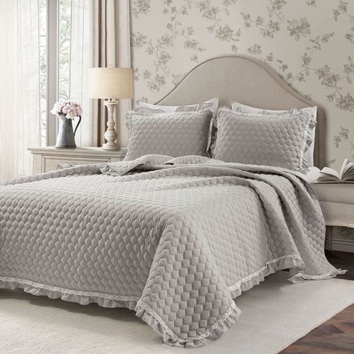 Subtle details add a polished look to the Abigail Light Gray Bedding. The Mini Quilt Set includes a quilt and two shams. This stunning polyester bedding is solid light gray with all-over quilting. Quilt has a 3" ruffle at the bottom, white lace accents, and a solid color backing; fill is polyester. The shams mimic the quilt and have white lace accents, 3" ruffled flanges, and French back closures. Dry cleaning is recommended. Imported.