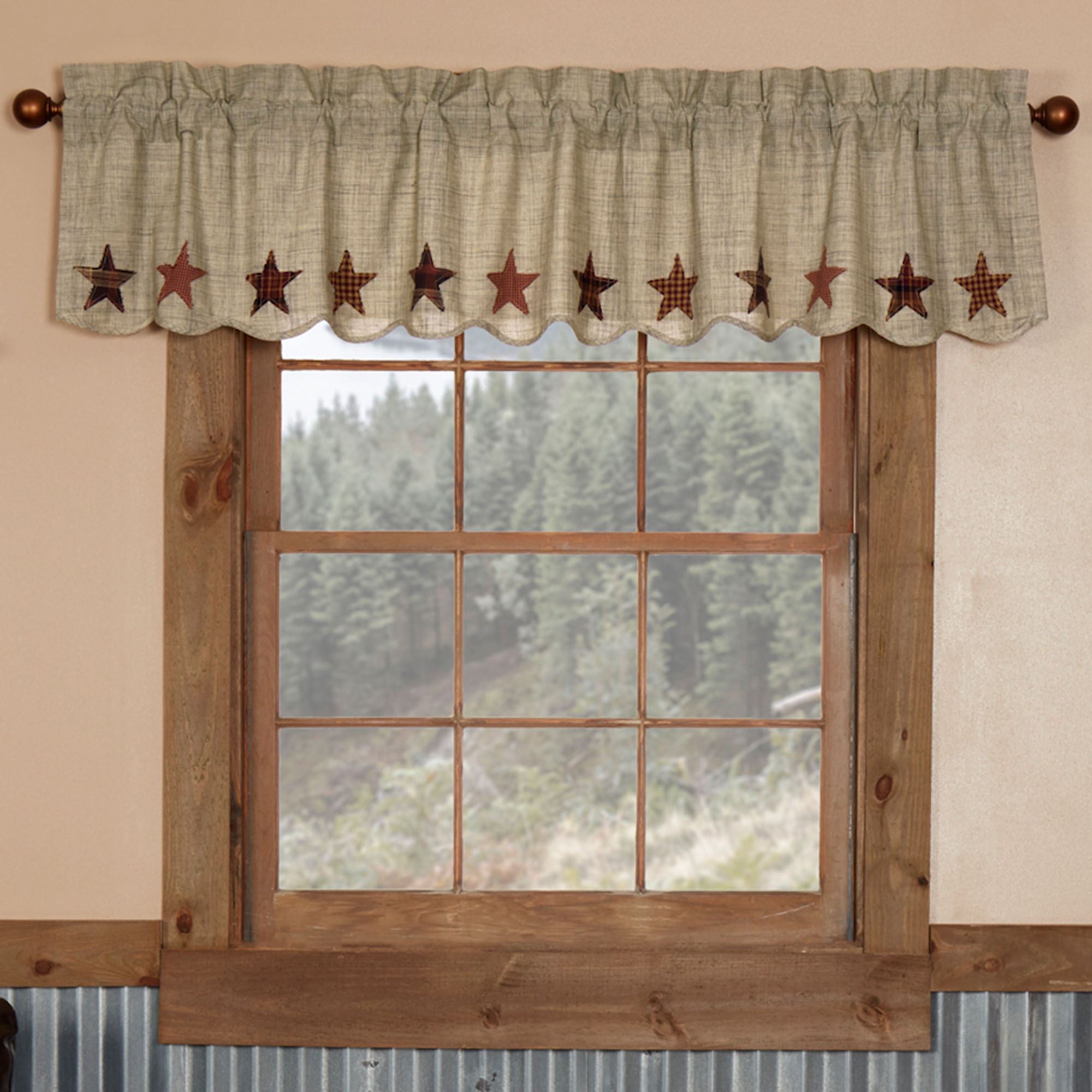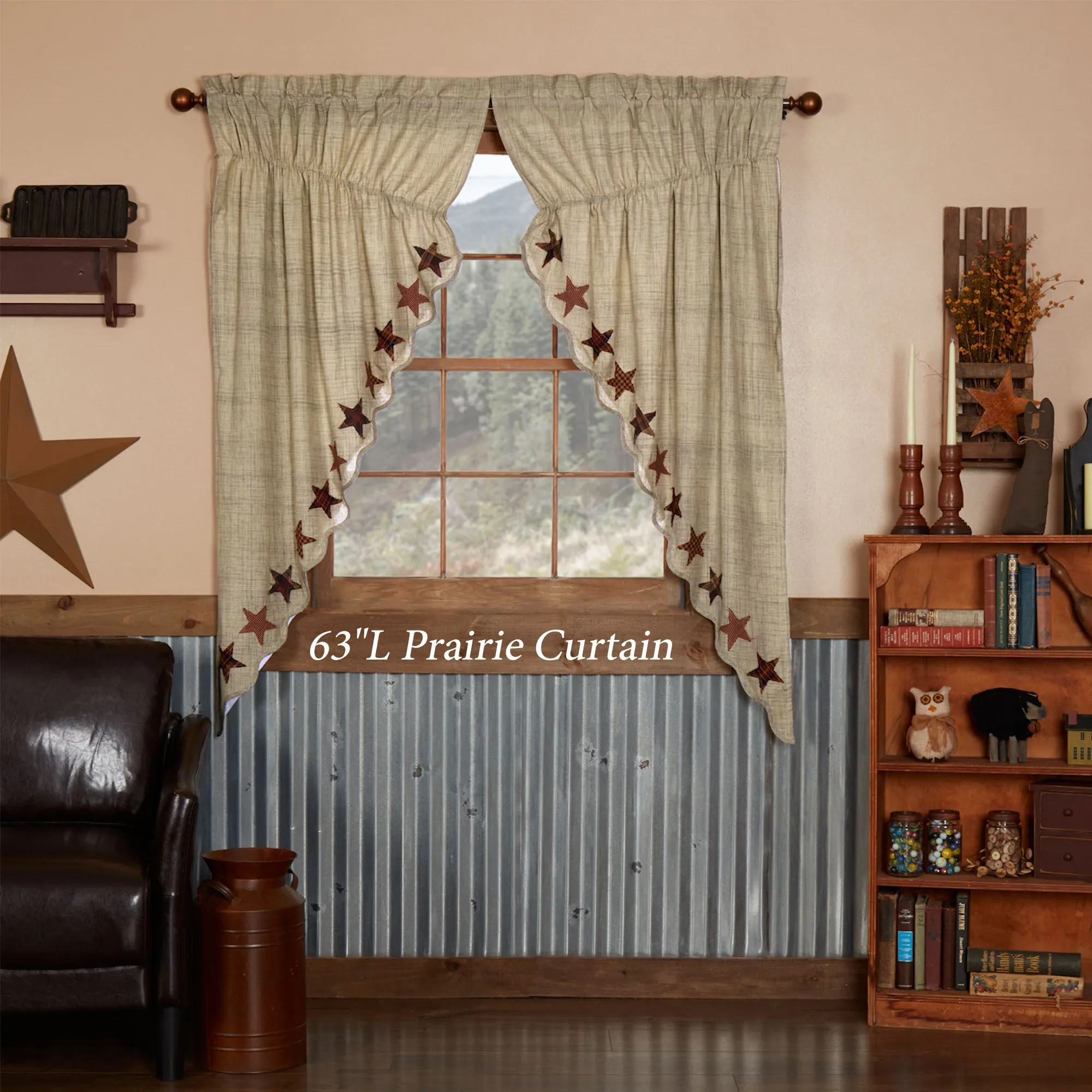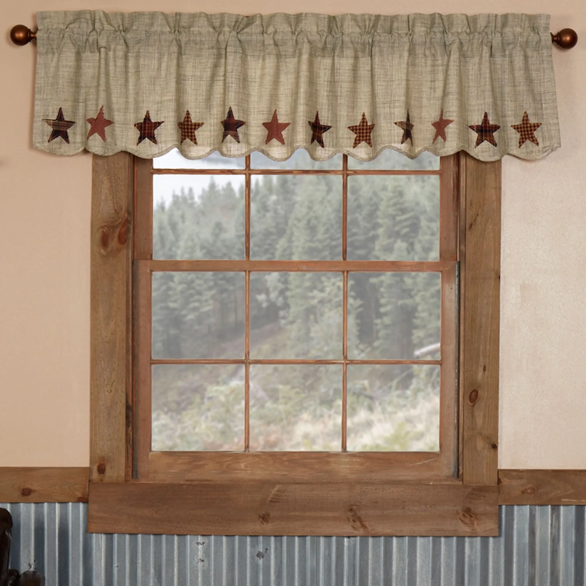 Lined Window Treatments are cream with a dark gray slubbed look and have star appliques with frayed edges. Rod pockets are 3.25". Curtains have scalloped and bound bottom edges and include tiebacks. Available in two sizes. Prairie Curtains have scalloped and bound inside edges. Available in two lengths. Valance has a scalloped and bound bottom edge.