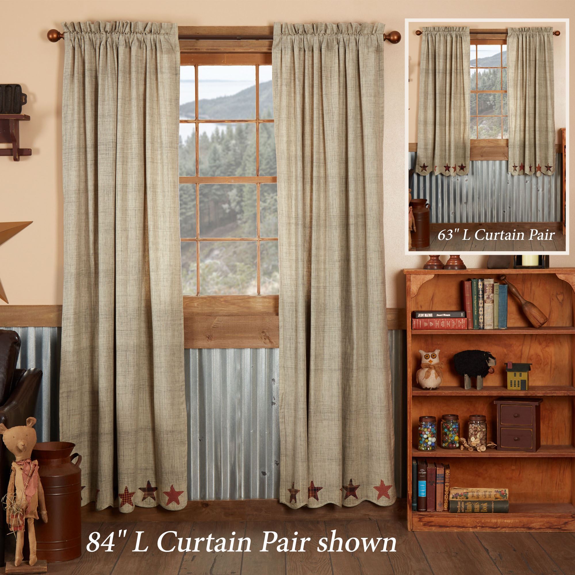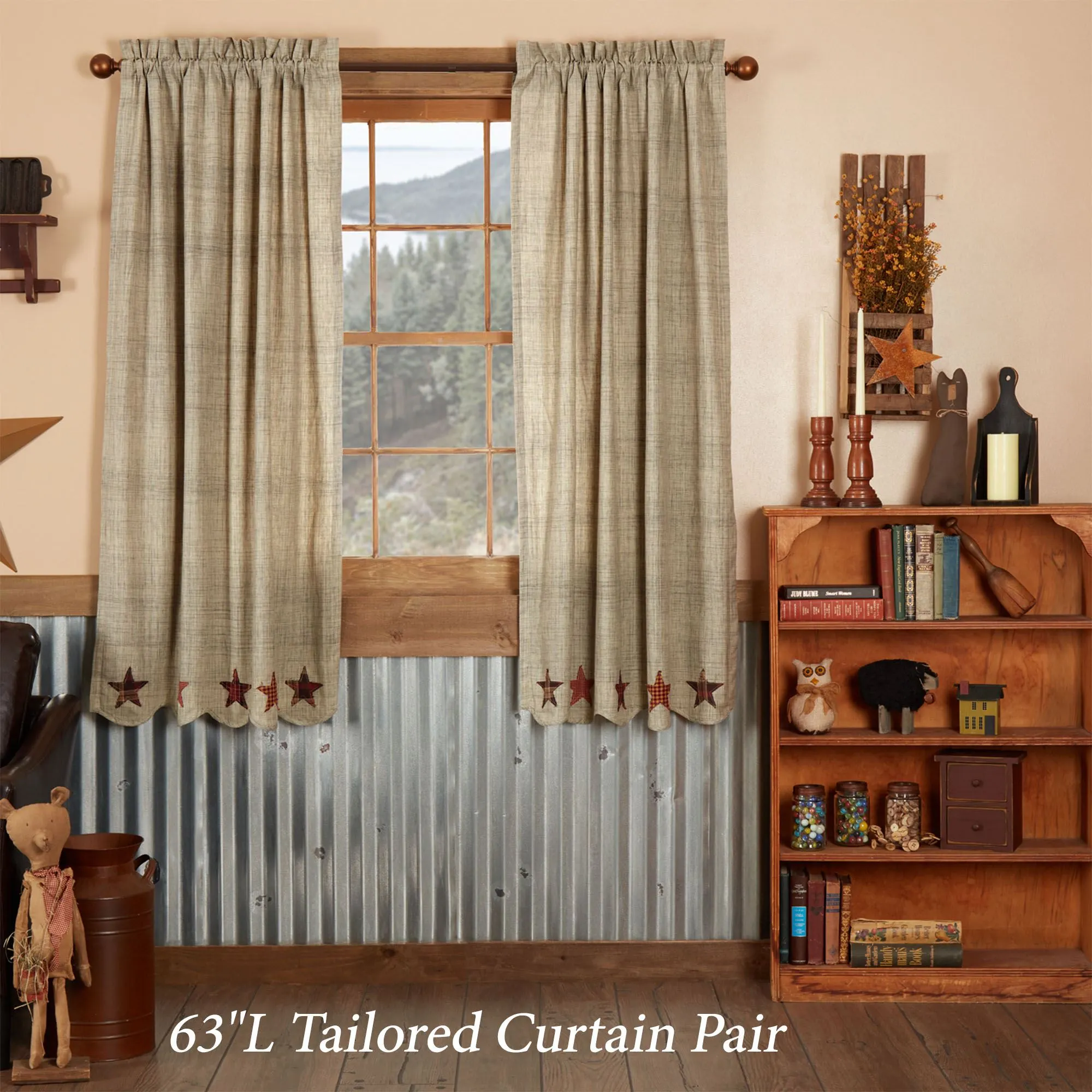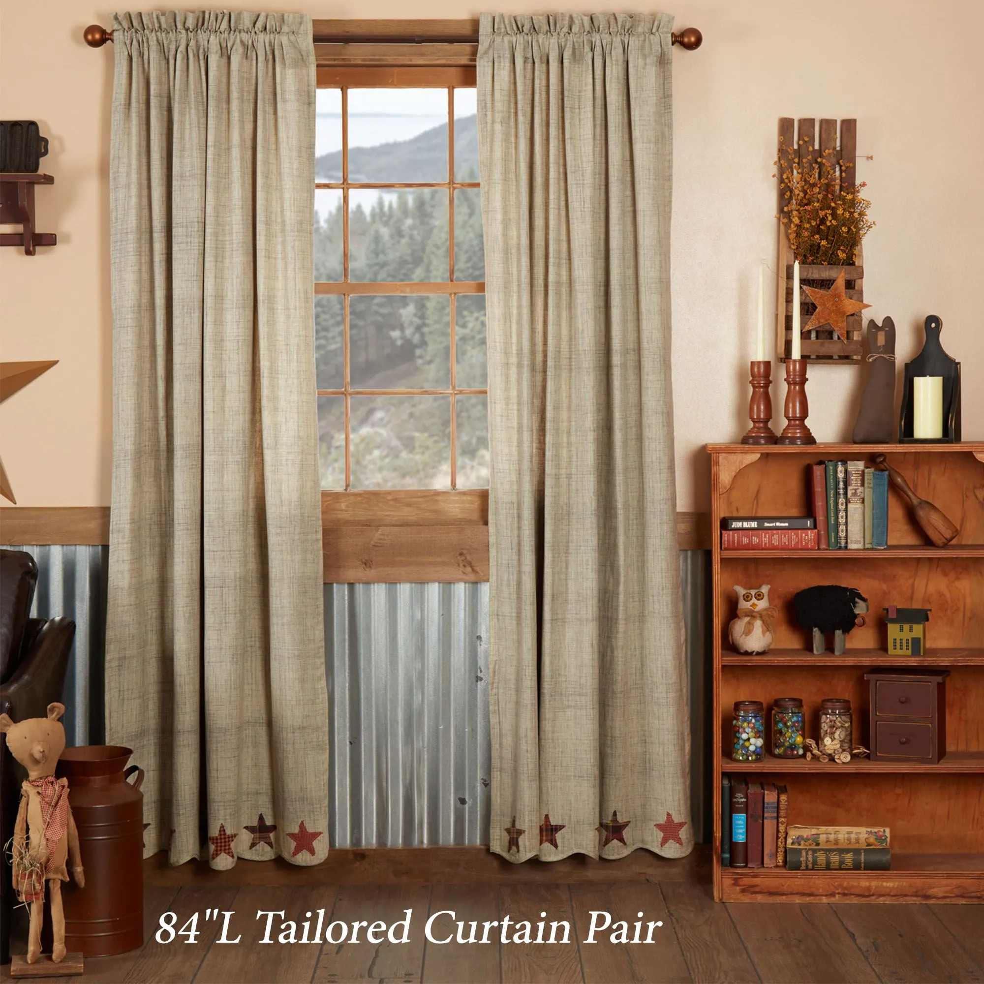 Lined Window Treatments are cream with a dark gray slubbed look and have star appliques with frayed edges. Rod pockets are 3.25". Curtains have scalloped and bound bottom edges and include tiebacks. Available in two sizes. Prairie Curtains have scalloped and bound inside edges. Available in two lengths. Valance has a scalloped and bound bottom edge.