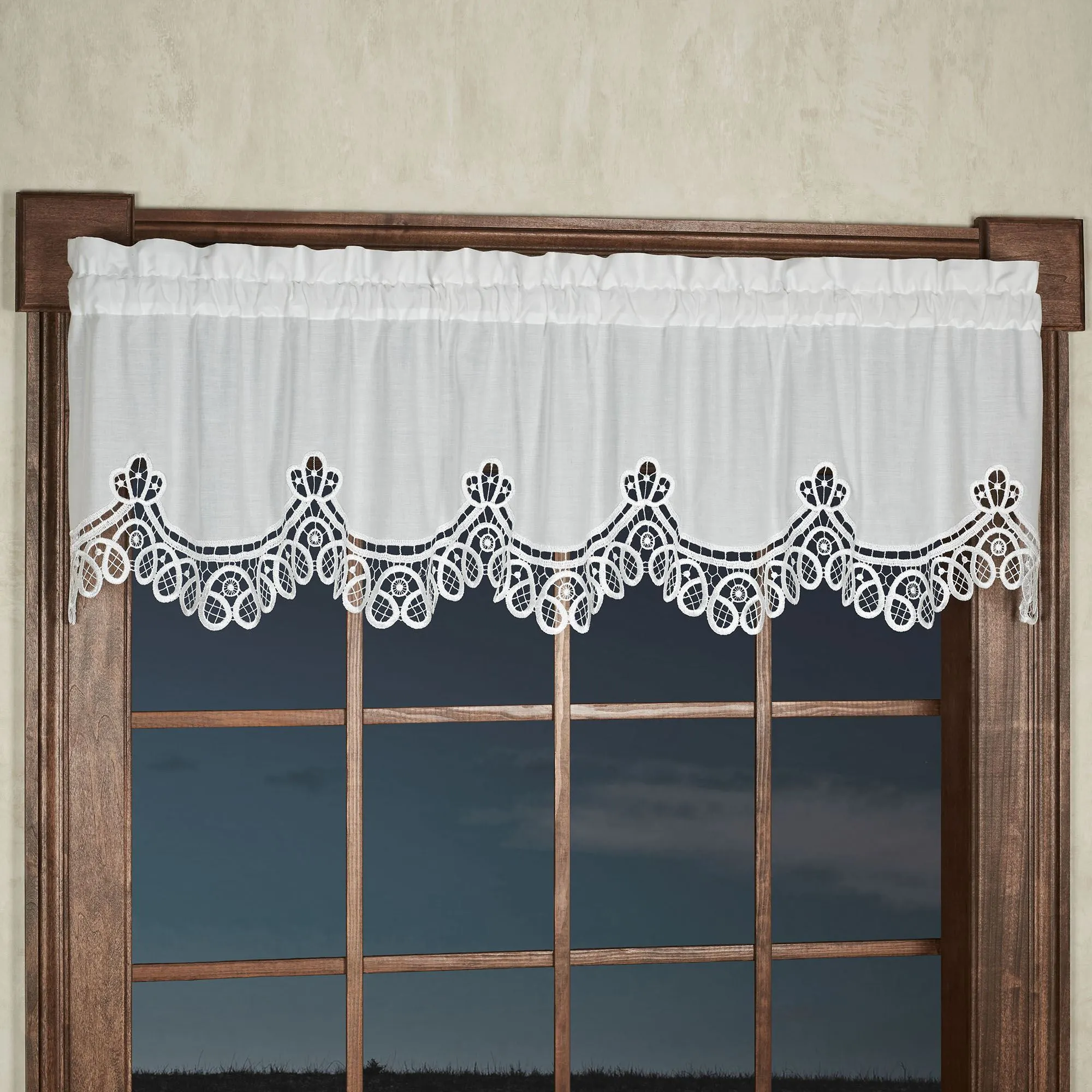 • Window treatment features Battenburg-style lace trim