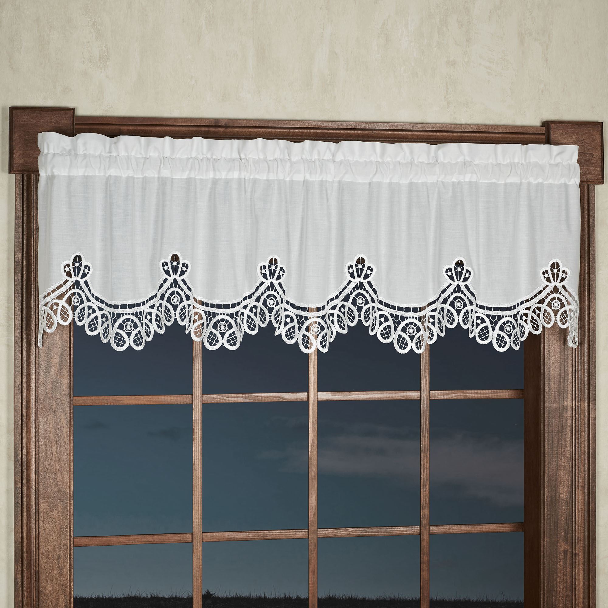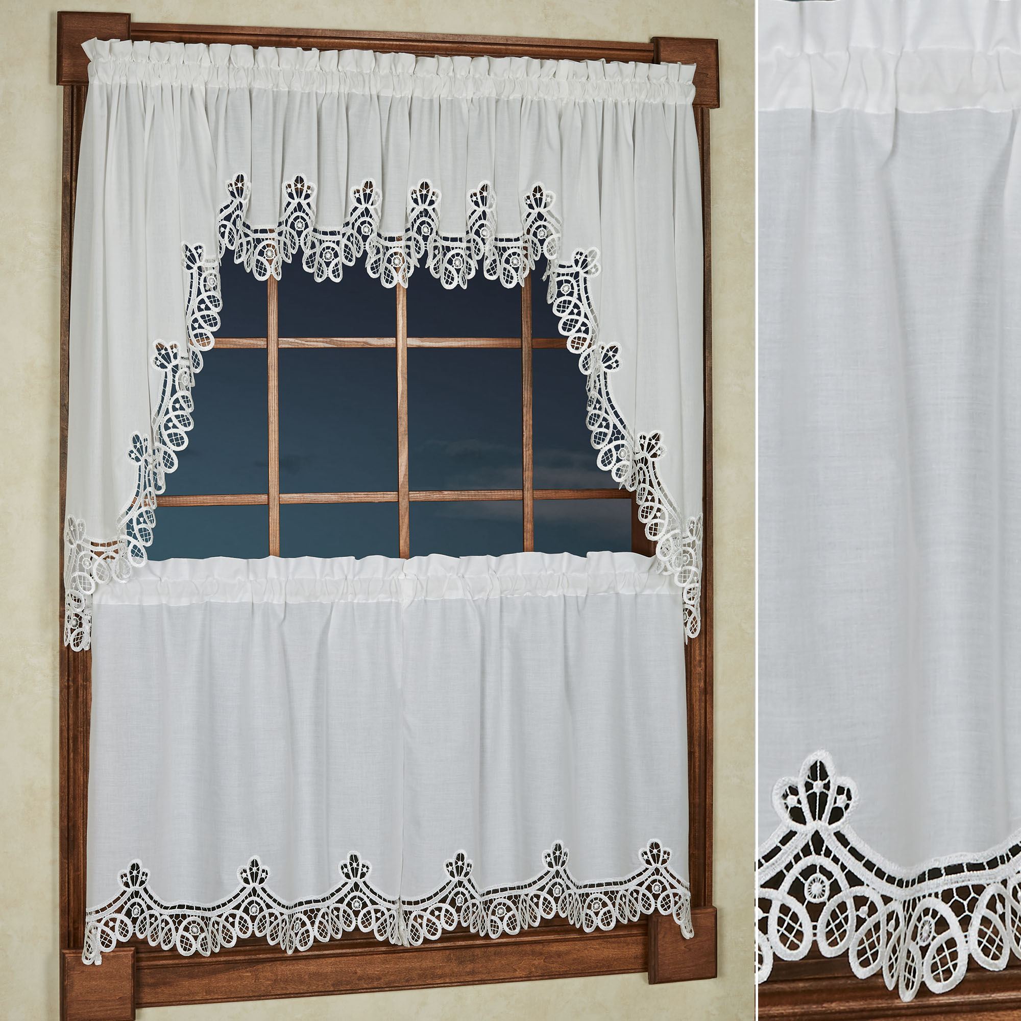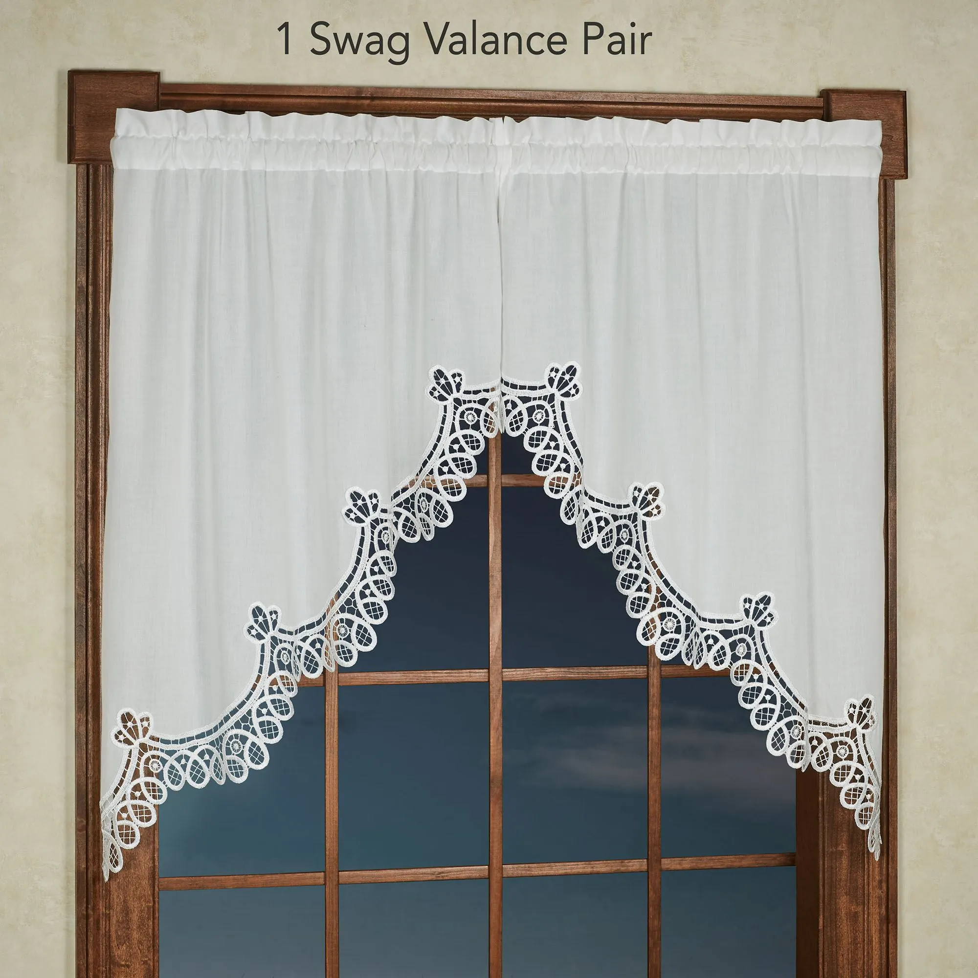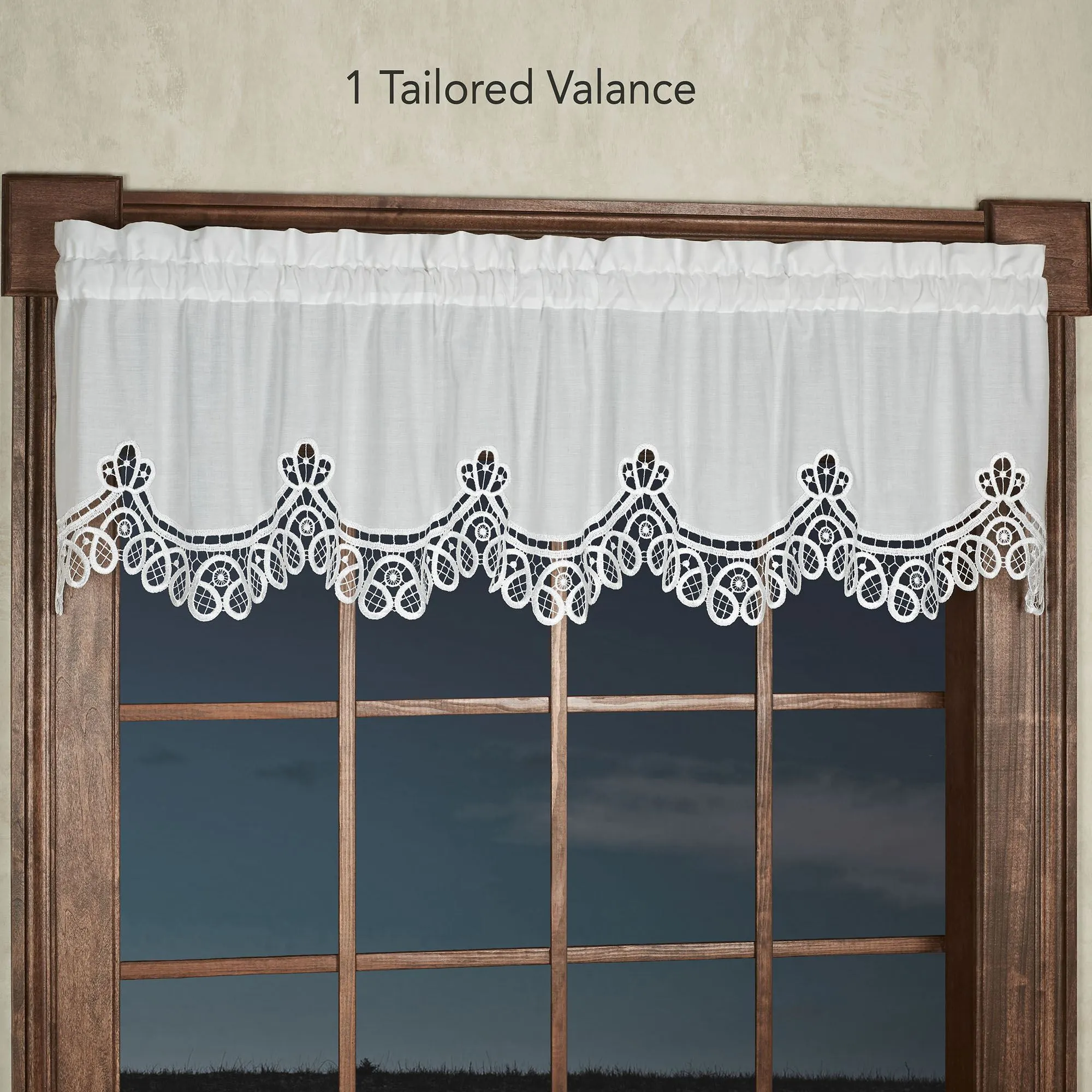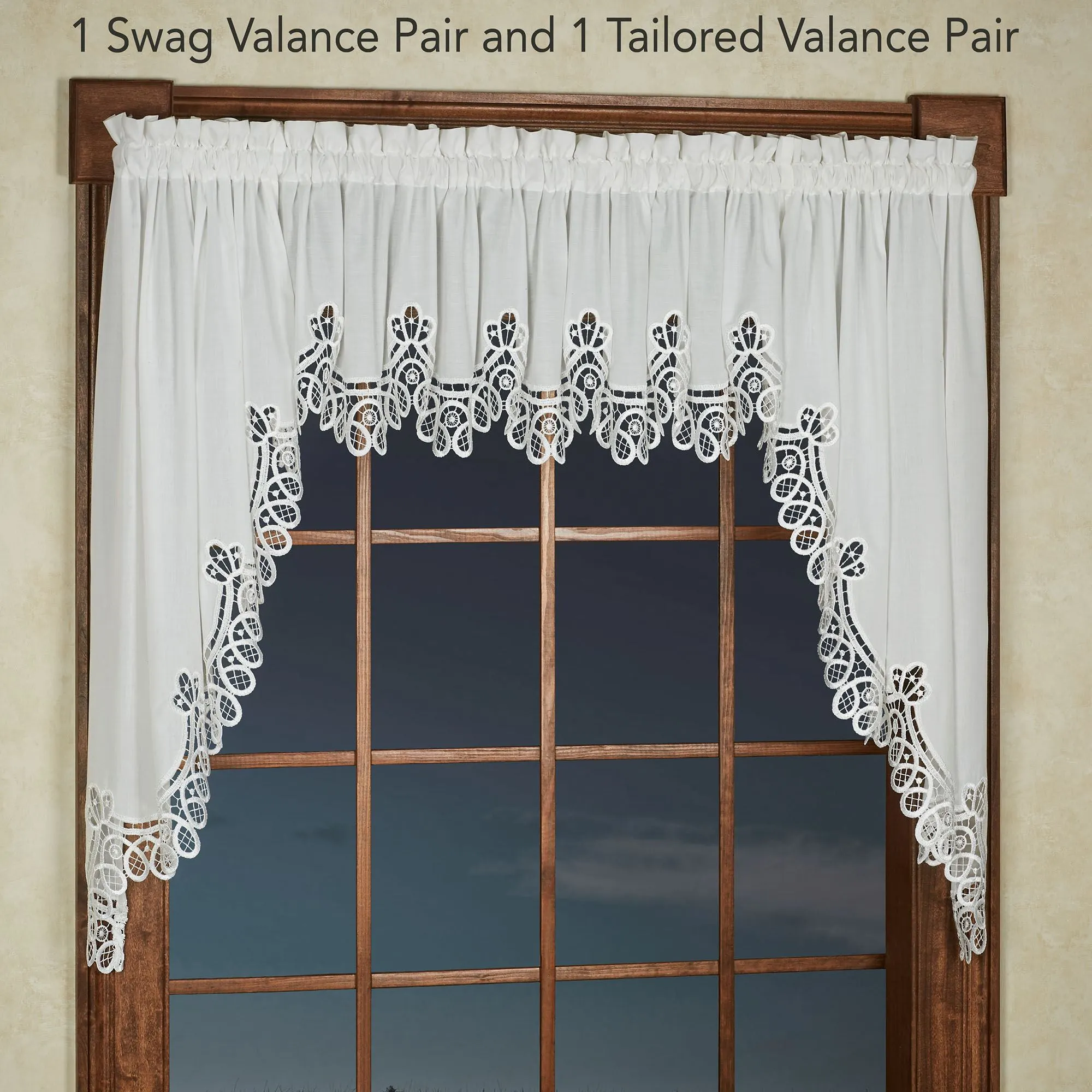 Battenburg-style lace trim gracefully swoops and swirls with elegance on the Abilene Tier Window Treatment. This white polyester/cotton window treatment features embroidery and a graceful scallop design. Rod pocket is 1.5". The Tier/Swag Set includes a swag valance pair, 56"Wx38"L; and a tier pair, 56"W. Swag Valance Pair is also available separately. Tailored Valance, 56"Wx14"L, is sold separately. Machine washable. Imported.