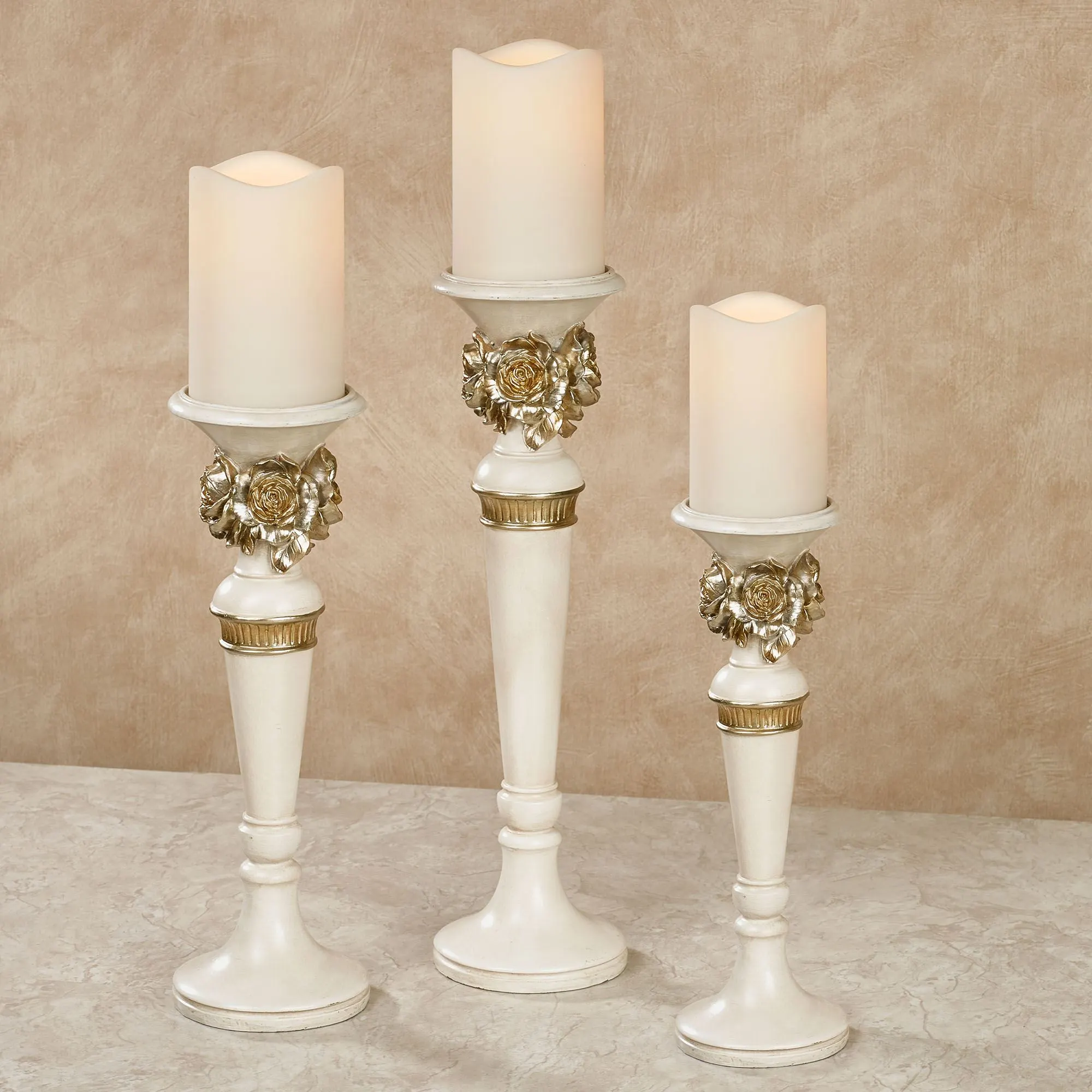 Splendid antique gold roses blossom along the Abiline Candleholder Set. Each ivory polyresin candleholder features a shaped design, beveled trim, ribbed details, and a candlecup that will hold your 3" dia. pillar candle. Each candleholder measures 4"dia.x10"-14"H.