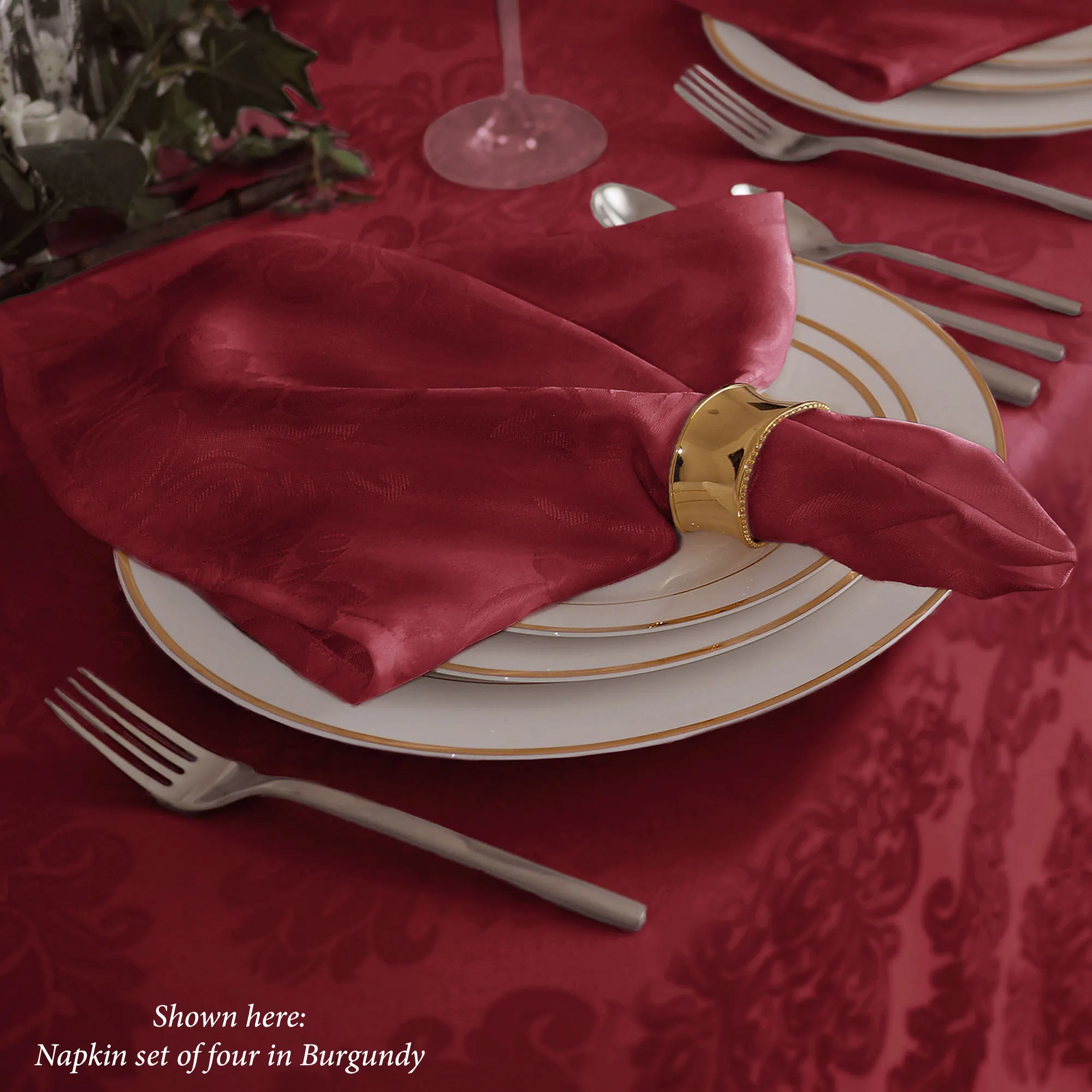 A sophisticated dining style is elegantly displayed with the intricate damask pattern on the Abshire Table Linens. The silky, woven polyester table linens repel water and are stain- and fade-resistant. Specify Burgundy, Beige, Charcoal, Cream, Gold, Hunter Green, Red, or White. Wipe with a damp cloth or machine wash. Imported.