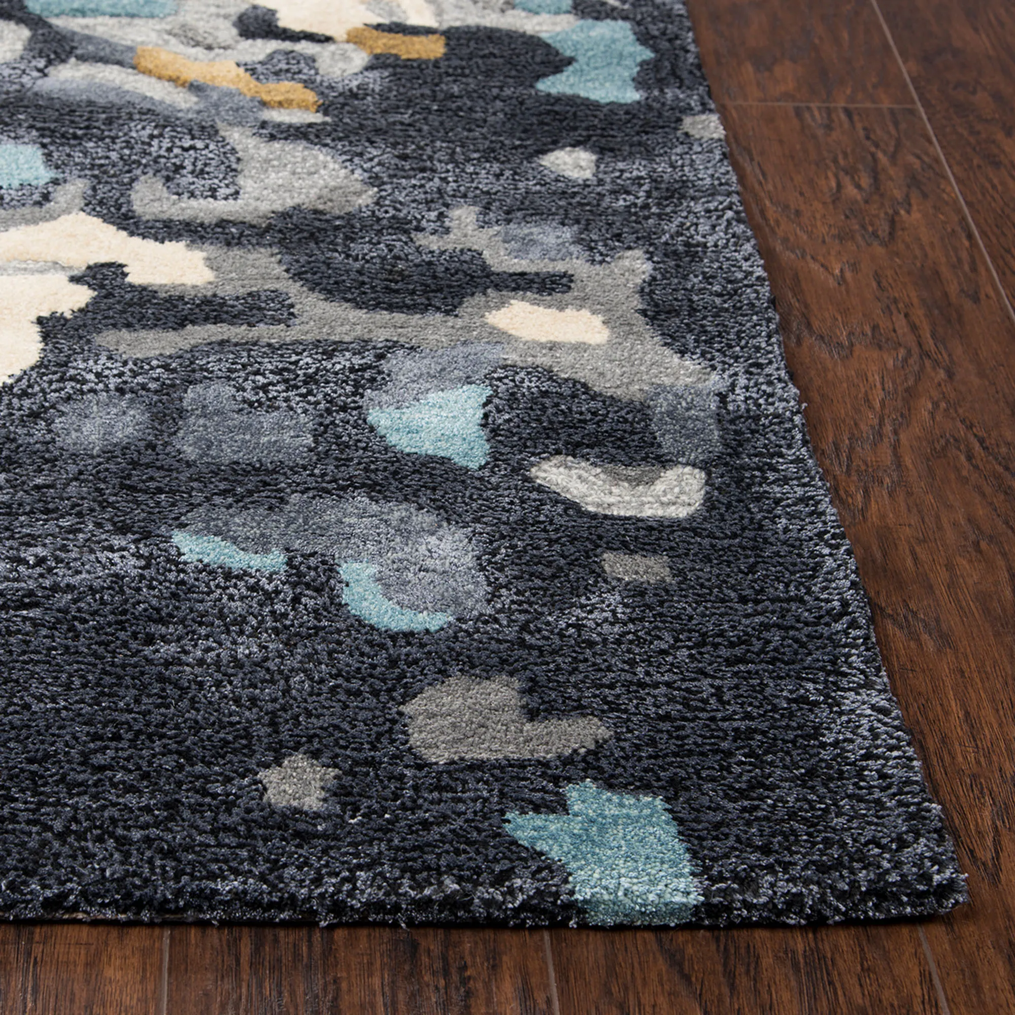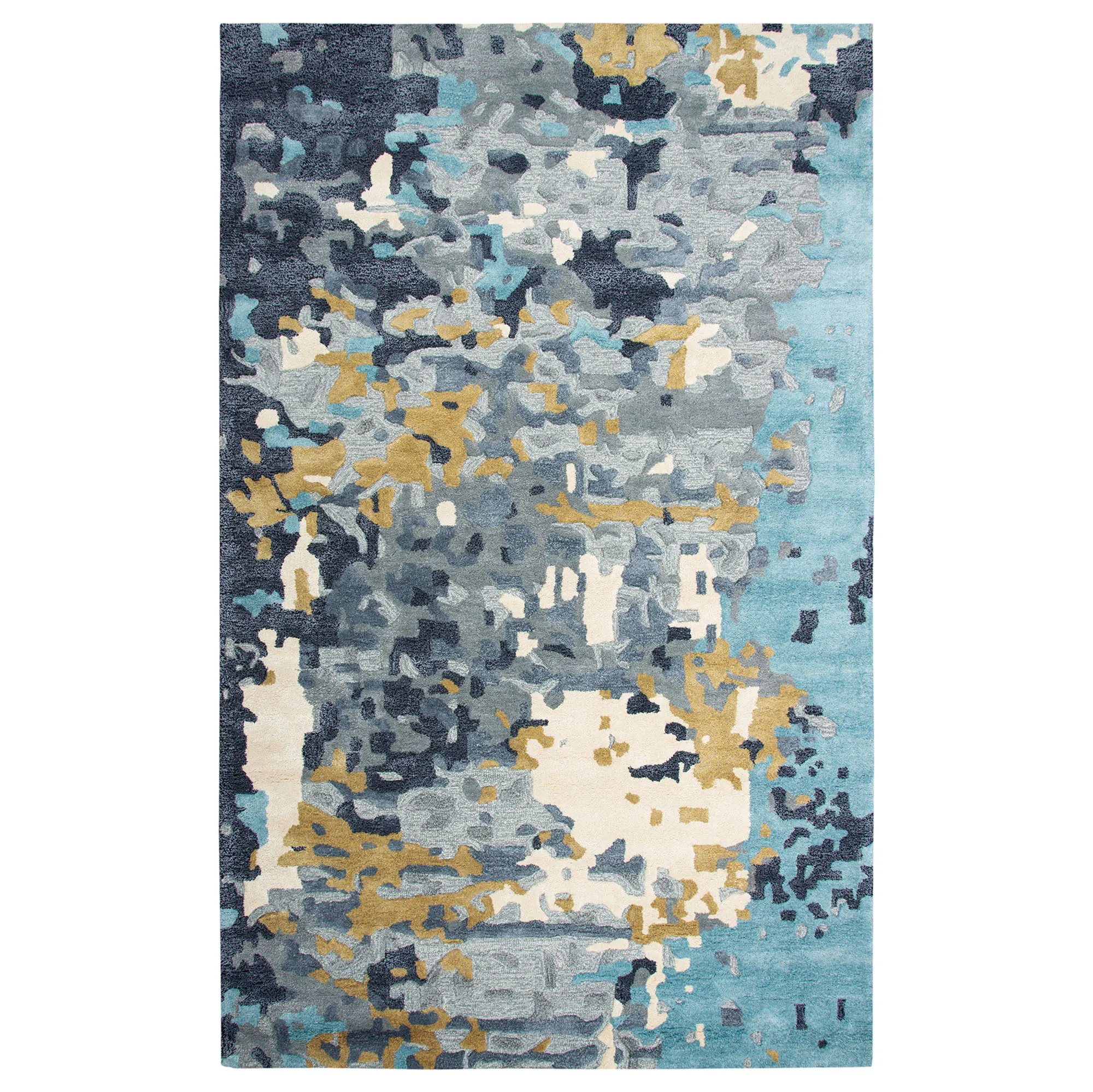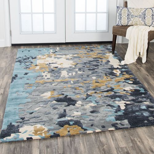 An Abstract Palooza of handcrafted artistry adorns a space with undeniable style. Hand-tufted from a wool and tencel blend, the .5" thick hand-serged rug features an abstract dappled color palette of navy blue, light blue, dark gray, light gray, gold, and light cream. Handcarved and hand-hooked details create a dimensional hi-low effect full of texture. Backing is cotton canvas. We recommend professional cleaning by a rug cleaner. Imported.