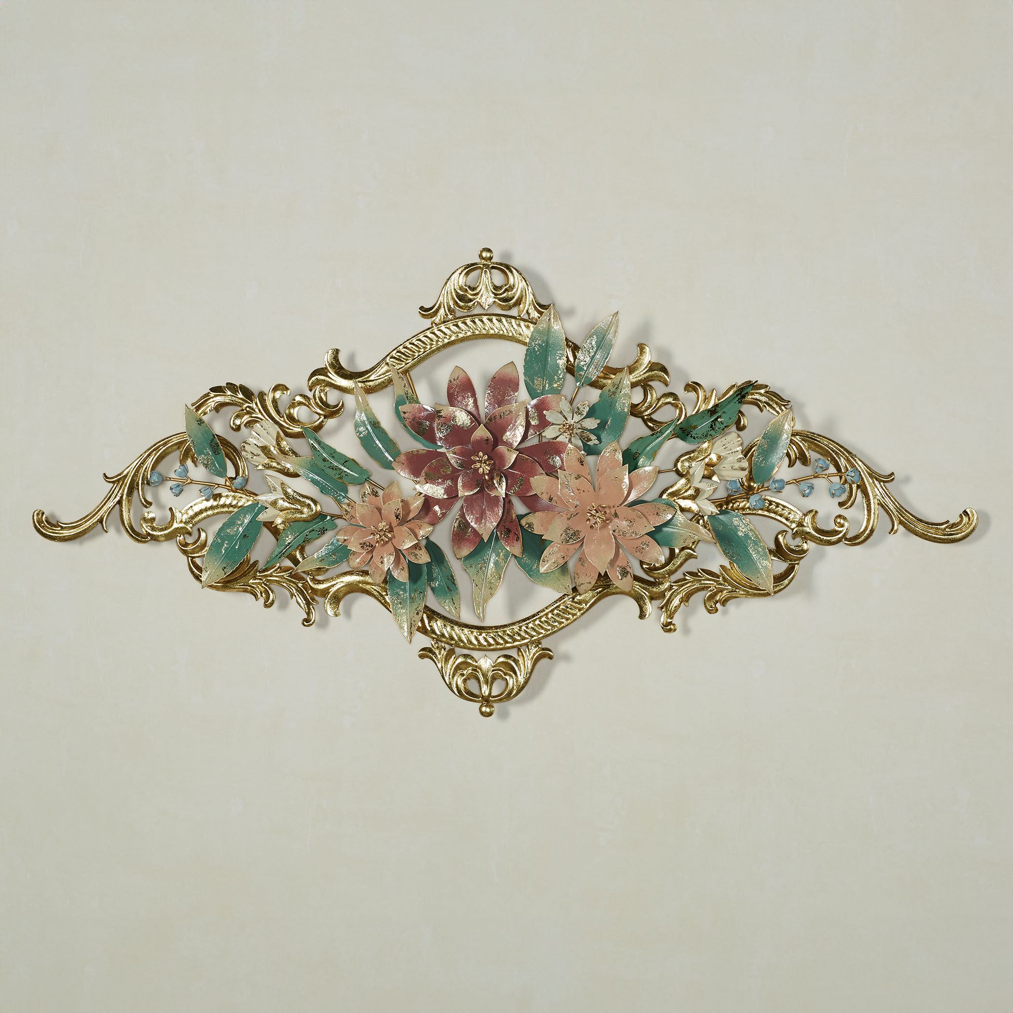 Flowers blossom with a royal sweetness on the Abylissa Floral Wall Art. This metal wall art features graceful blooms, leaves, and pressed swirling accents beautifully hand-finished using alcohol ink and gold leafing processes. Colors include pastel shades of mauve, coral, light blue, green, and gold. Floral wall art measures 39"Wx2.5"Dx19"H.