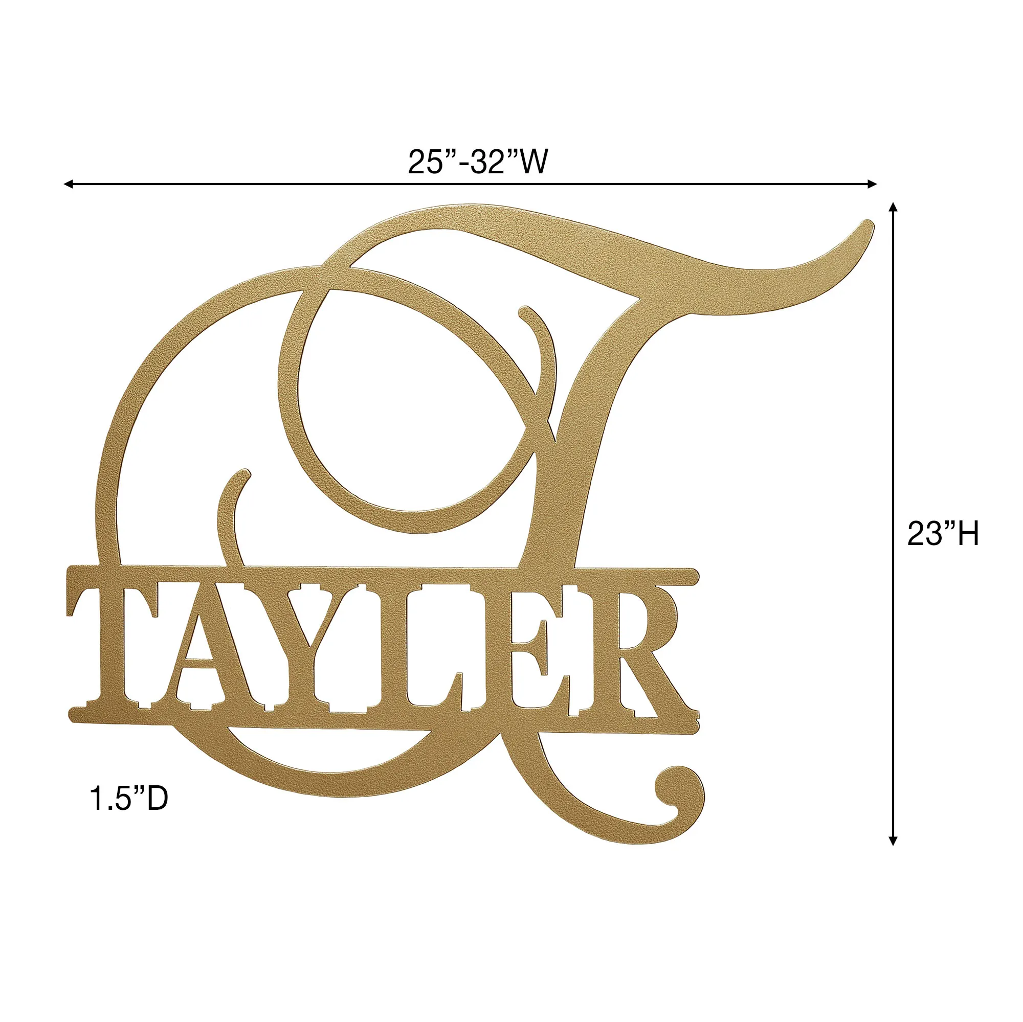 Splendidly display your family name and initial with the Accord Gold Personalized Wall Art Sign. Handcrafted of precision-cut 14-gauge steel, this wall art sign, designed by JasonW Studios(R), has a powder-coat finish that is UV-, weather-, and tarnish-resistant. The personalization is in capital letters, while the initial is in large script. A hyphen counts as a character. Letters are uppercase with the exception of names with a prefix. In those cases, the prefix will be uppercase and lowercase, like MacDONALD. This personalized metal wall art sign may be used indoors or outdoors year round. Measures approx. 25"W-32"Wx1.5"Dx23"H.