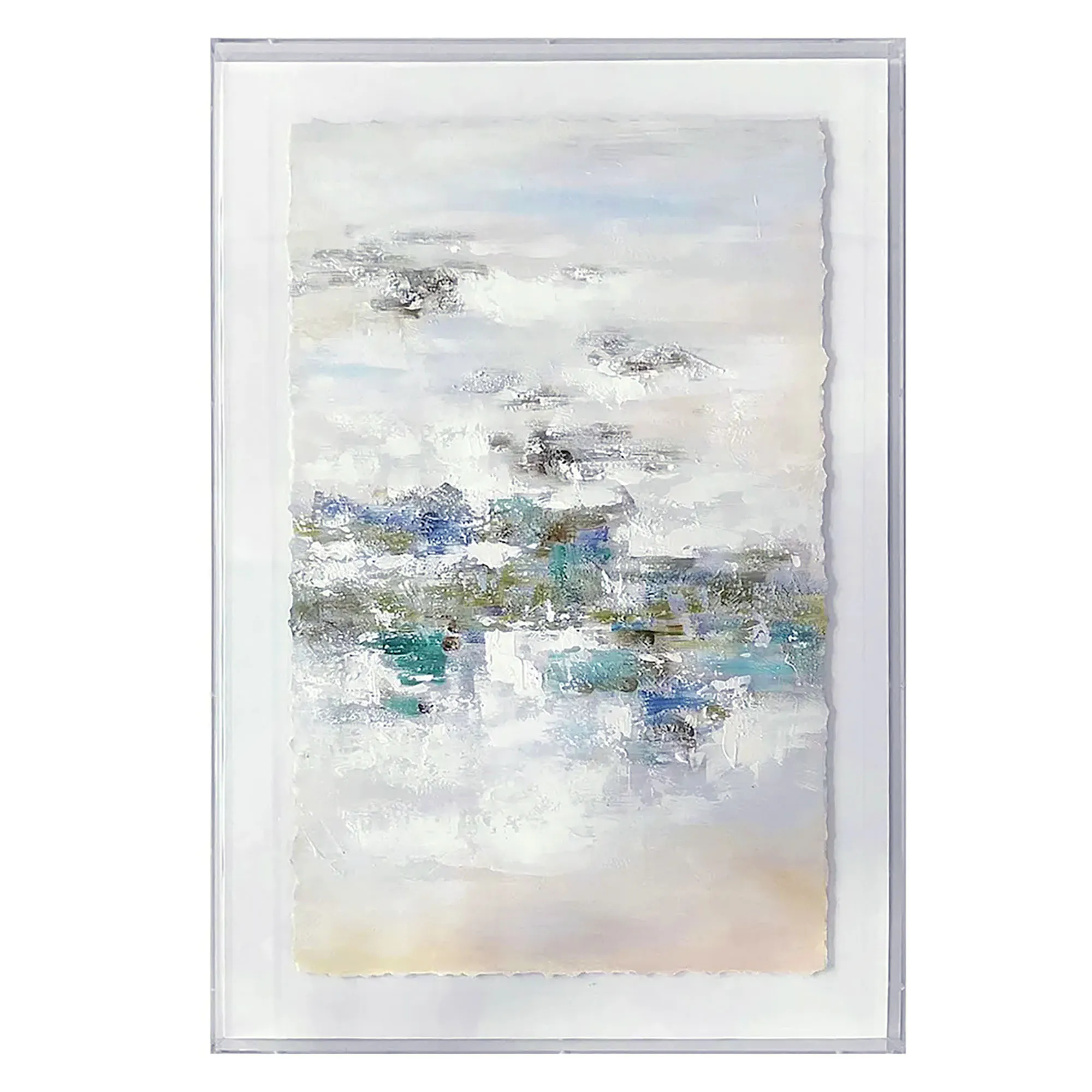 With a gallery-quality presentation, the Adair 1 Acrylic Shadowbox Wall Art showcases artistic flair. With a hand-finished abstract style, cool tones of blue, green, aqua, white, beige, and gray fill a deckle-edged paper canvas. A white matte-like background makes the artwork pop, while the crystal clear acrylic shadowbox frame provides pristine protection. Overall, the wall art measures 24"Wx2"Dx36"H.