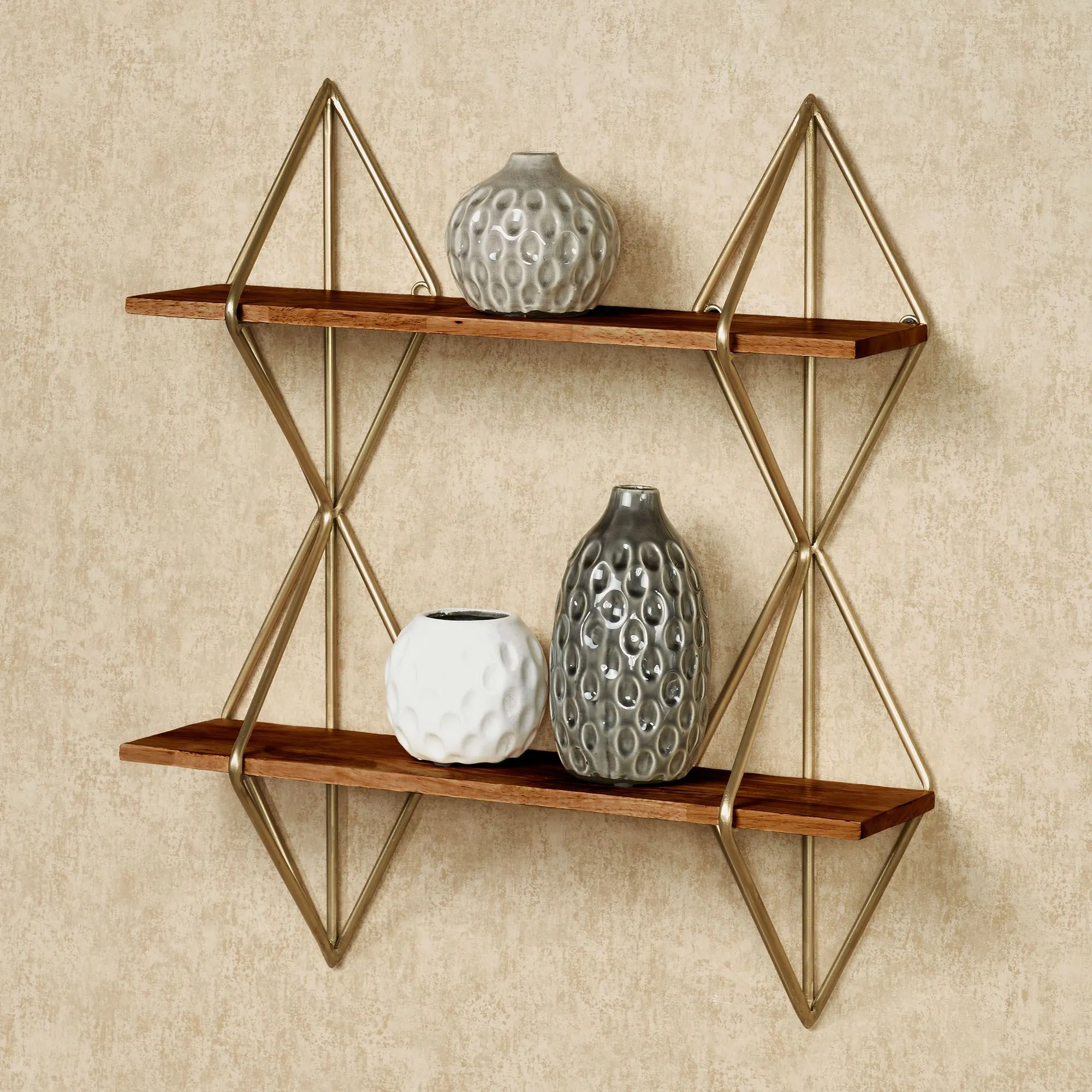 Show off items on the Addax Wall Shelf with a modern vibe. The metal diamond designs are finished in gold, and the wooden shelves are medium brown. The space between the shelves is 11.5"H. Overall, wall shelf measures 22"Wx6.5"Dx25"H.