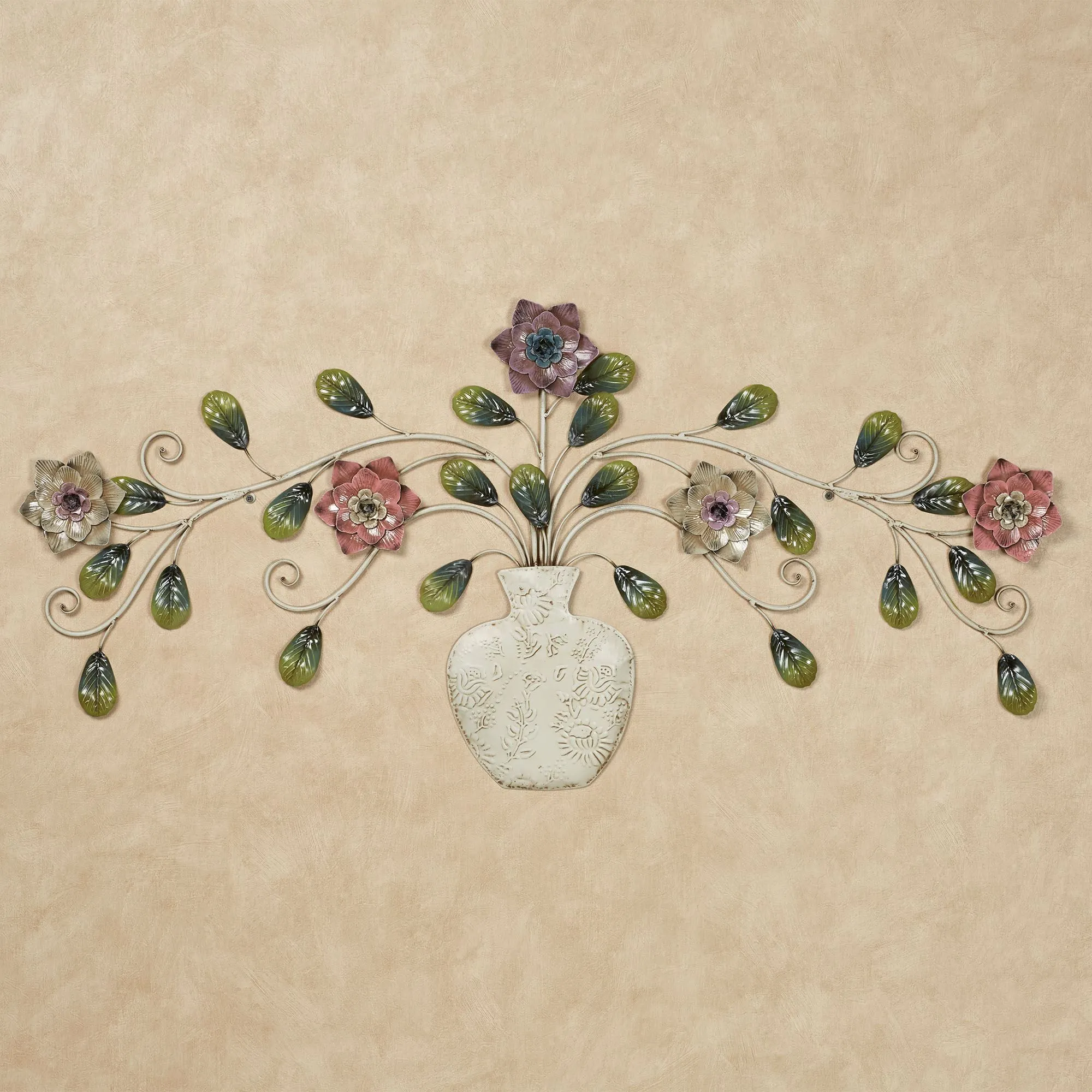 The Adelaide Floral Wall Sculpture blossoms with natural beauty. Made of metal, this wall art sculpture features an ivory vase with ornate details and antiquing that is filled with sprawling flowers and leaves. Colors include shades of lavender, blue, mauve, green, and ivory. Measures 47"Wx1"Dx22"H.