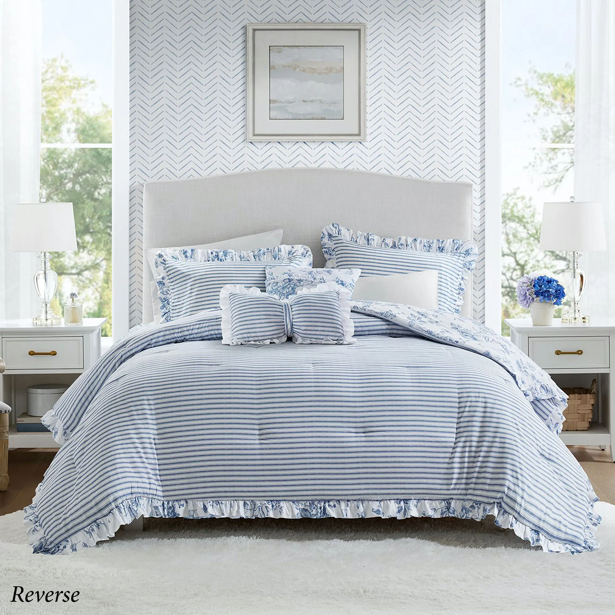 • Comforter and sham(s) reverse to stripes