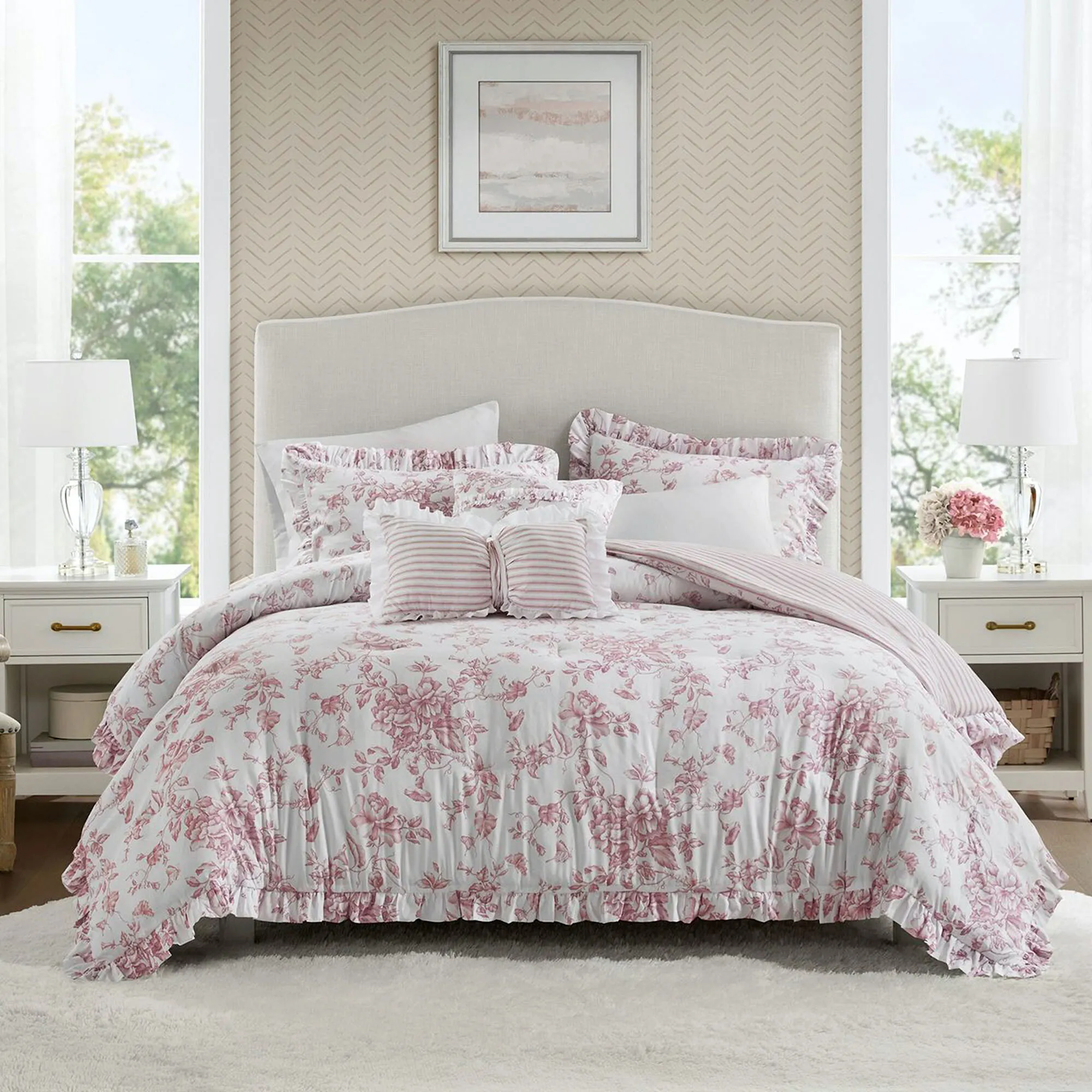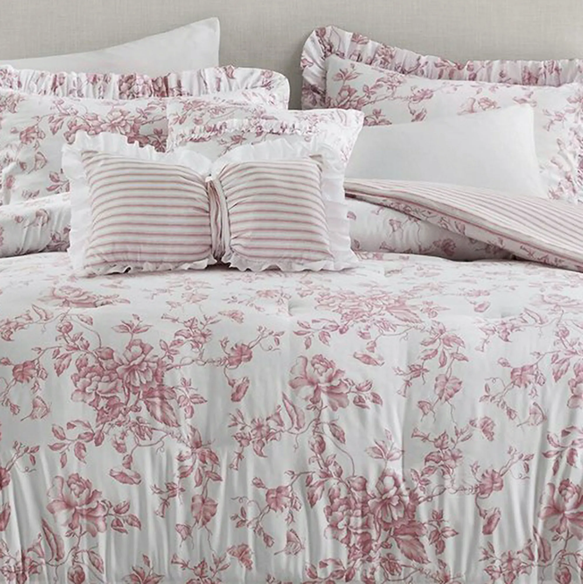 Sweet charm blossoms among the beautiful flowers and ruffles of the Adele Pink Bedding from Madison Park Essentials. The reversible Bed Set includes a comforter, sham(s), and 2 decorative pillows. Patterned in crisp white and a soft solid pink hue, the polyester microfiber bedding features trailing vines with blooming flowers, pristine leaves, and visiting butterflies. Comforter has a ruffled flange and reverses to stripes. Click on the Details tab to read about the other items. Fill is polyester. Machine washable; spot clean the pillows. Imported.