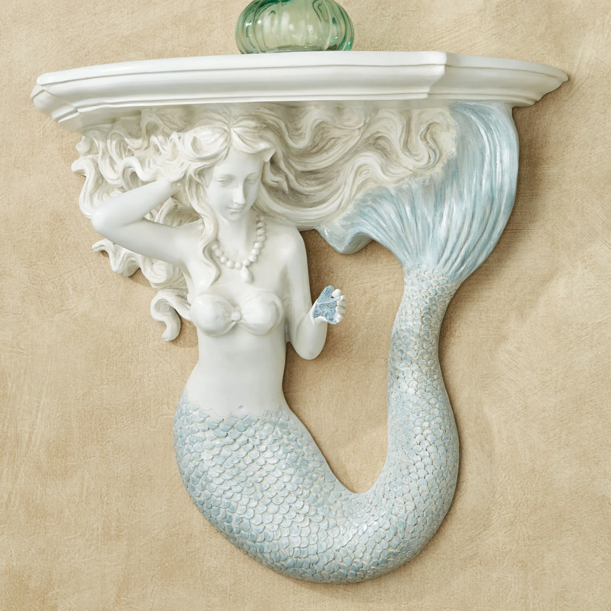 A beauty under the sea and above, the Adellia Mermaid Wall Shelf adds coastal splendor to your space. Finished in antique white with a brown wash, the resin wall accent features the lovely mermaid holding up a beveled shelf. Her flowing locks and handpainted blue tail add wonder to the design. Mermaid wall shelf measures 13"Wx5.5"Dx12"H.