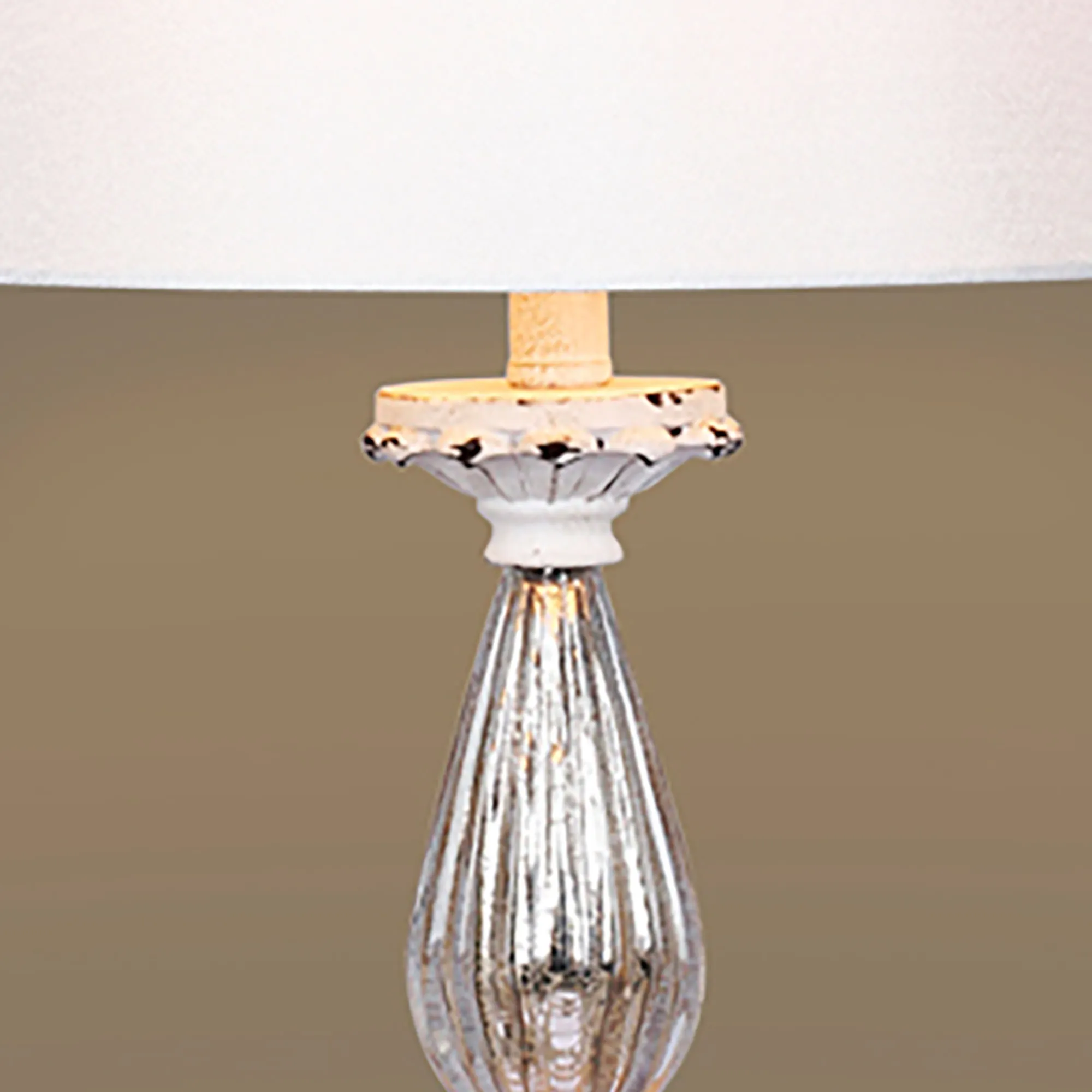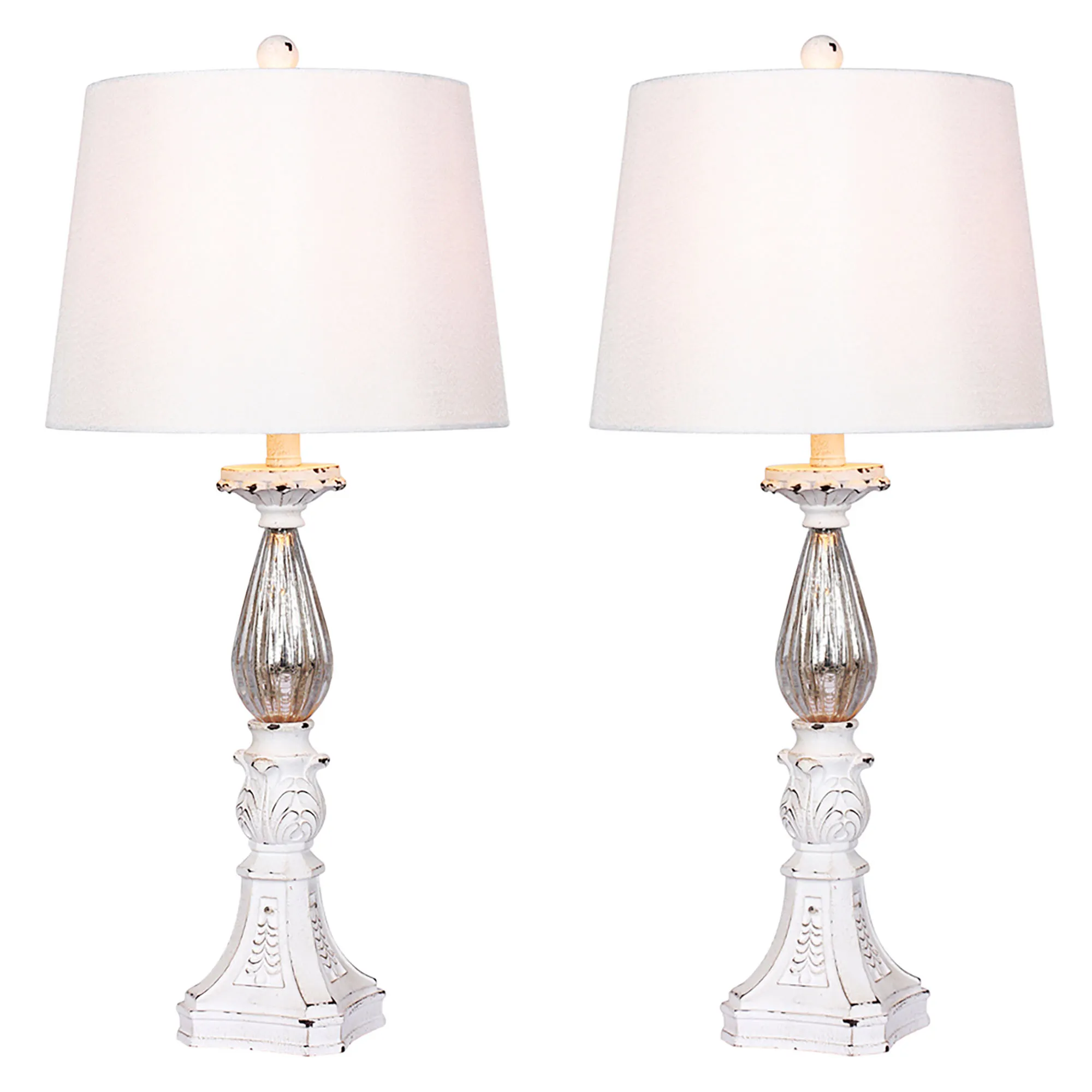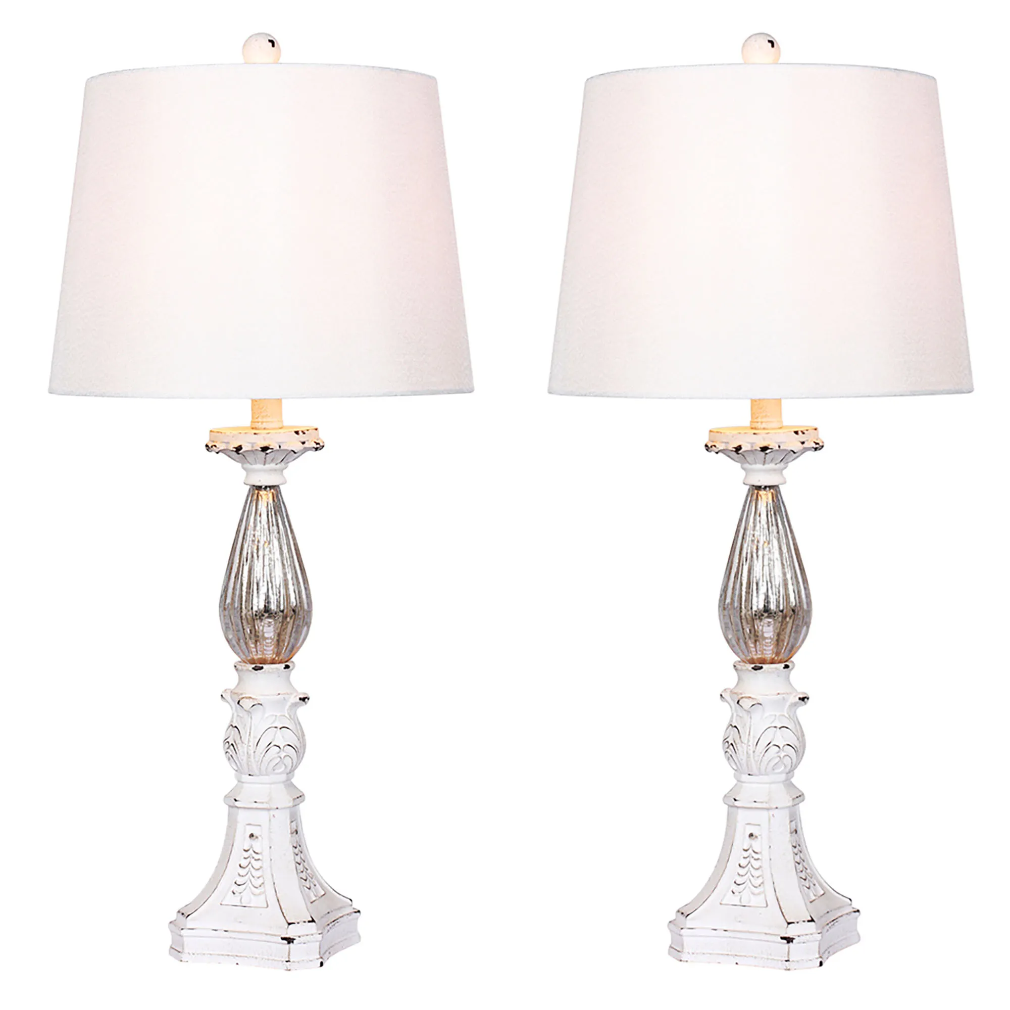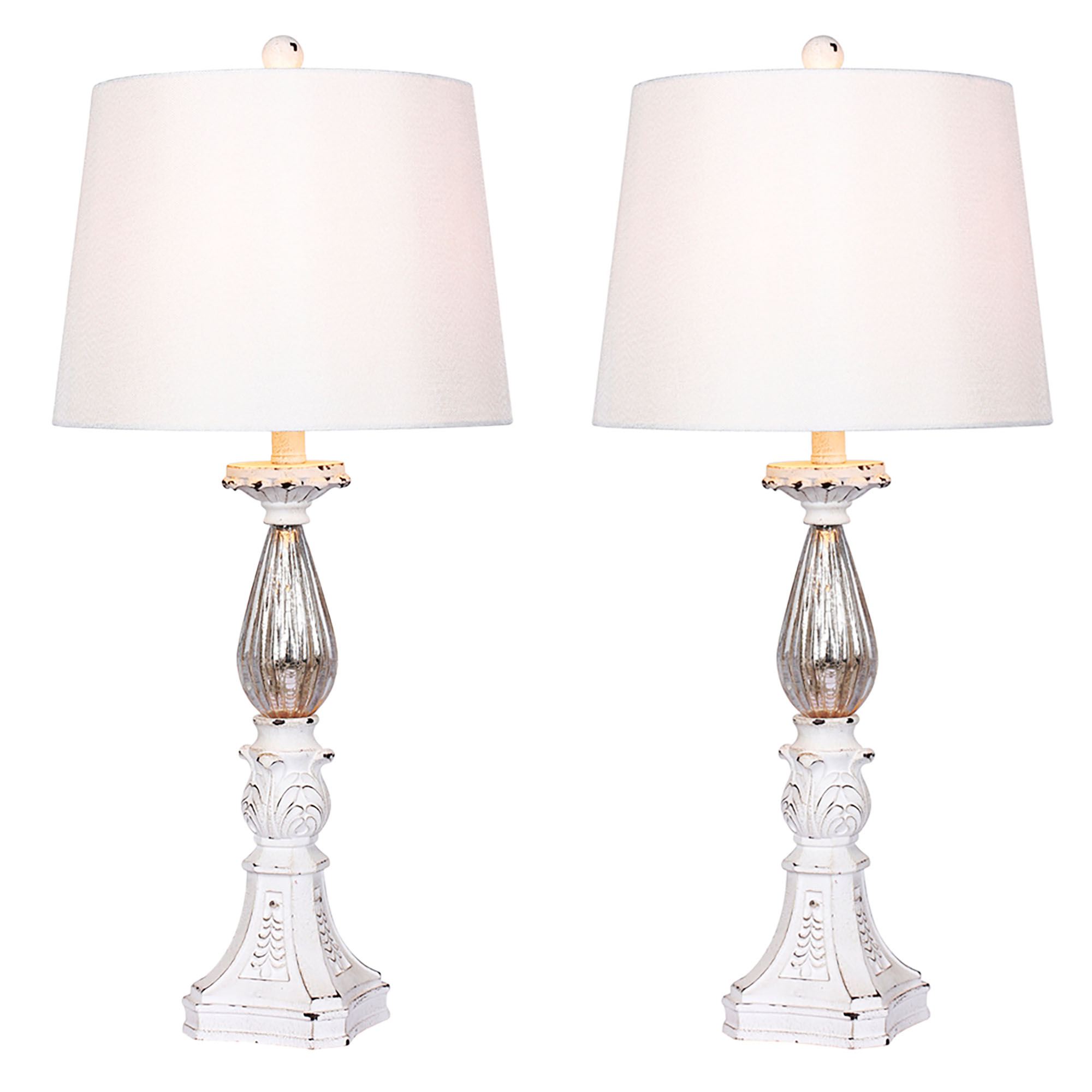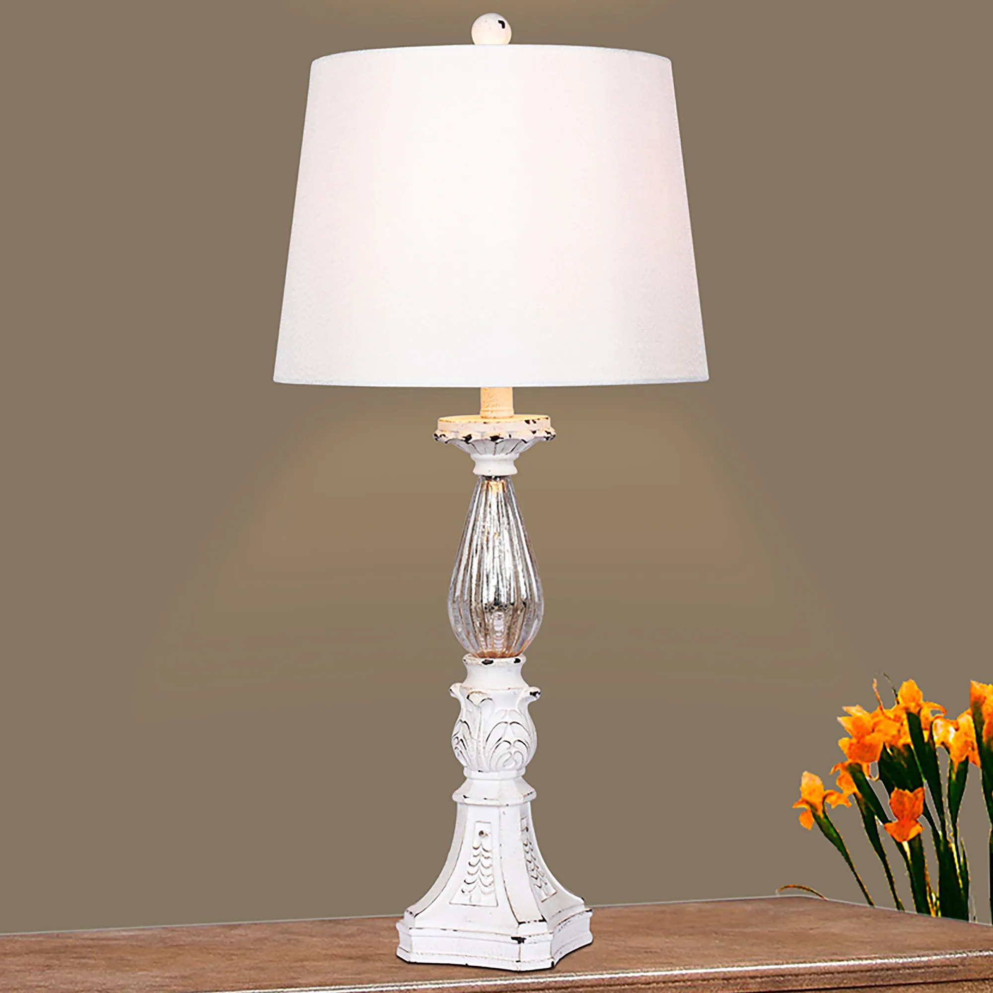 Make a statement with the traditional look of the Adilah Table Lamp. This classy table lamp has a resin candlestick font with filigree designs, a distressed antique white finish, and a clear mercury glass accent. The linen fabric shade is white. UL listed. Requires one 100W max. bulb, not included. Measures 14"dia.x30"H, including the finial.