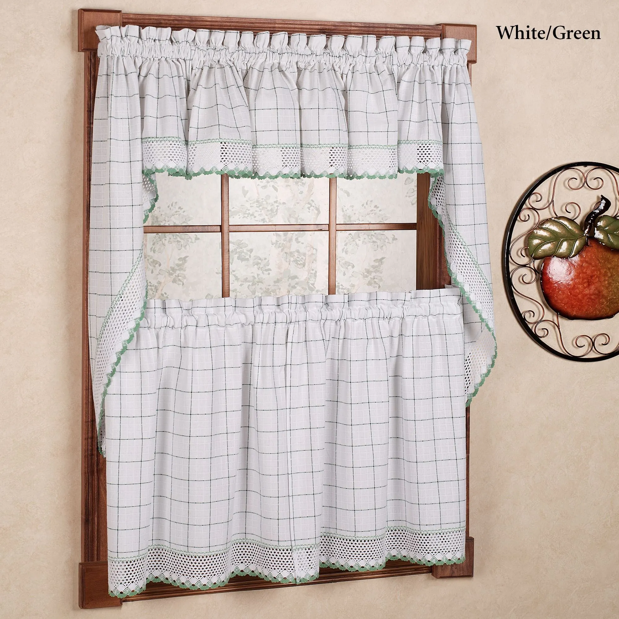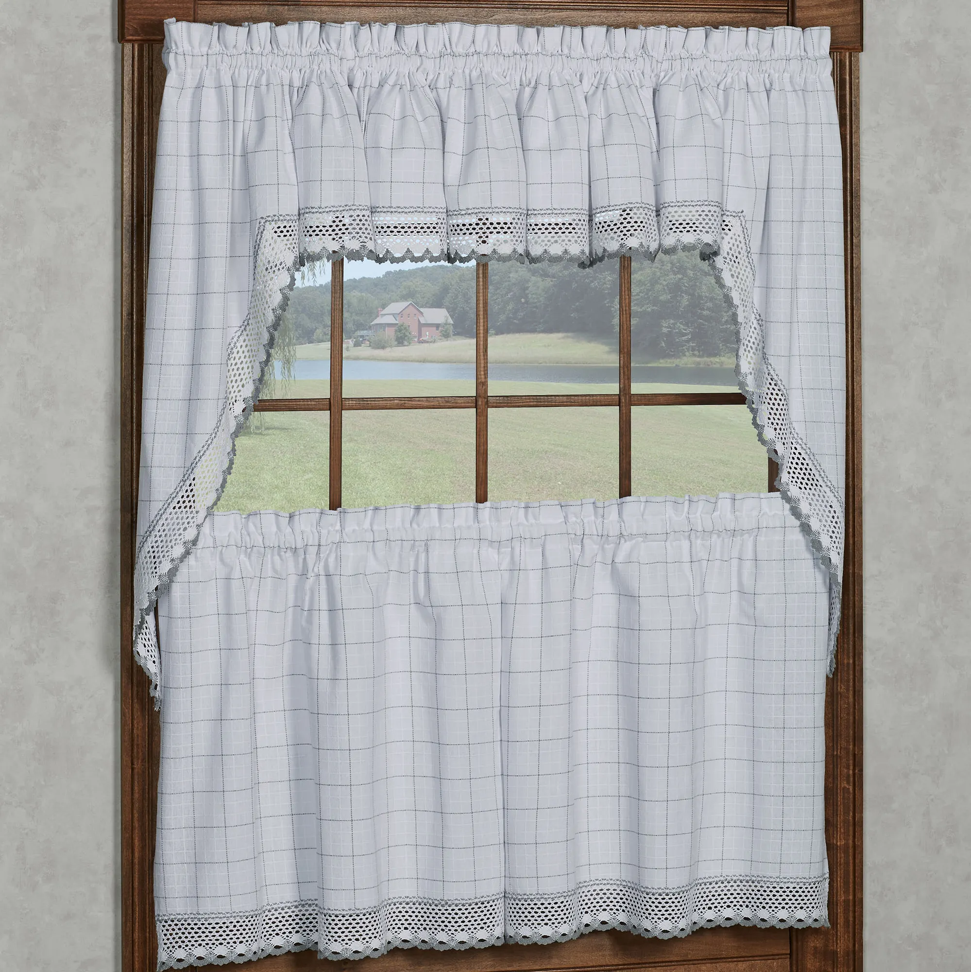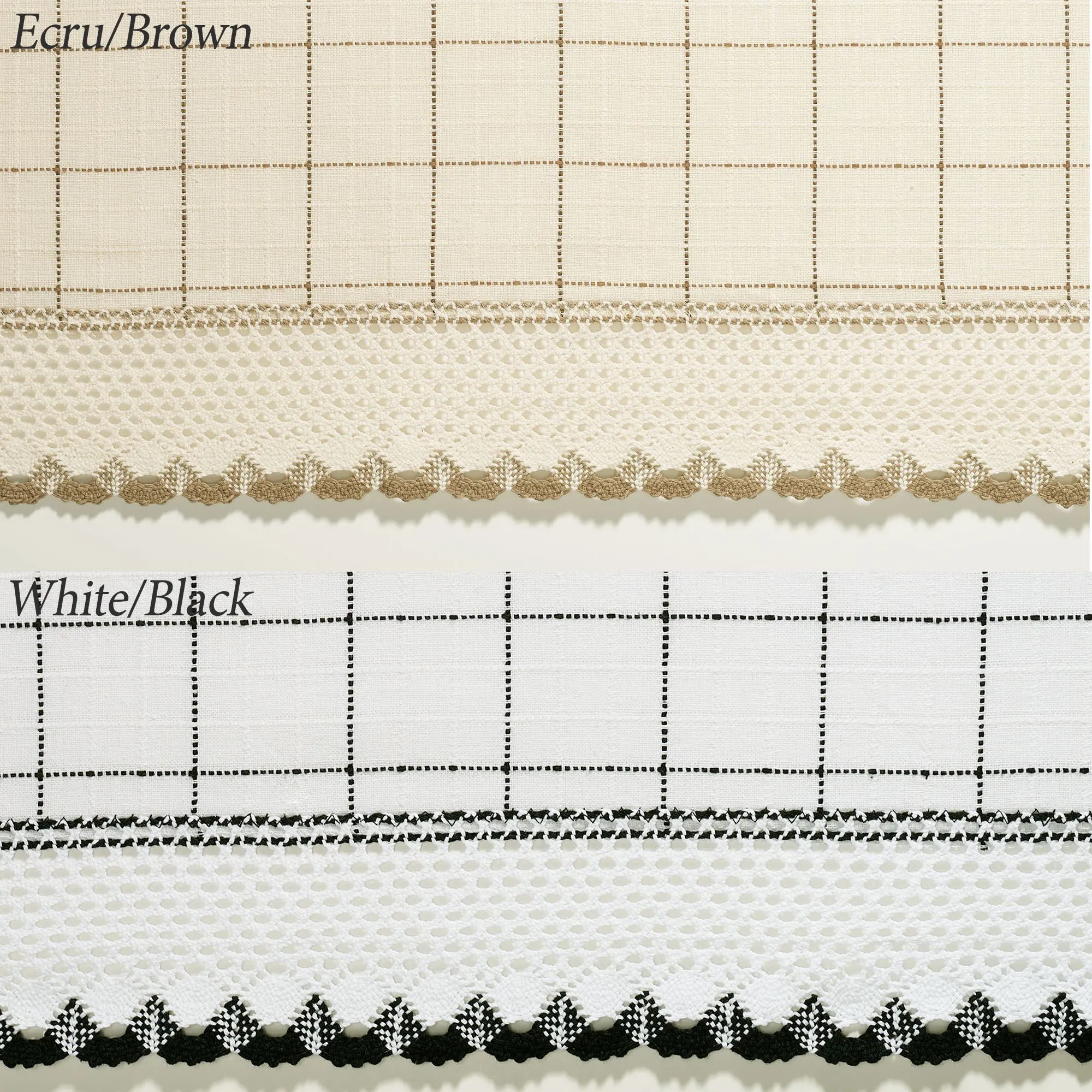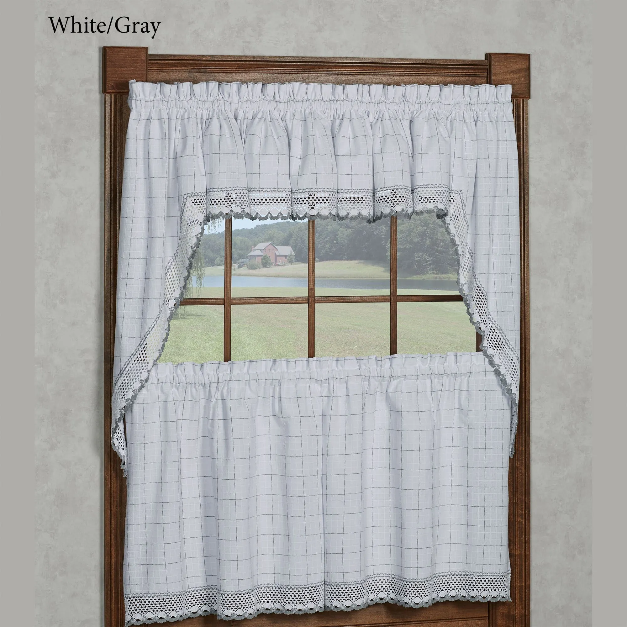 The Adirondack Tier Window Treatment Set will give your room a down-home, country charm with its simple, traditional style. Cotton tiers and valances have a heavyweight, textured base of homespun cloth with a windowpane pattern. Bottom edges are trimmed with a 3" band of crochet. Specify Ecru/Brown, White/Black, White/Blue, White/Gray, or White/Green. Window treatment has a 1.5" rod pocket. Set includes a 60"W tier pair, a 60"Wx38"L swag valance pair, and a 60"Wx12"L tailored valance. Swag Pair and Tailored Valance are also sold individually. Machine washable. Imported.