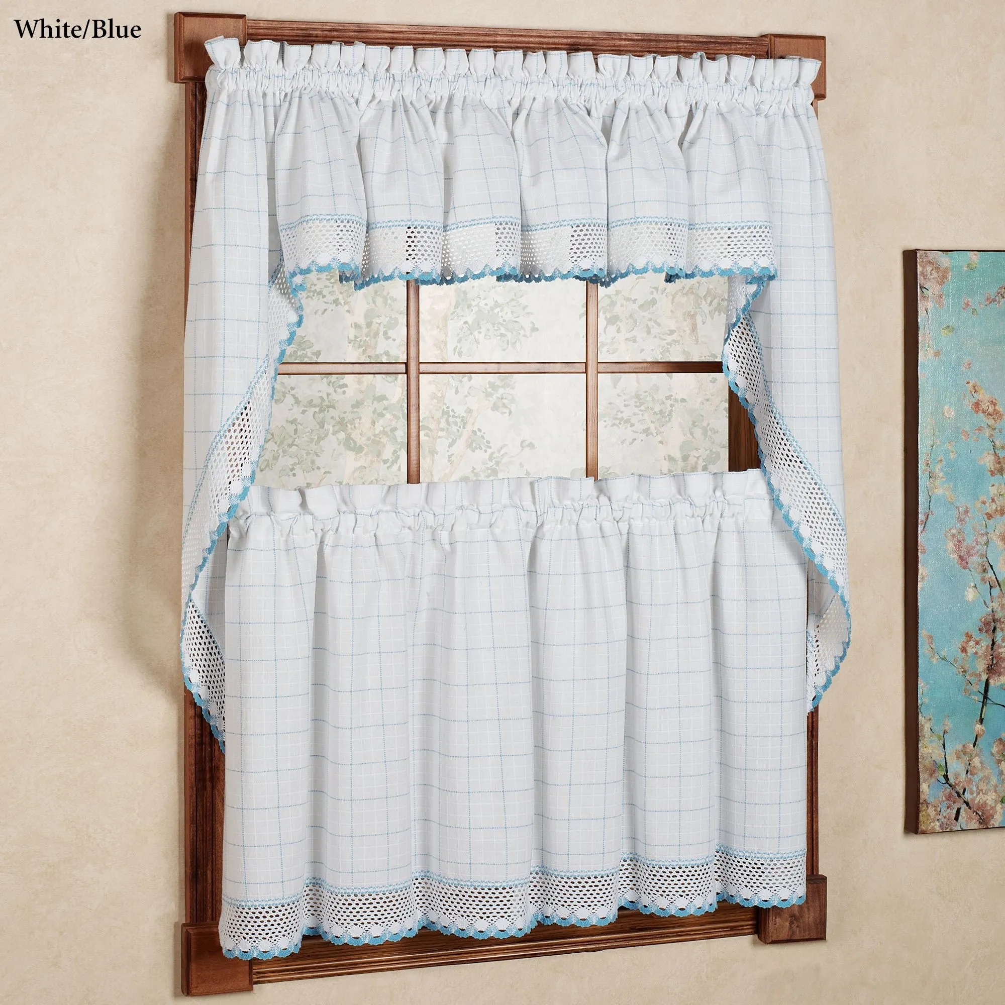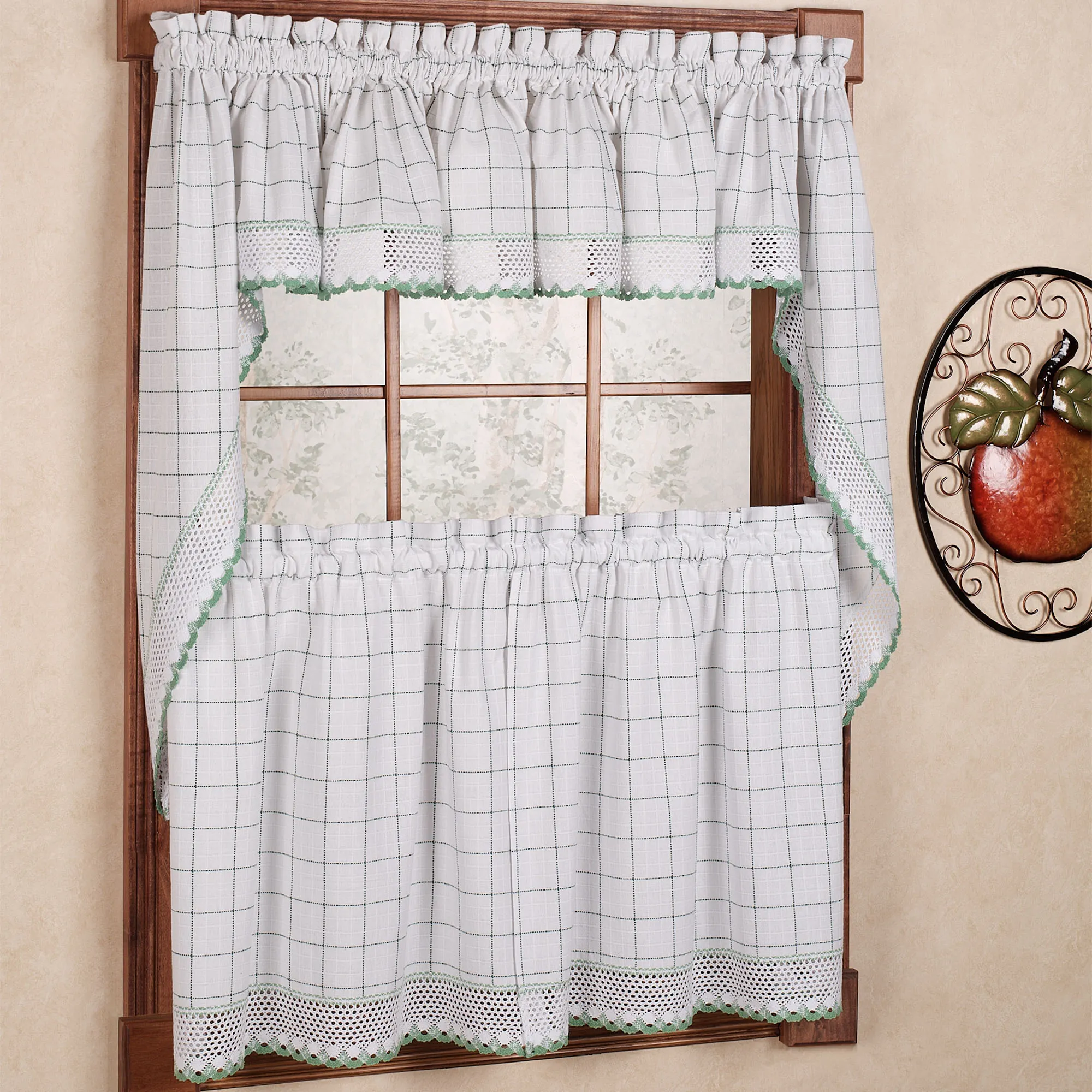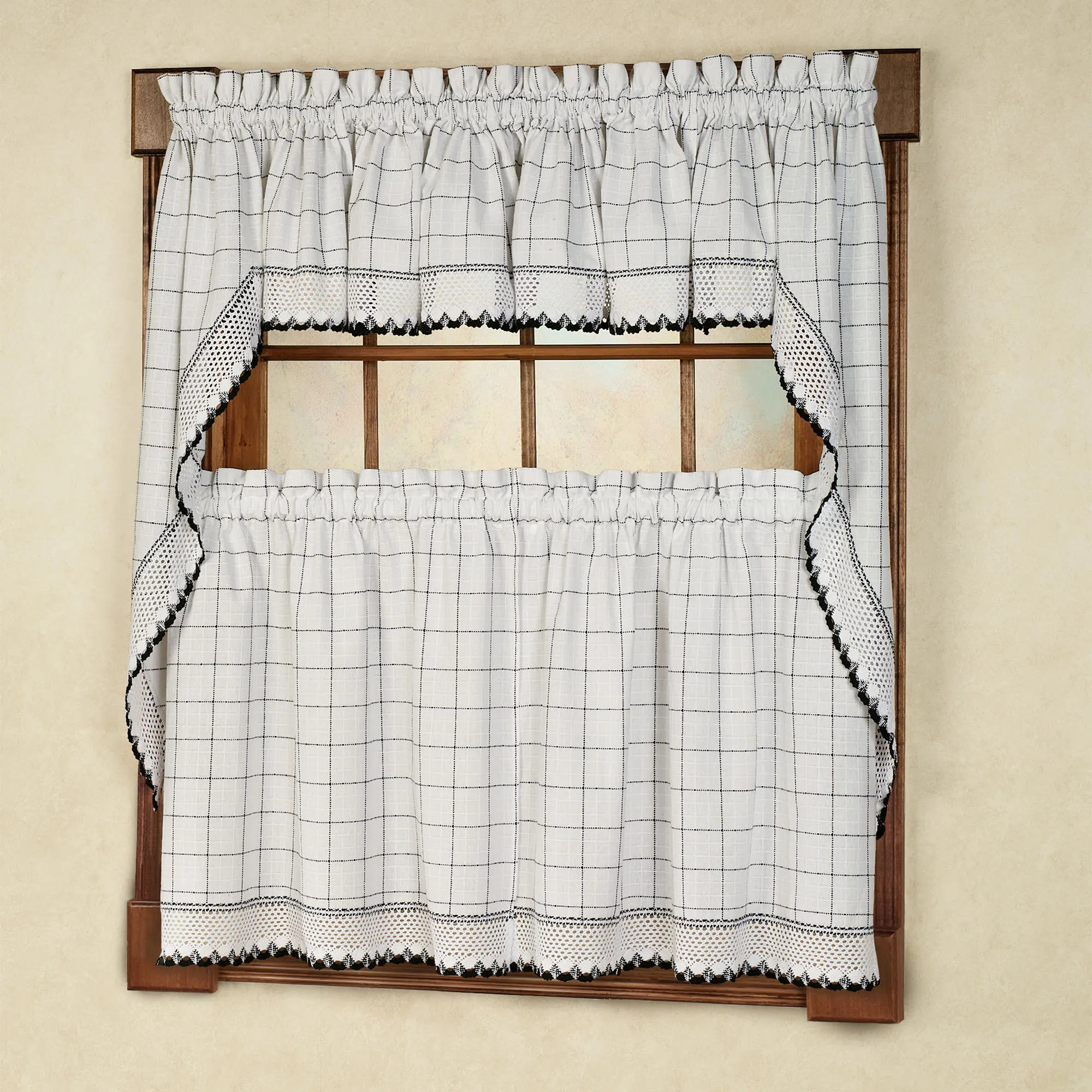 The Adirondack Tier Window Treatment Set will give your room a down-home, country charm with its simple, traditional style. Cotton tiers and valances have a heavyweight, textured base of homespun cloth with a windowpane pattern. Bottom edges are trimmed with a 3" band of crochet. Specify Ecru/Brown, White/Black, White/Blue, White/Gray, or White/Green. Window treatment has a 1.5" rod pocket. Set includes a 60"W tier pair, a 60"Wx38"L swag valance pair, and a 60"Wx12"L tailored valance. Swag Pair and Tailored Valance are also sold individually. Machine washable. Imported.