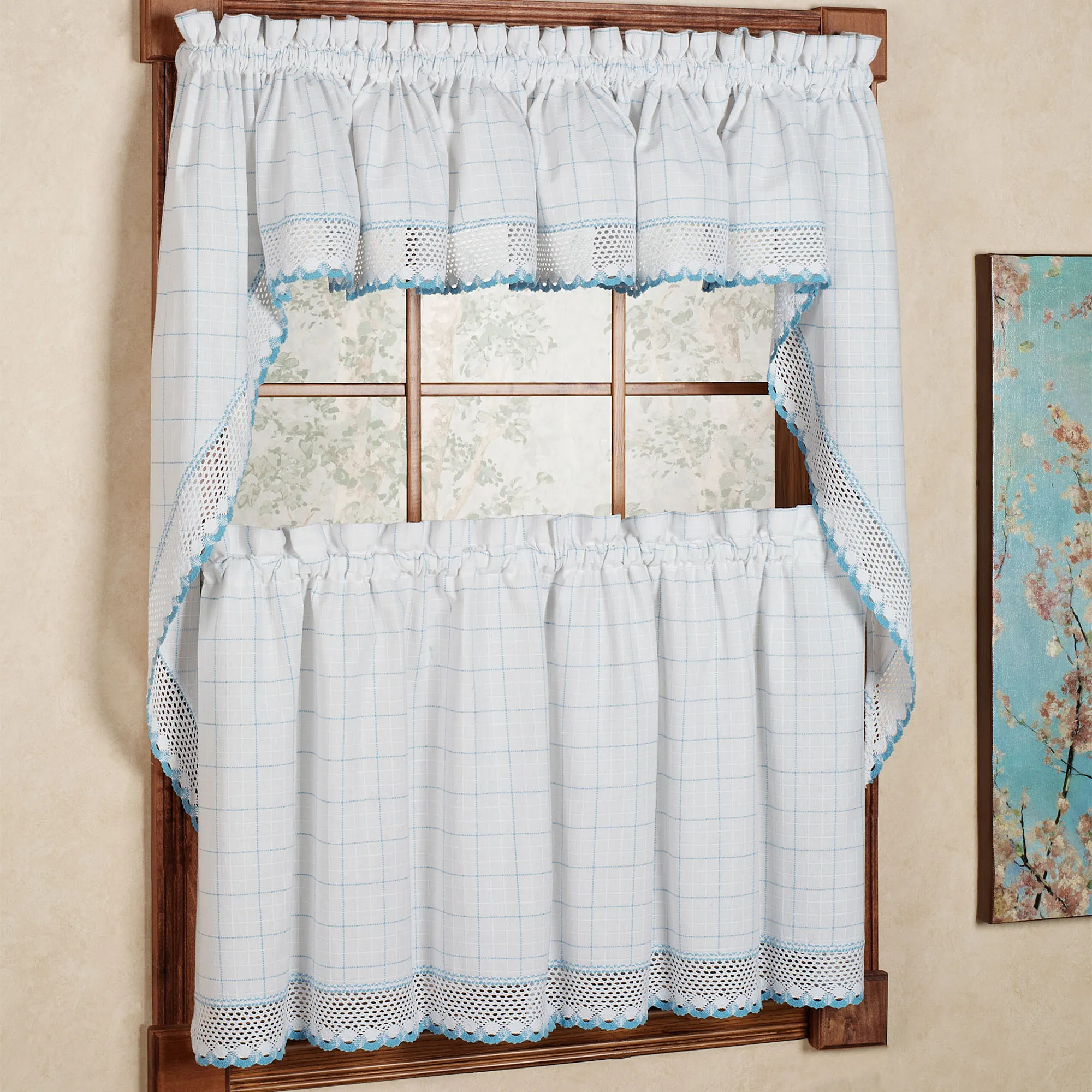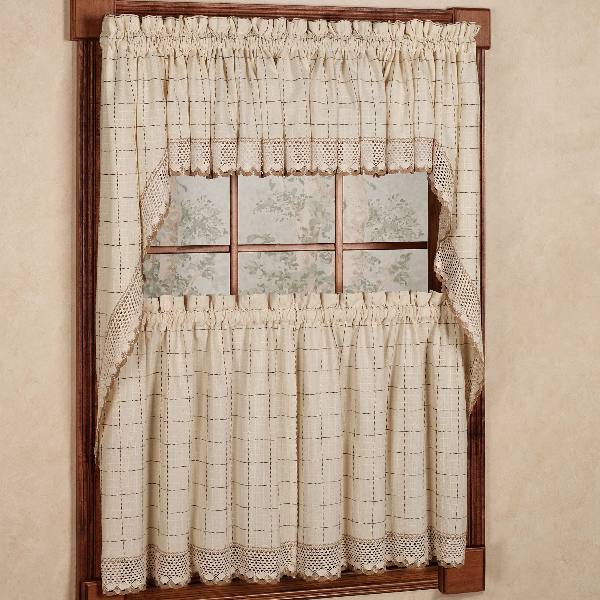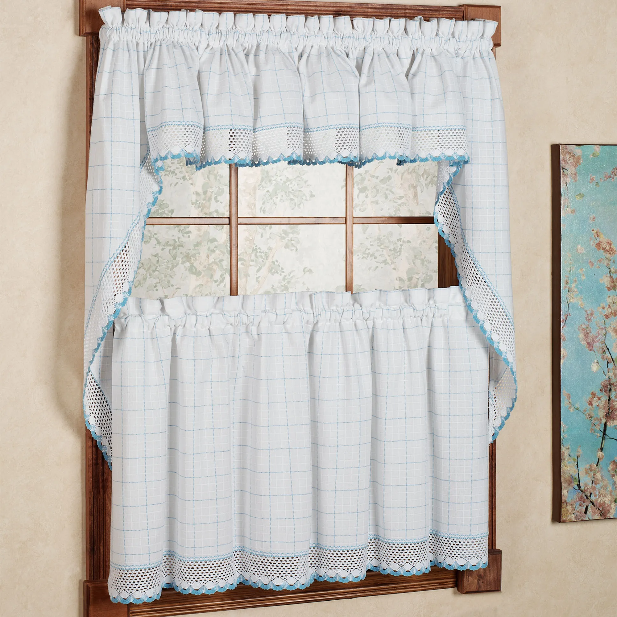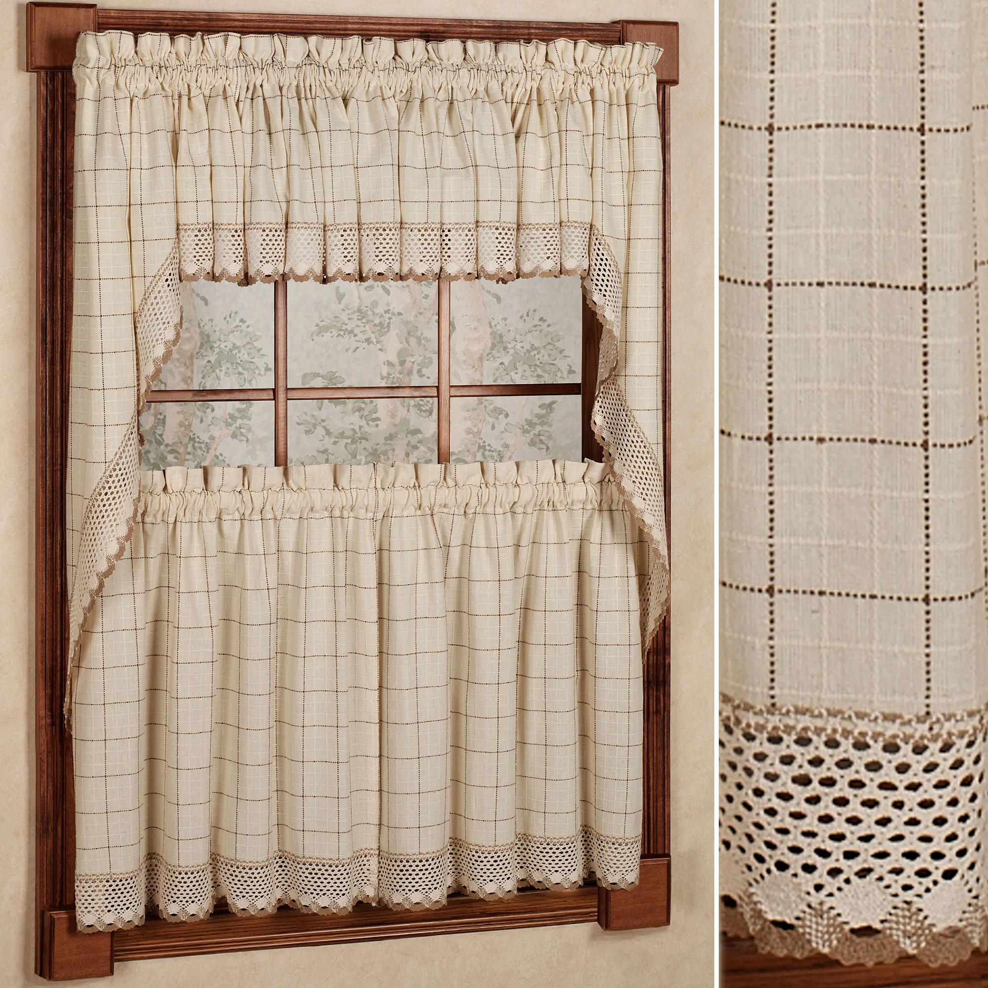 The Adirondack Tier Window Treatment Set will give your room a down-home, country charm with its simple, traditional style. Cotton tiers and valances have a heavyweight, textured base of homespun cloth with a windowpane pattern. Bottom edges are trimmed with a 3" band of crochet. Specify Ecru/Brown, White/Black, White/Blue, White/Gray, or White/Green. Window treatment has a 1.5" rod pocket. Set includes a 60"W tier pair, a 60"Wx38"L swag valance pair, and a 60"Wx12"L tailored valance. Swag Pair and Tailored Valance are also sold individually. Machine washable. Imported.