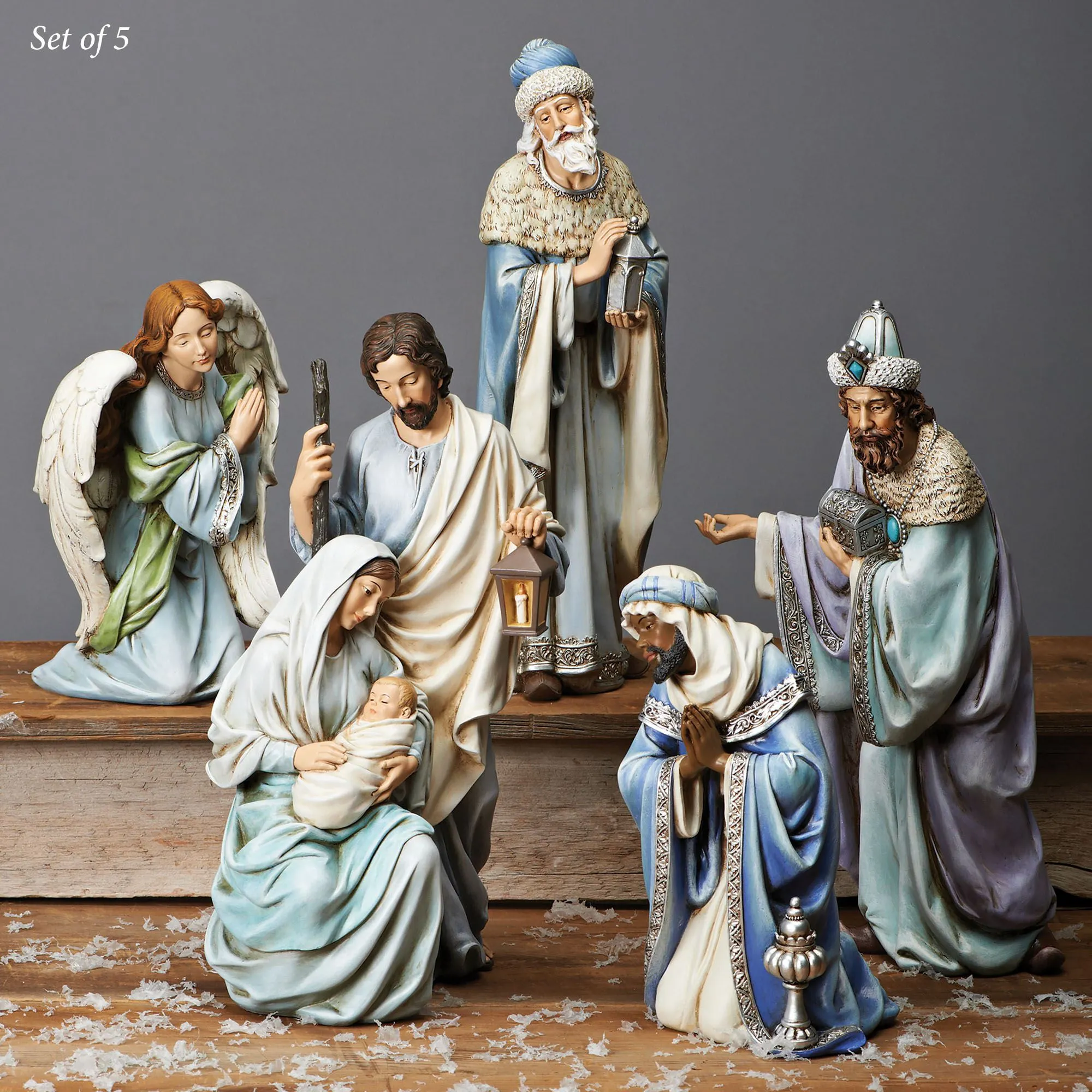 Adoration fills the faces within this charming nativity figurine set. Draped in flowing garments, they take in the holy sight of baby Jesus. From Joseph's Studio(R) exclusively by Roman, Inc., each resin and stone mix figurine features natural pastel hues. Joseph and Mary holding baby Jesus is 8"Wx7"Dx14.5"H. The standing Wise Man with his arm out is 7"Wx6"Dx15"H; the other standing Wise Man is 5"Wx5"Dx15"H. The kneeling Wise Man is 5.5"Wx5"Dx10"H. Angel is 7"Wx4"Dx9.5"H. Set weighs approx. 12 lbs.