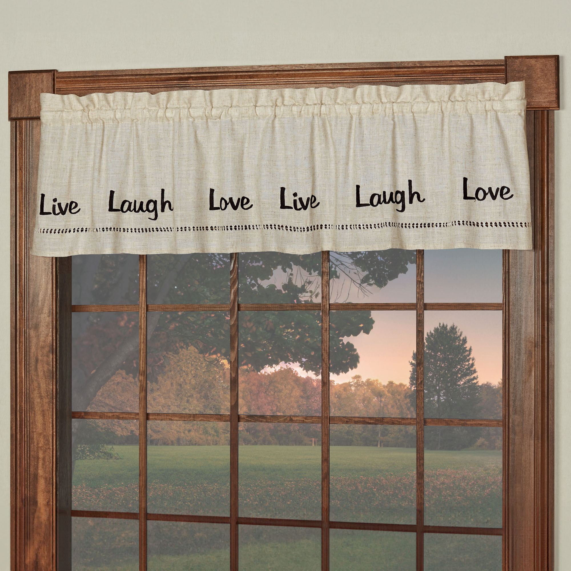The Adoring Window Valance displays a sentiment to live by. This polyester linen valance features the embroidered words "Live Laugh Love" in black along with a handcrafted pull-stitch hem. Valance is 58"Wx14"L; rod pocket is 1.5". Machine wash; follow the manufacturer's instructions. Imported.