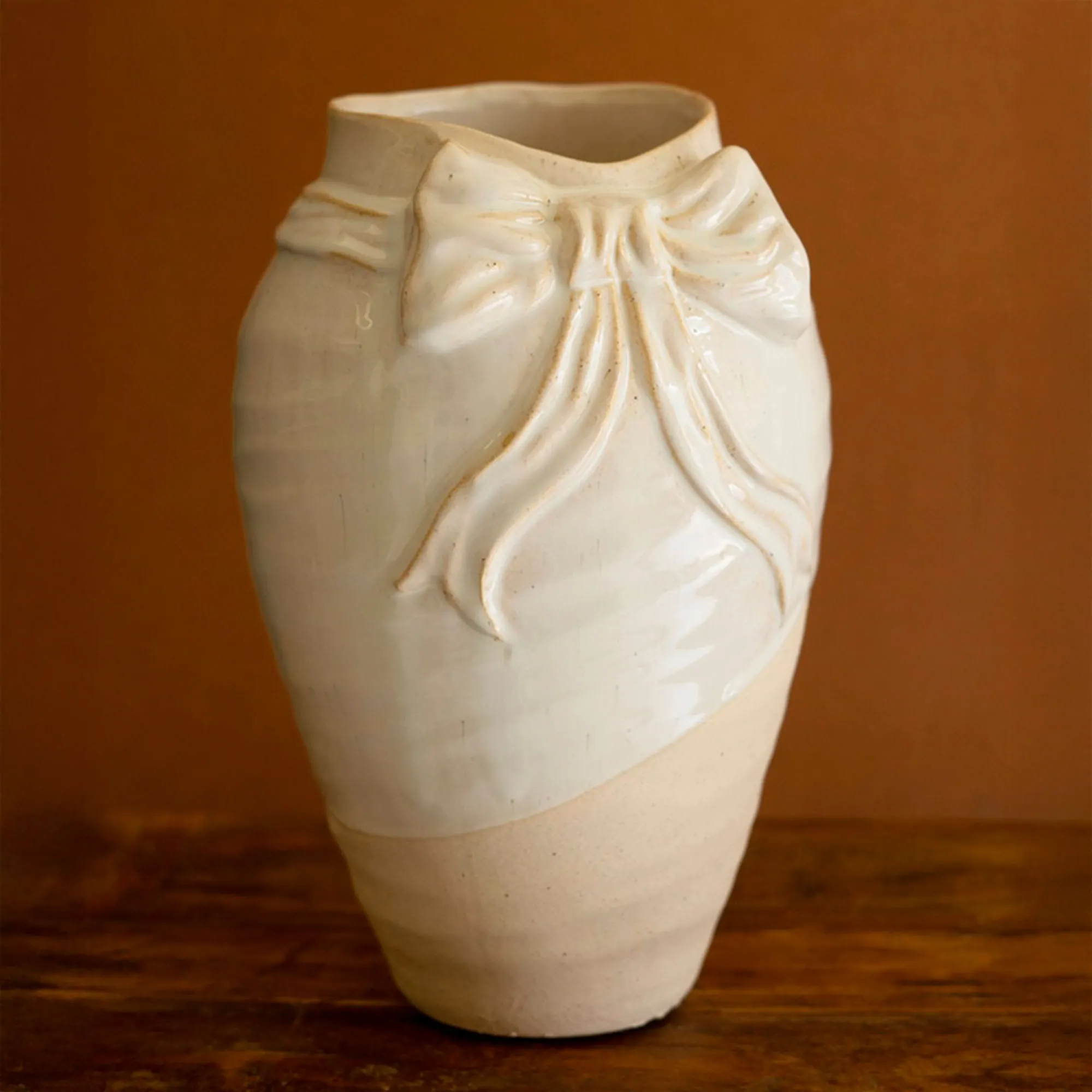 • Ceramic vase with a charming bow accent