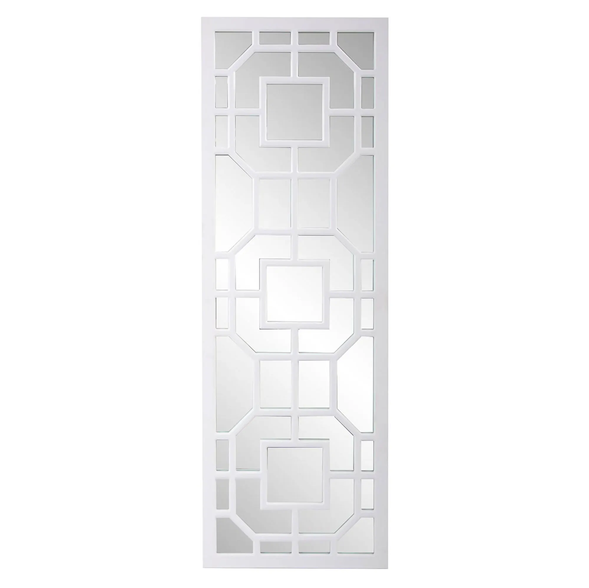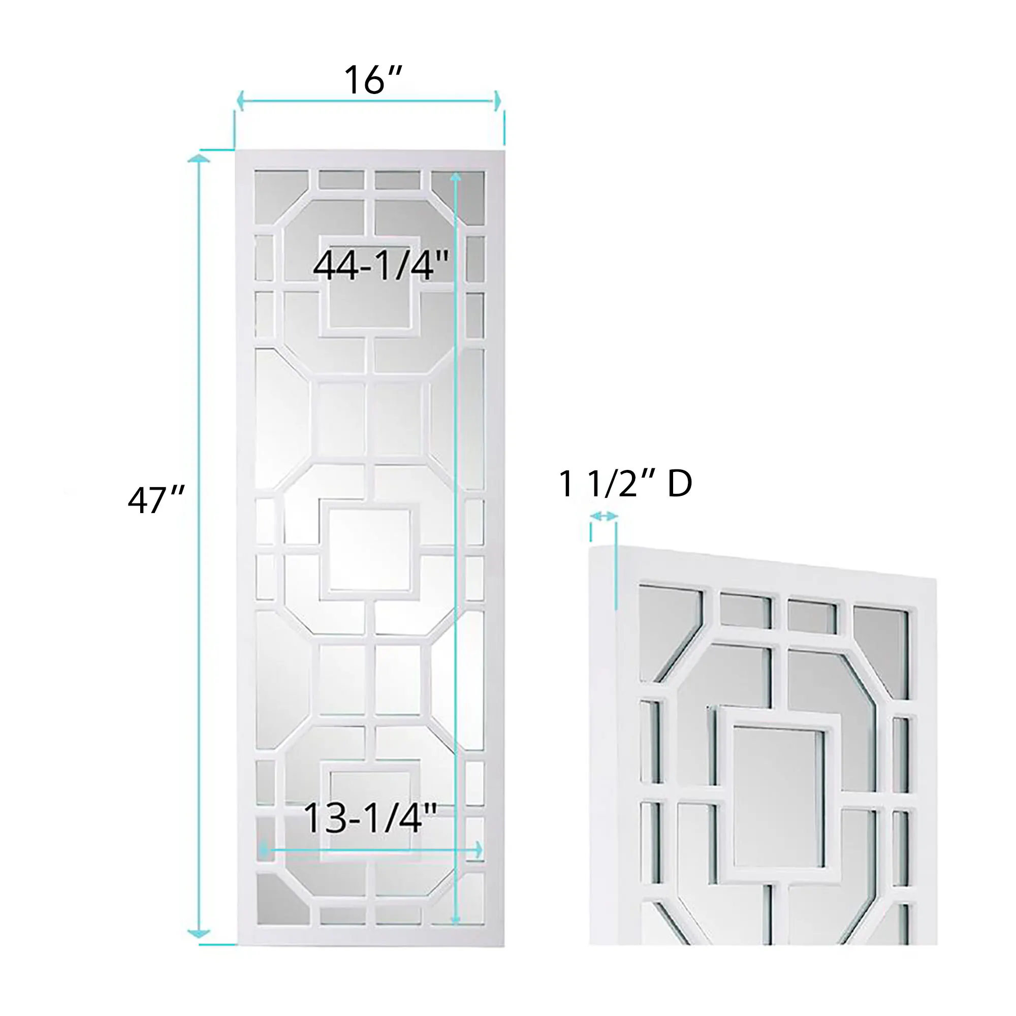 Geometric outlines pattern the Adrianna Wall Mirror Panel with a timeless allure. In a classic finish, the wooden frame and overlay decorate the clear glass mirror and transform the panel with interconnected geometric latticework that complements a variety of decor styles. Wall mirror may hang vertically or horizontally to fit your space. When hanging vertically, the panel wall mirror measures 16"Wx1.5"Dx47"H and weighs approx. 24 lbs.