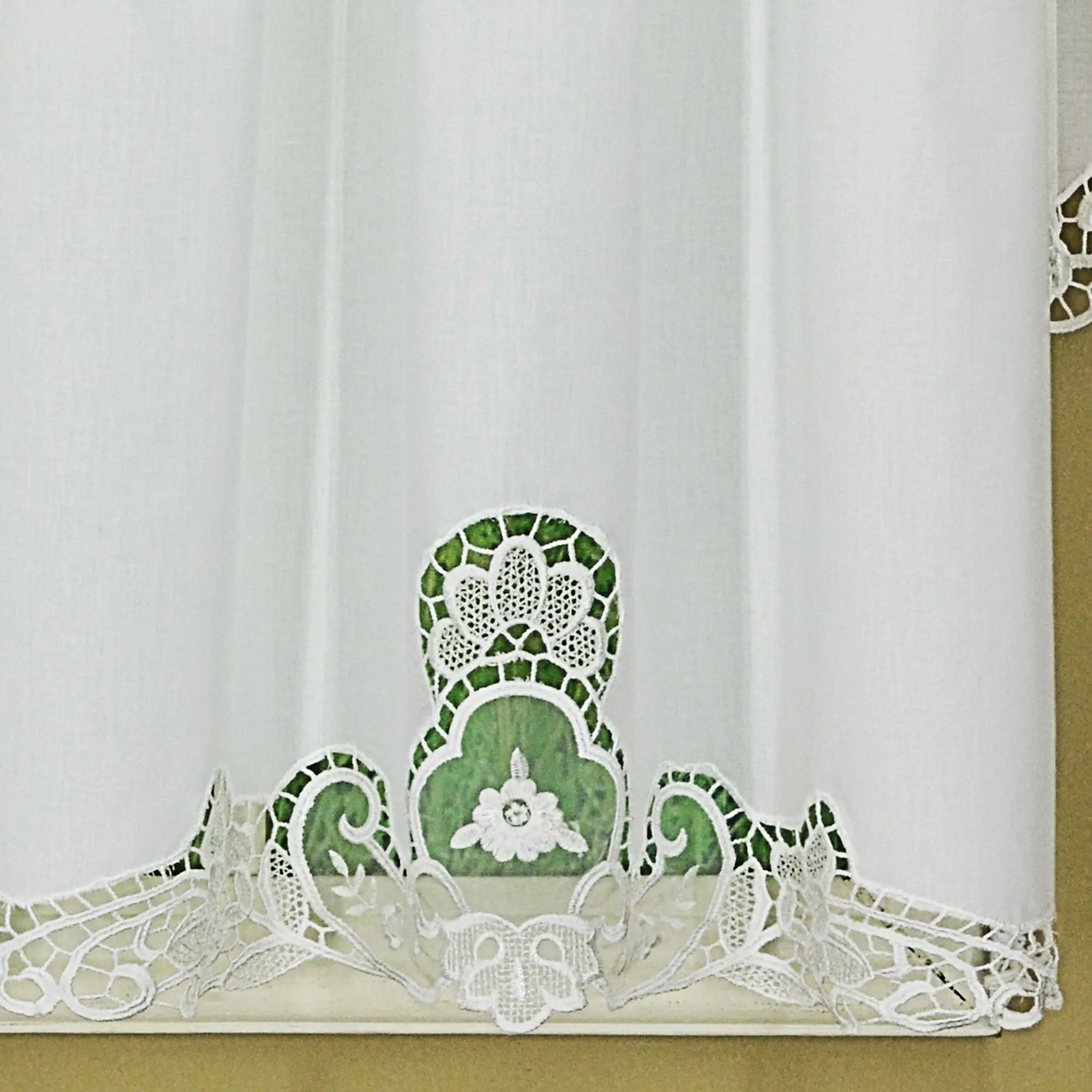 • Window treatment has macrame lace applique embellishments