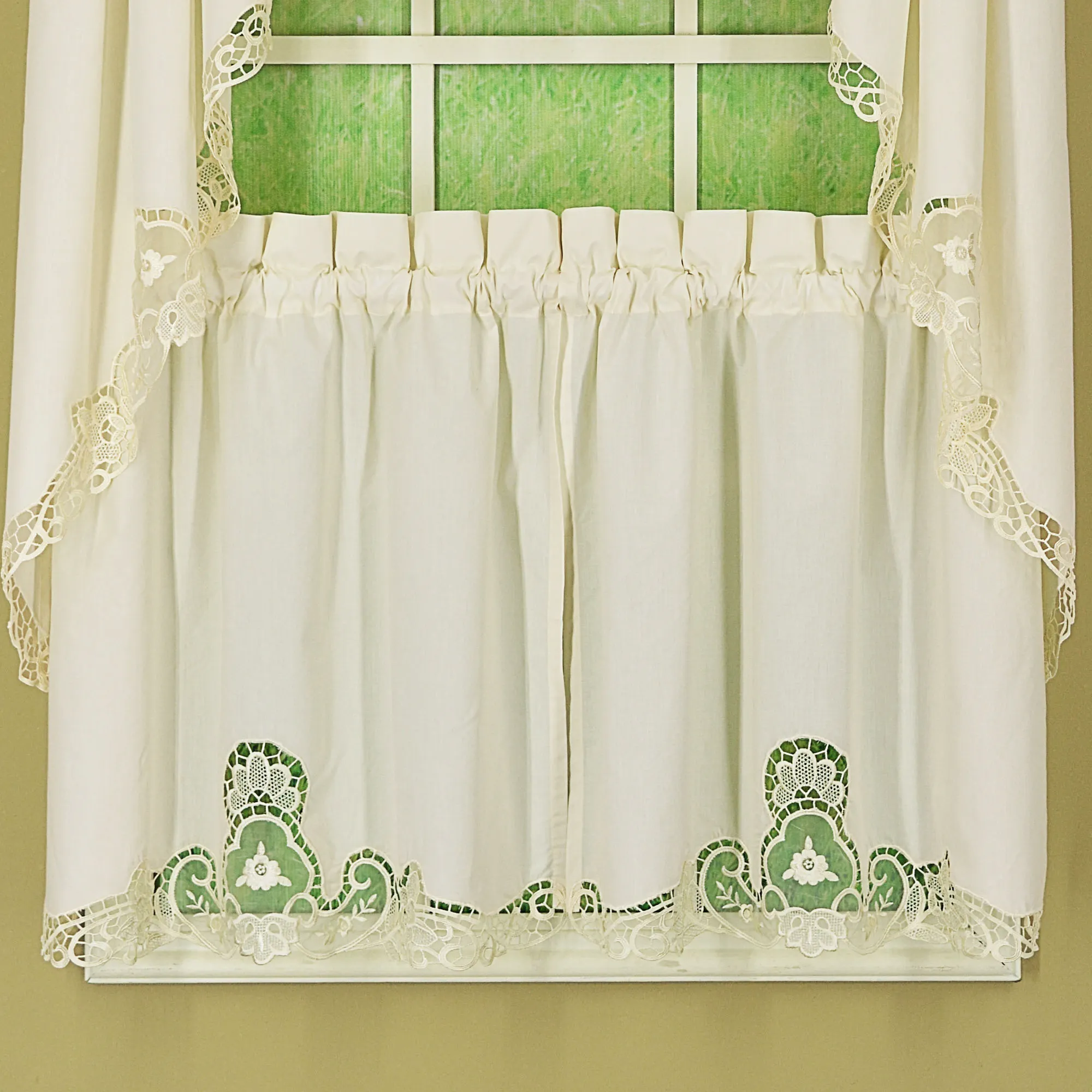Traditional elegance charms the senses from the Adriel Tier Window Treatment. Each solid color, cotton/polyester accent features a macrame lace applique embellishment, flourishing with scrolls, florals, and contour edging. This beautiful detail trims the bottom. Specify Tier Pair, 60"W; Swag Valance Pair, 60"Wx38"L; or Tailored Valance, 60"Wx14"L. Window items have a 2" rod pocket. Machine washable. Imported.