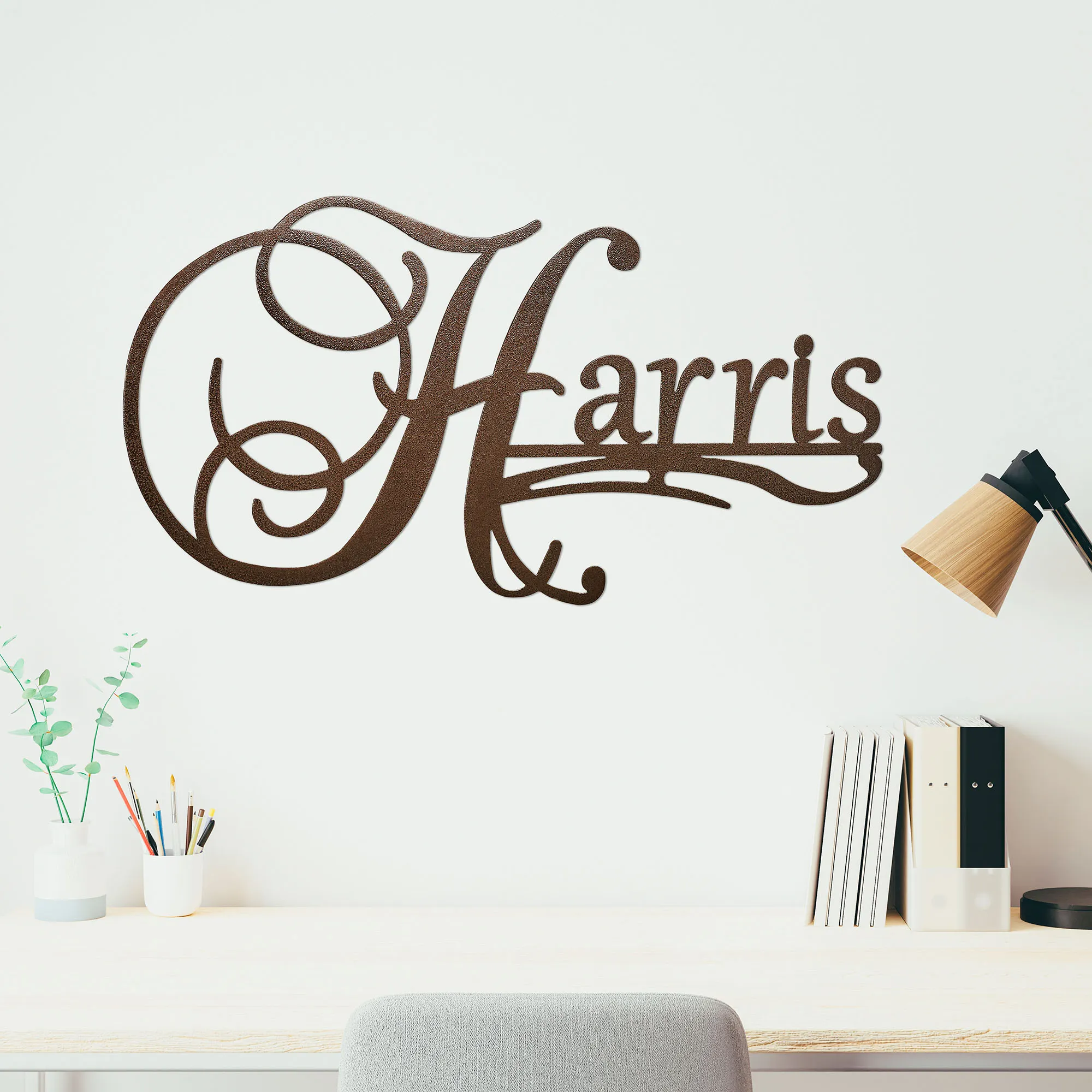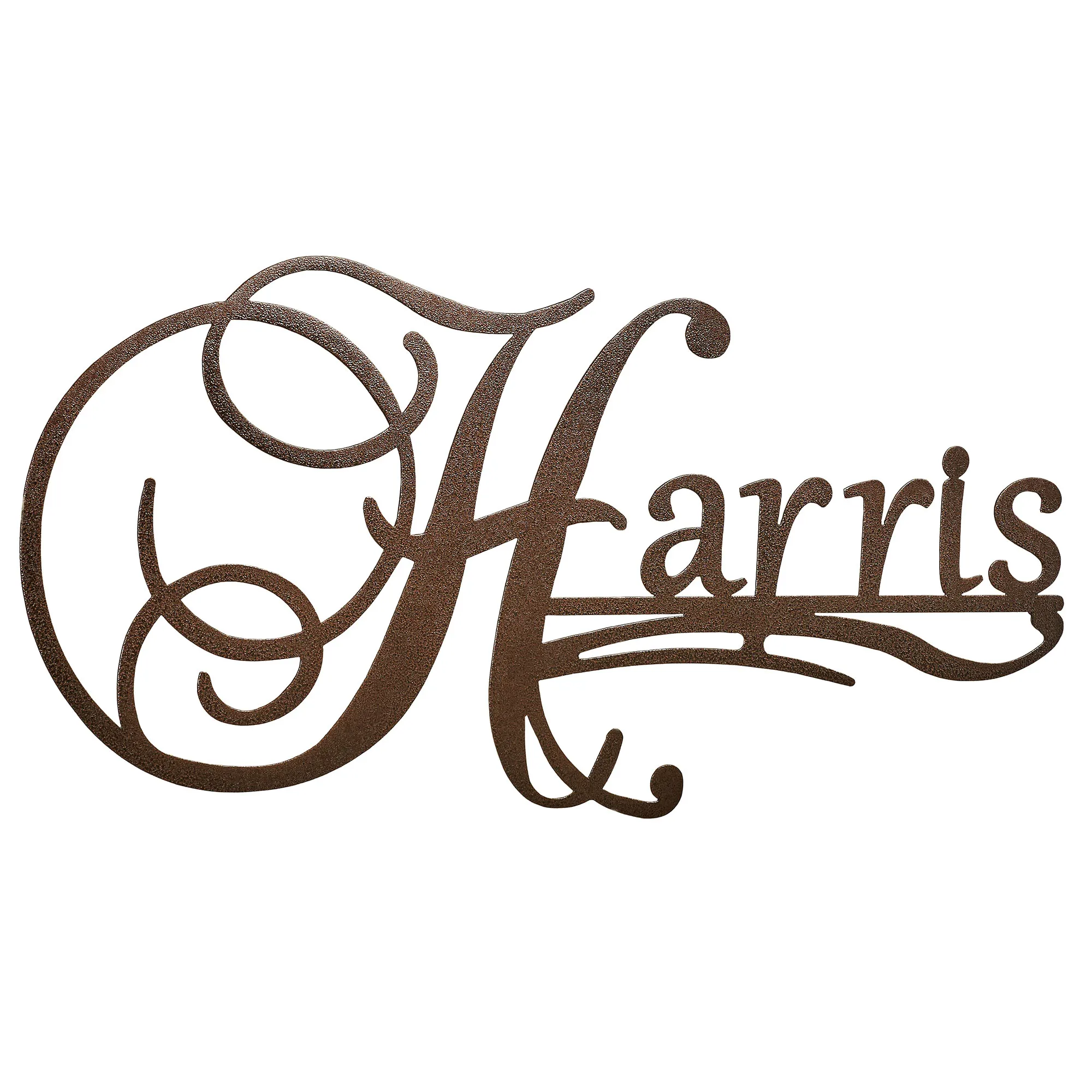 Those with an Affinity for their last name can display their heritage proudly with this wall sculpture designed by JasonW Studios(R). Handcrafted in the USA by skilled American craftsmen, the wall art sign is constructed of precision-cut 14-gauge steel and completed with a UV-, weather-, and tarnish-resistant powder-coat finish for a beautiful display inside or outside your home year round. Personalized with your name up to 8 characters, the sign contains a large scrolling uppercase initial followed by a coordinating lowercase font and accent scrolls. A hyphen counts as a character. For a last name with a prefix, the first letter of the prefix and the first letter of the rest of the surname will be uppercase, like MacDonald. Specify finish: Antique Copper, Antique Gold, Black, Bronze, or Gold. Measures approx. 40"Wx1.5"Dx20"H.