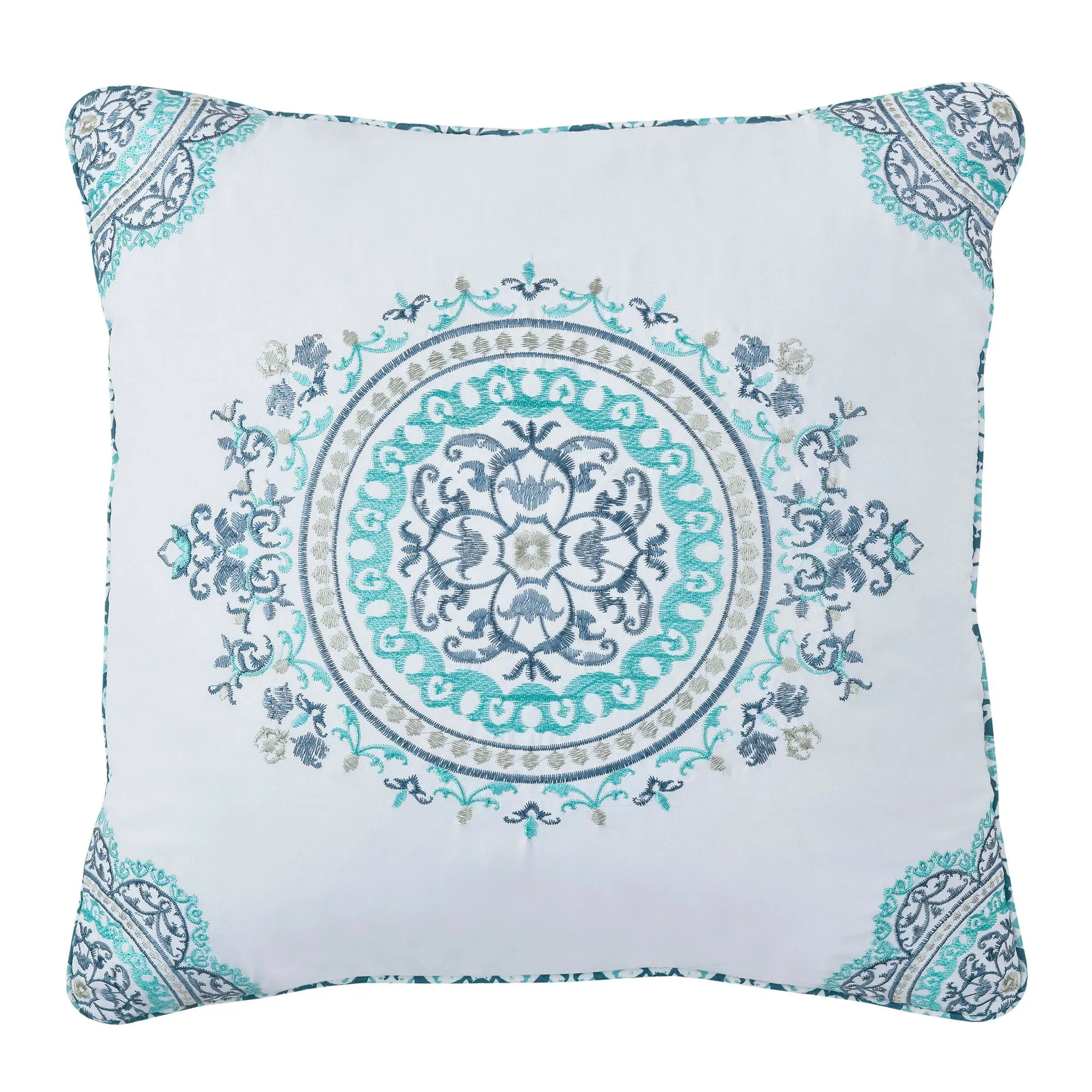 Sultry cool tones color the crisp white Afton Bedding with inviting charm. From Royal Court, the printed polyester ensemble features magnificent medallion designs in teal, aqua, dark teal, steel blue, and pale aqua tones. A mosaic medallion accent fabric adds further charm through the bedding.