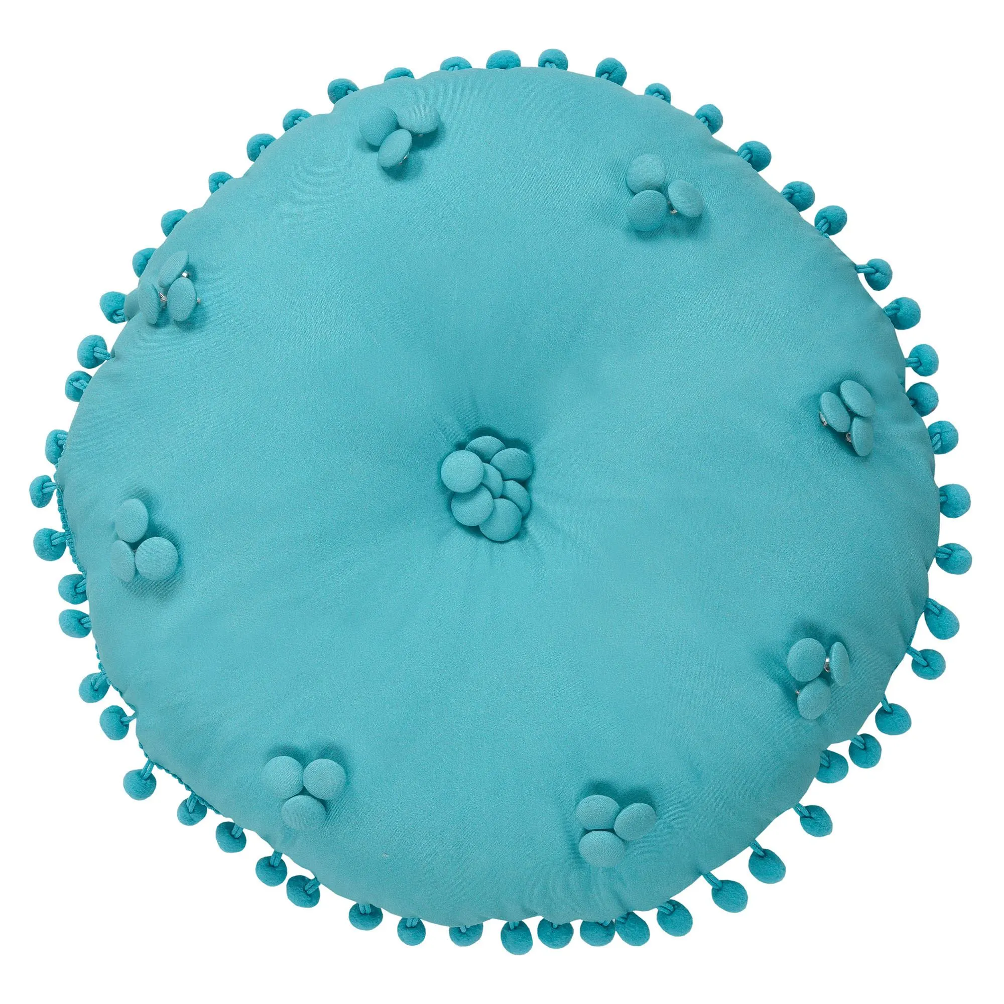 Pillows: Spot clean. Piped Square is white with an embroidered coordinating medallion design. Piped Rectangle is cathedral-quilted white; reverses to miniature mosaic medallions. Tufted Round is teal with covered button accents and pom-pom fringe trimmed edges.