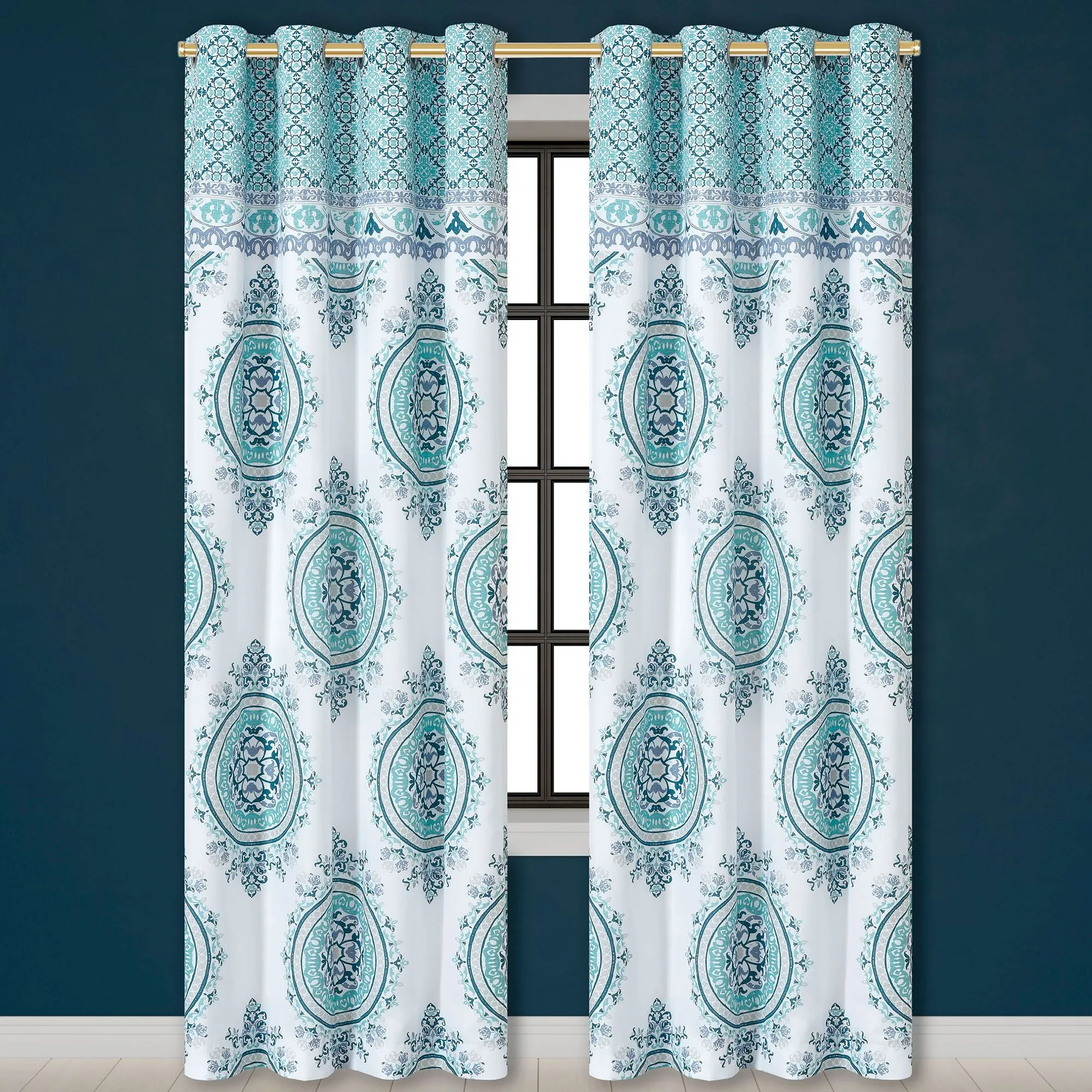 The lined Wide Grommet Curtain Pair has coordinating large medallions on white, a miniature mosaic medallion top, tailored edges, and 4" dia. metal grommets.
