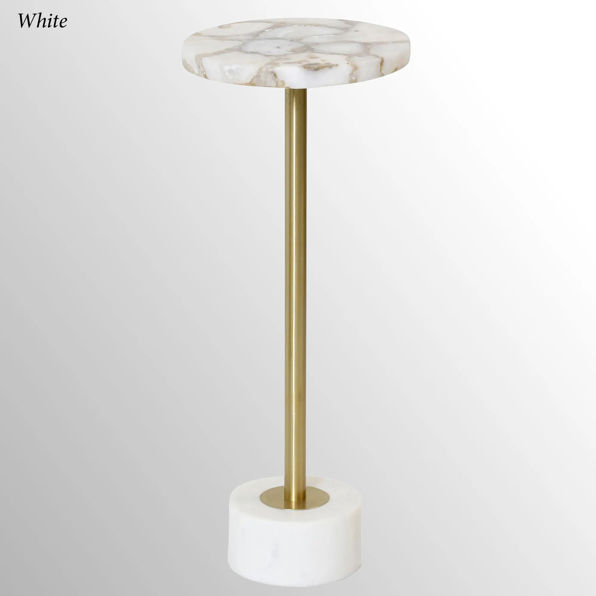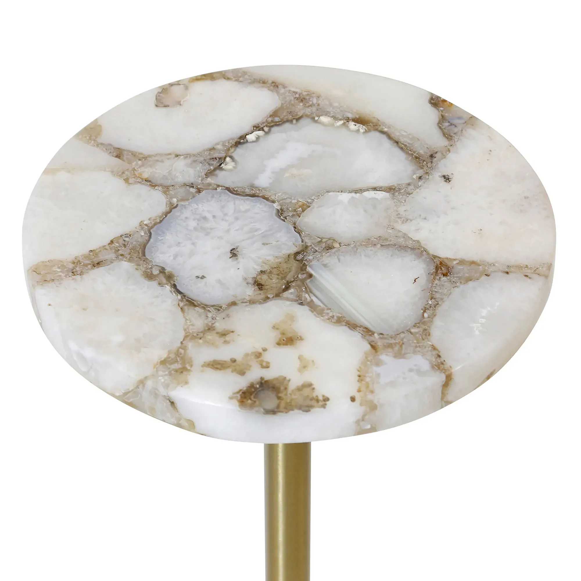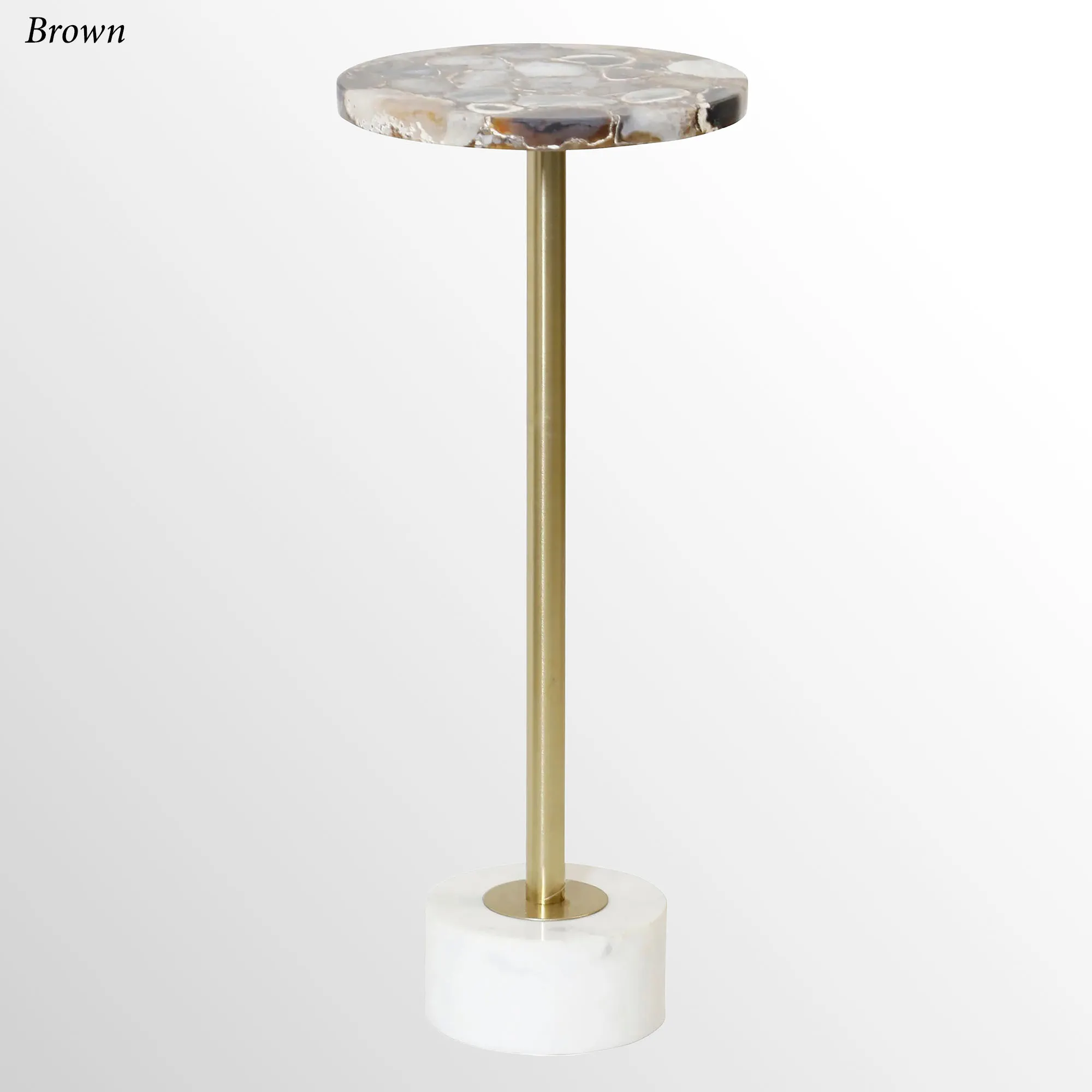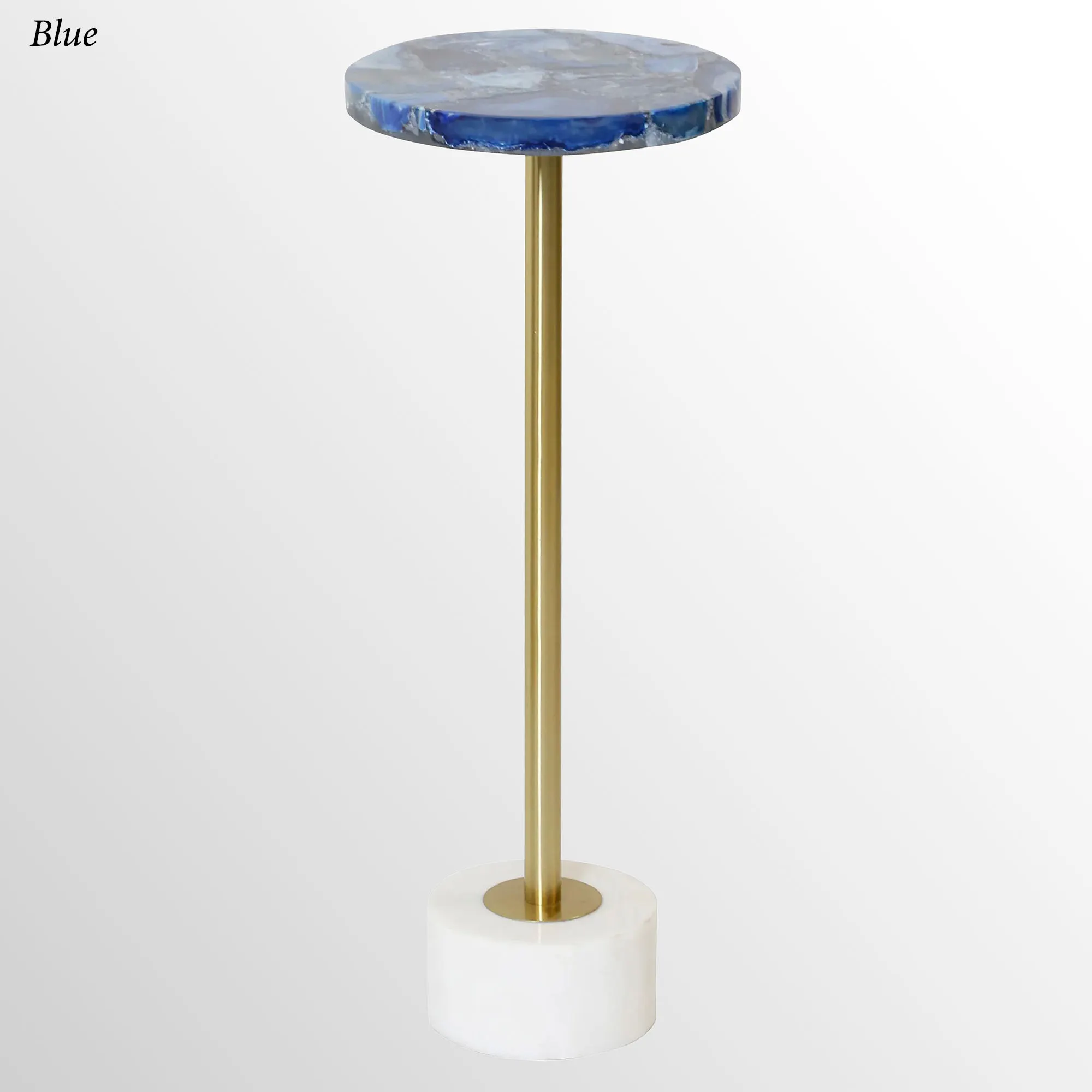 Everyone will want to place their drink on the stunning Agate Cocktail Drink Table. This cocktail table has a white marble bottom base, a metal center with a polished brass finish, and an agate top. White is white with small amounts of brown. Blue is blue with small amounts of white crystals showing. Brown shows a variety of neutral and brown-toned stone. Measures 10"dia.x24"H; weighs 15 lbs.