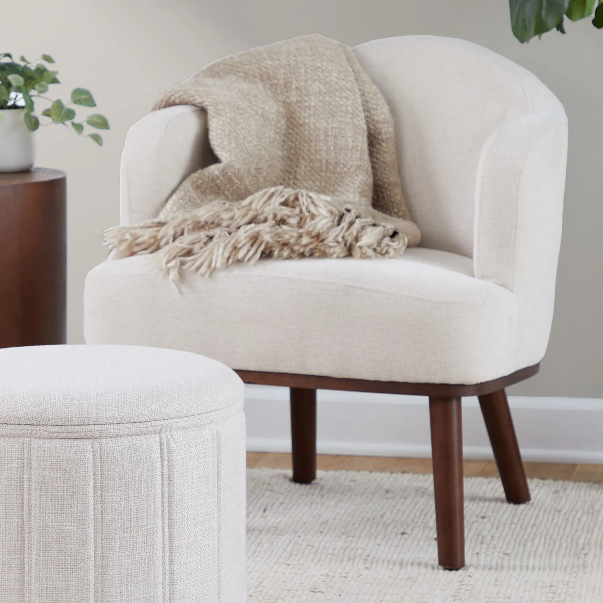 The curved detailing of the Ahoy Accent Chair exudes an air of plush comfort. With foam cushioned fill, the upholstered chair features a rounded backrest and curved arms adorned with an off-white woven polyester/cotton fabric. Walnut-finished, tapered round wood legs complete the design. Seat height is 17.5". Maximum weight capacity is 250 lbs. Perfect for extra seating, the accent chair measures 26"Wx26"Dx29.5"H and weighs approx. 25 lbs. Spot clean the fabric.