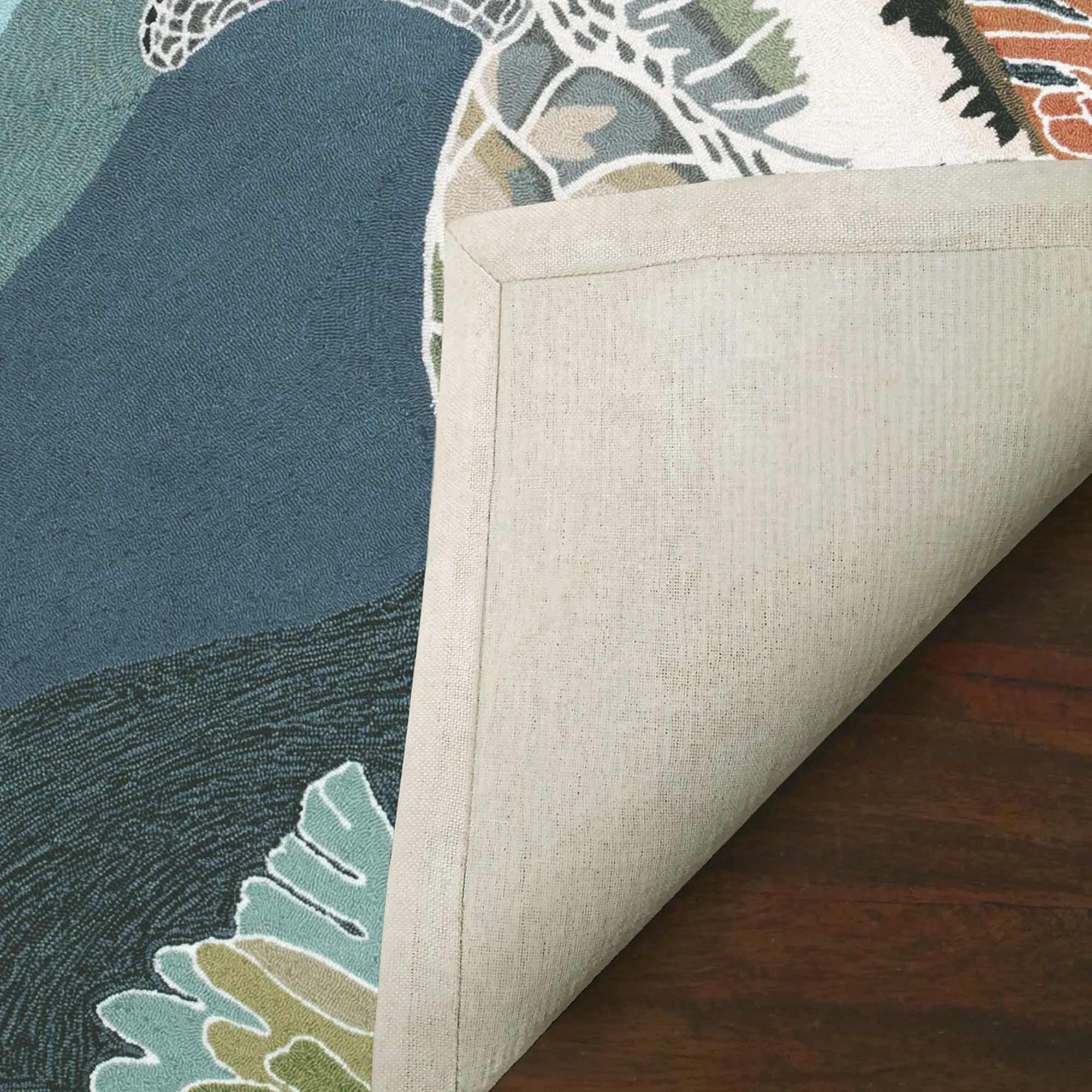 The Akumal Ocean Sea Turtle Indoor/Outdoor Round Rug, designed by Liora Manne, offers a glimpse to the beautiful depths of the sea. The hand-hooked, .5" thick, polypropylene/acrylic-blend rug features a graceful sea turtle gliding through the waves and coral reef. Shades of gray, blue, lime, teal, and sunset add vibrancy to your indoor or outdoor space. Backing is cloth-covered latex. Spot clean and rinse with a garden hose; for stubborn stains, we recommend professional cleaning by a rug cleaner. Outdoor seasonal use; do not expose this rug to freezing temperatures. Imported.
