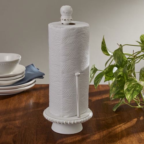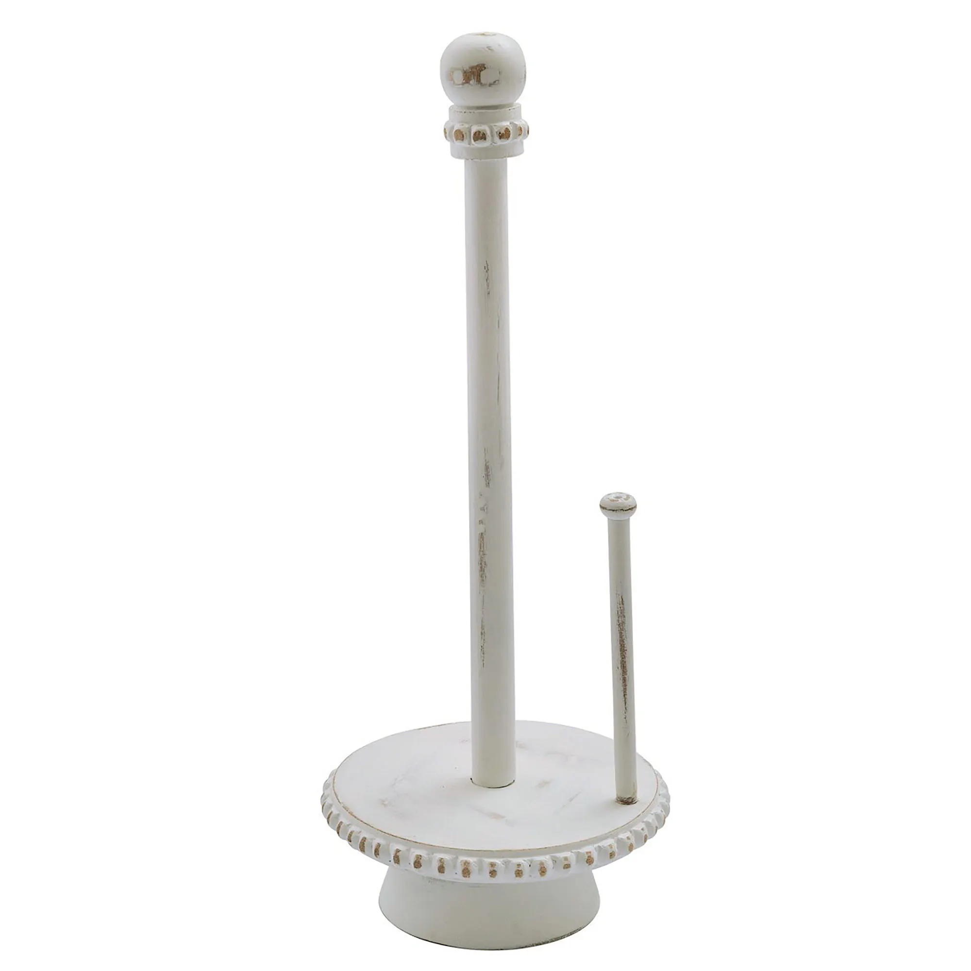 Charm your kitchen or dining space with the Alanna Paper Towel Holder. Finished with a classic whitewash, the mango wood design features a flared pedestal, convenient tear bar, and center post with a ball finial. Beaded detailing adds whimsy to the base and ball finial. Perfect for holding your paper towel roll, the countertop holder measures 6.5"dia.x15.5"H overall.