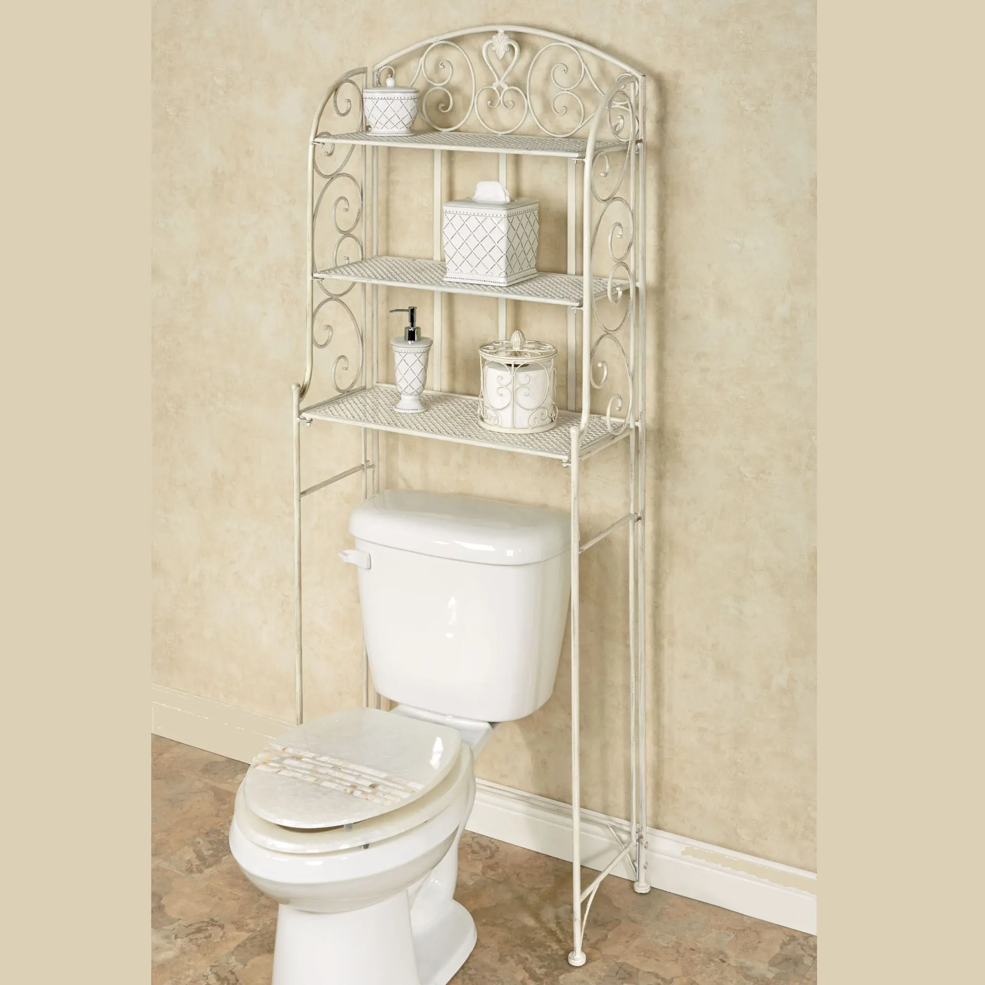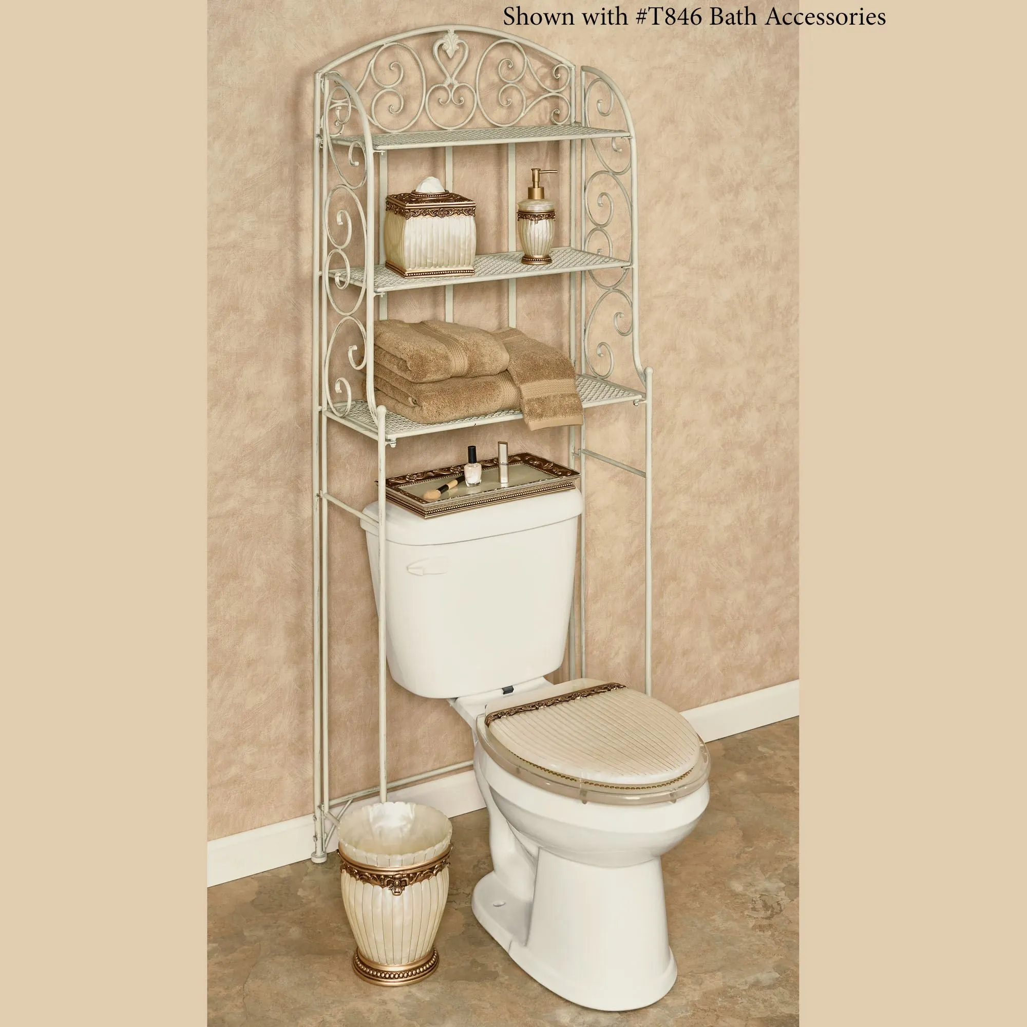 Grace your bathroom with the traditional styling of the Aldabella Creamy Gold Bathroom Space Saver. Handcrafted metal bathroom space saver helps keep things neat and tidy, while enhancing your decor with elegant, openwork scroll designs. Bath space saver has an arched back and sides and three lattice shelves. 24"Wx11"Dx64"H, 19 lbs.