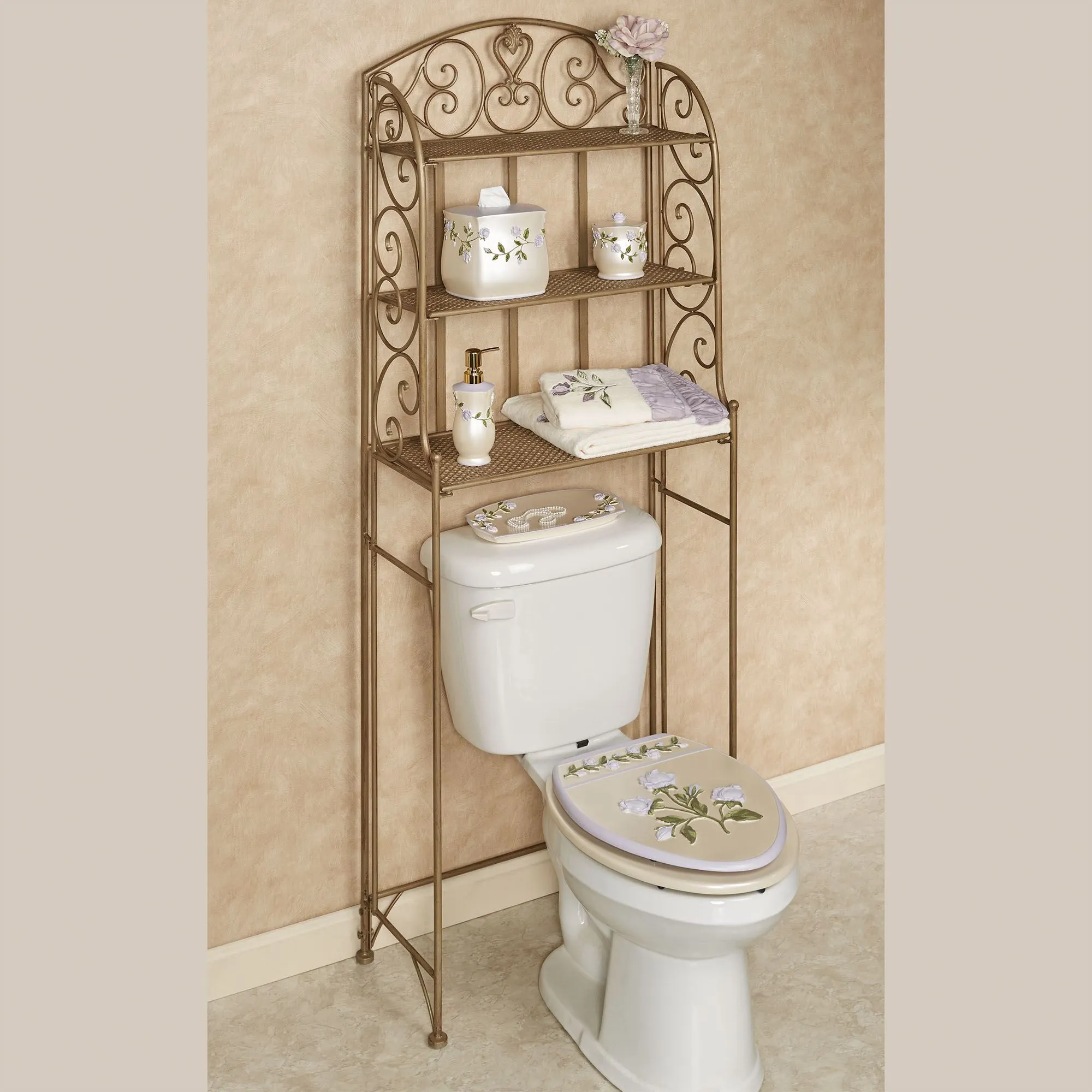 Grace your bathroom with the traditional styling of the Aldabella Satin Gold Bathroom Space Saver. Handcrafted metal bathroom space saver helps keep things neat and tidy, while enhancing your decor with elegant, openwork scroll designs. Bath space saver has an arched back and sides and three lattice shelves. 24"Wx11"Dx64"H, 19 lbs.