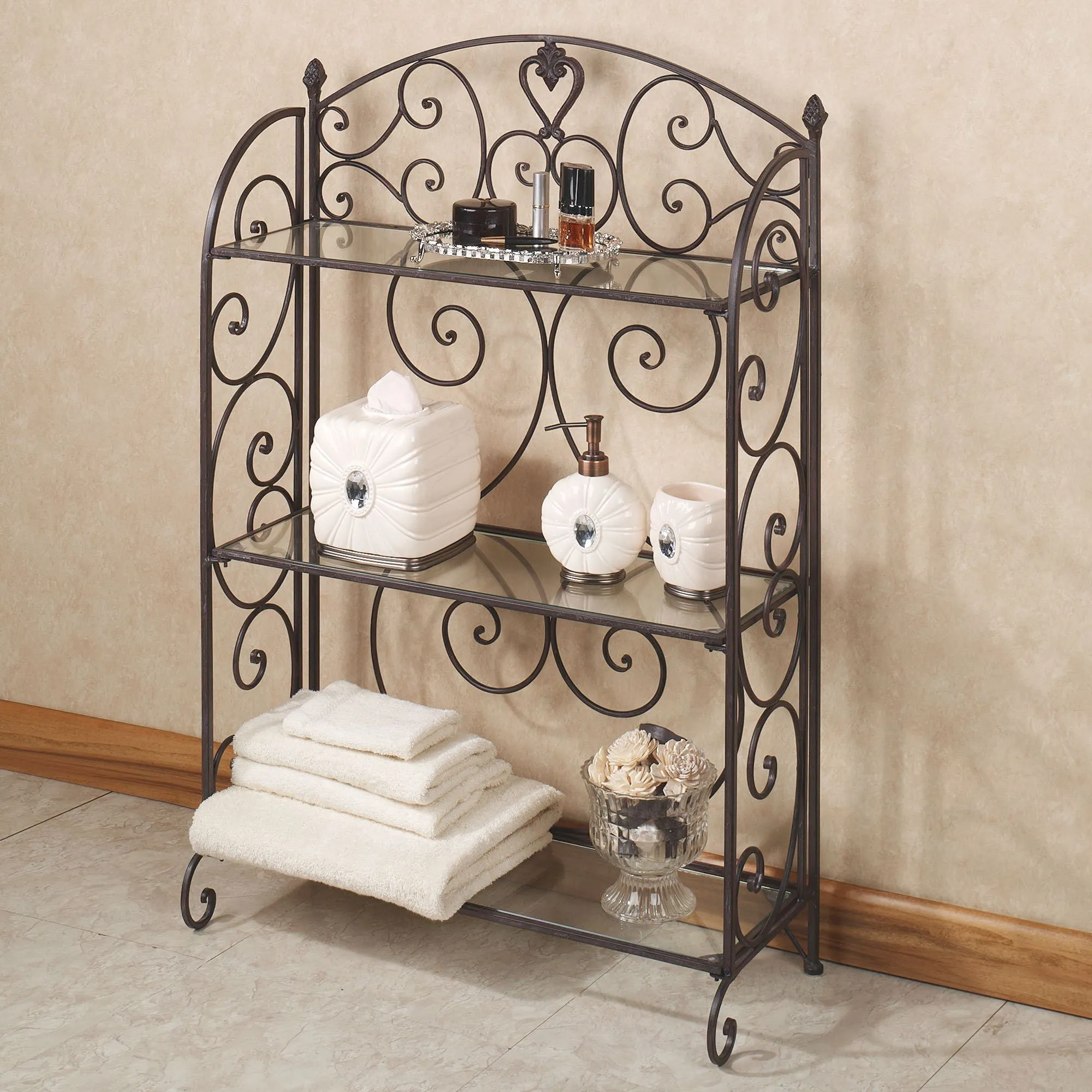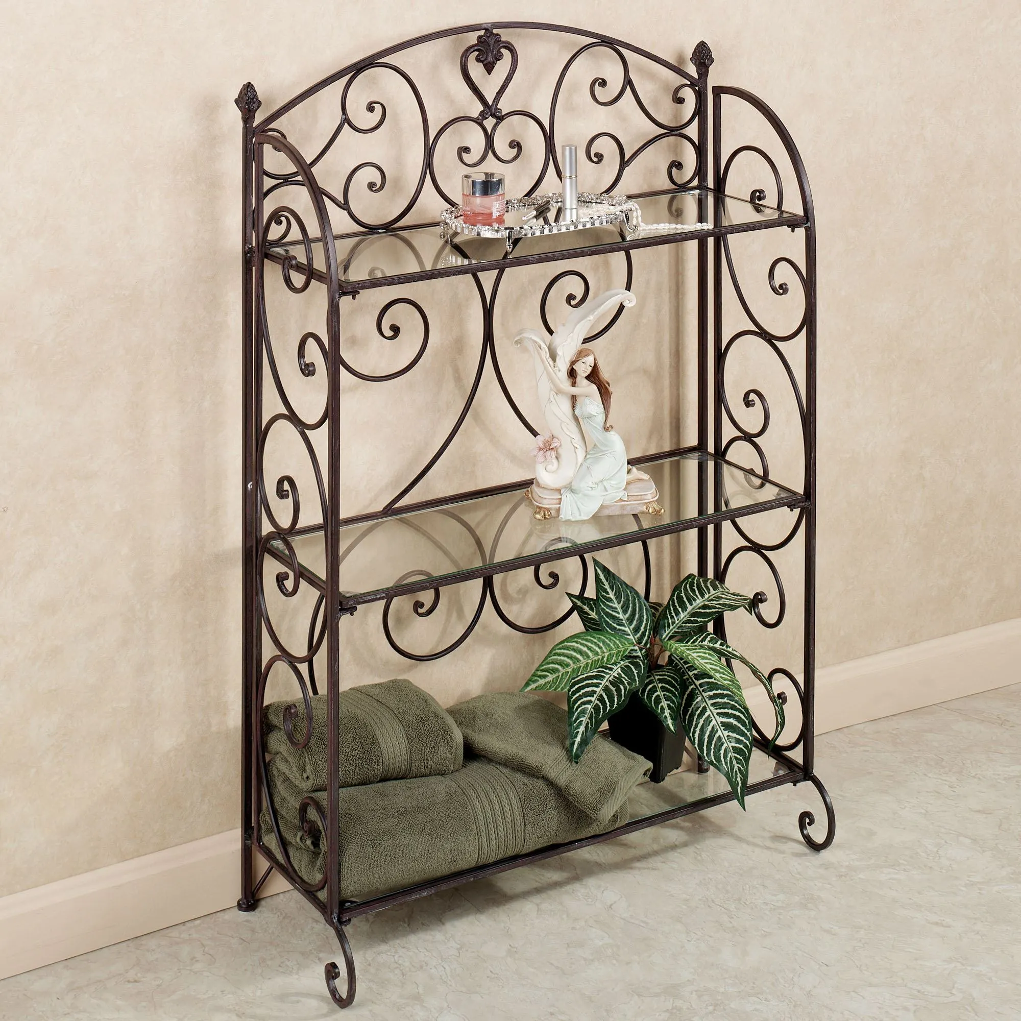 Grace your bathroom with the traditional styling of the Aldabella Tuscan Slate 3-Tier Etagere. Handcrafted metal etagere not only helps keep things tidy, but will also enhance your decor with elegant, openwork scroll designs and acorn accents. Etagere features scrolled sides and back with a central heart medallion and two acorn finials. The three glass shelves are perfect for displaying your decorative accents. 24"Wx9.5"Dx40"H, 24 lbs.
