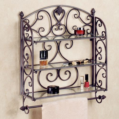 Grace your bathroom with the traditional styling of the Aldabella Tuscan Slate Wall Shelf with Towel Bar. Handcrafted metal accent not only helps keep things tidy, but it will also enhance your decor with elegant, openwork scroll designs and acorn accents. Wall shelf has a scrolled back with central heart medallion and two acorn finials. Three glass shelves provide valuable storage or display space, and a bottom bar with finials will display your towels with style. 23"Wx6"Dx23"H, 13 lbs.