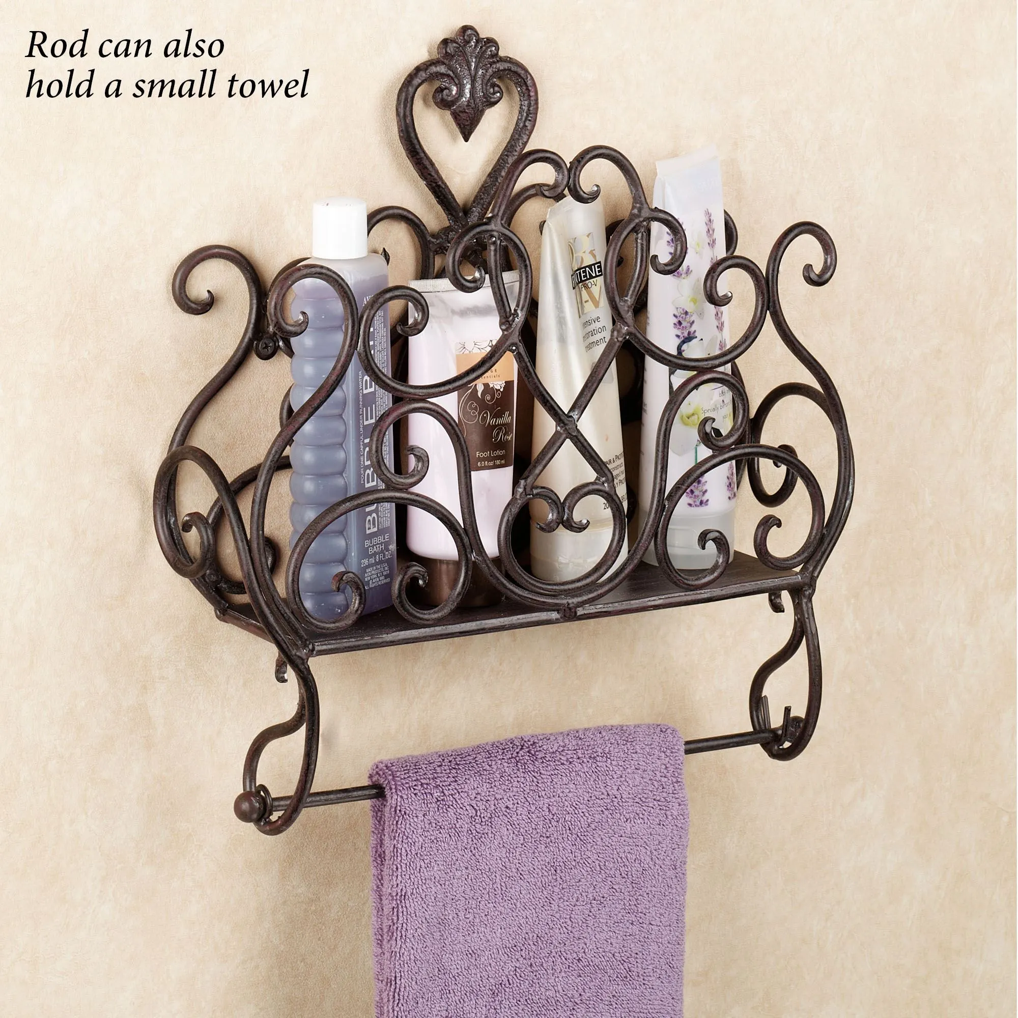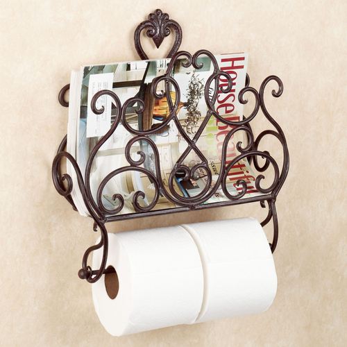 The Aldabella Tuscan Slate Wall Magazine Rack with Toilet Paper Holder serves two functions at once. The top basket can hold your periodicals; underneath is a rod for holding your toilet paper roll(s) or a small towel. Handpainted metal bathroom accent has elegant, openwork scroll designs. Wall magazine rack with toilet paper holder is 13.5"Wx3.5"Dx16"H.