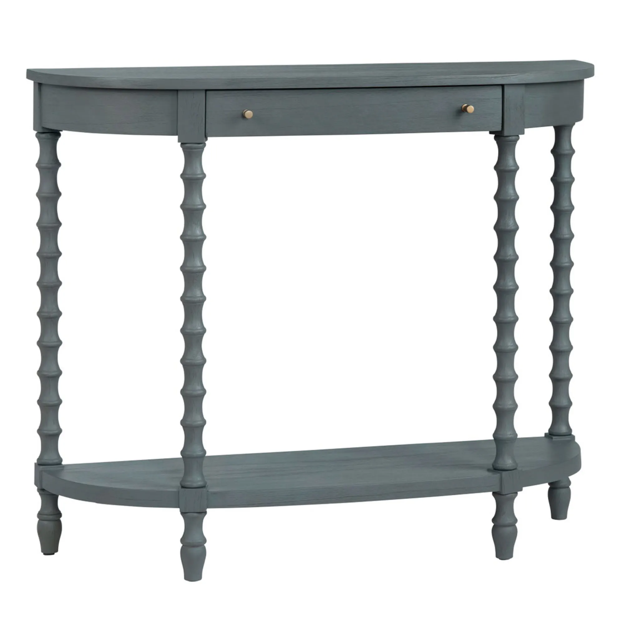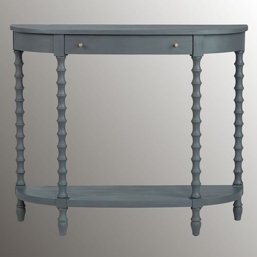 Delight in the details of the charming Alden Console Table. Finished in a classic rich gray, the wood demilune table features uniquely shaped legs, a lower display shelf, and a wide top with a built-in storage drawer. The aged gold iron metal knobs adorn the front of the drawer for a modern touch with a simplistic circular shape. Overall, the slender console table measures 40"Wx14"Dx34"H and weighs approx. 22 lbs.