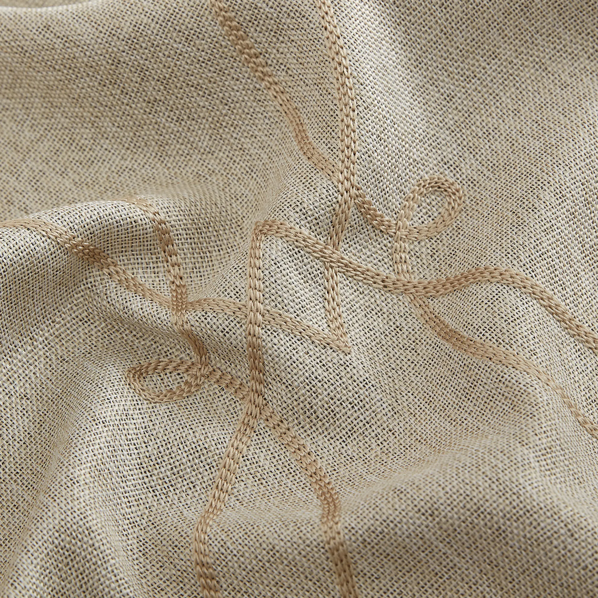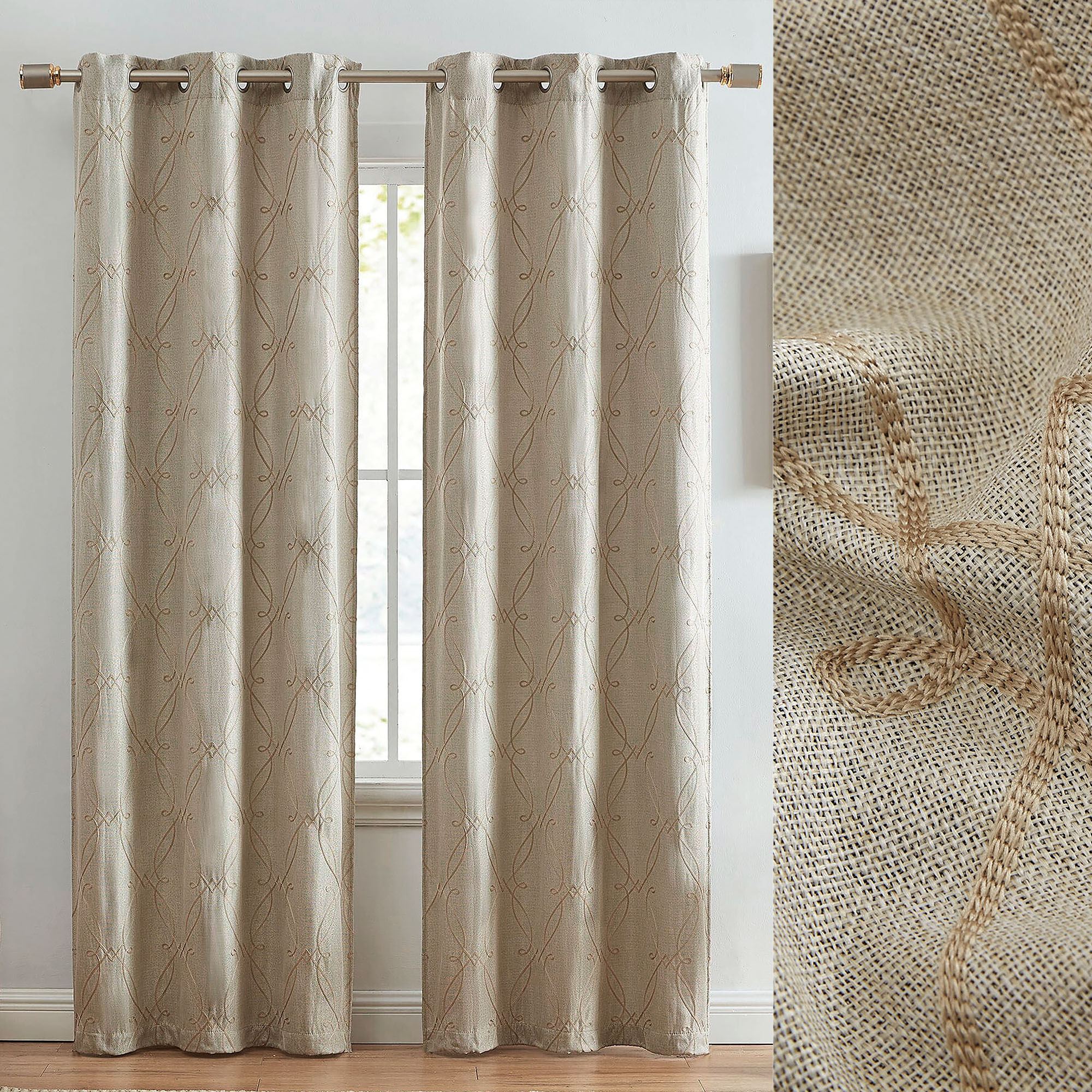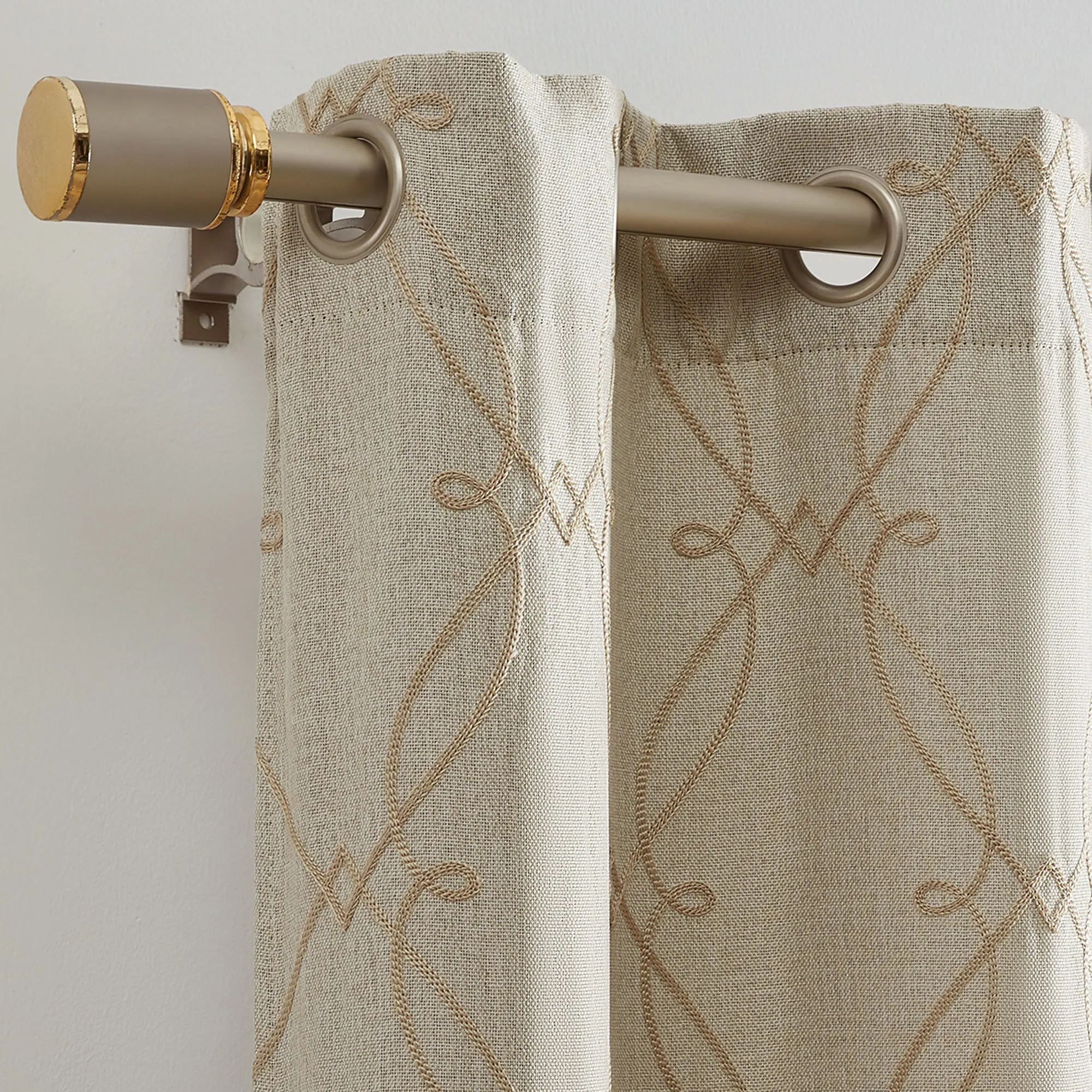 Lattice embroidery in dark beige adds dimension to the Aldine Grommet Curtain Pair. The room darkening, polyester window treatment has a backing made from layers of black yarns woven between layers of colored yarns, which helps to reduce noise and save energy. Each natural panel has six metal grommets, 1.5" dia., with a brushed nickel finish. Curtain pair is 74"W. Machine washable. Imported. The curtain pair width is the total width of two panels together.