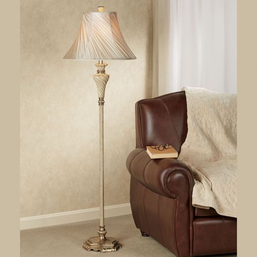 Enjoy the soft glow from the stately Aleisha Floor Lamp. With a twisting appeal, the shirred alabaster, cotton/polyester shade diffuses light, while the cream faux marble resin accent adds elegance to the slender metal font. Handpainted antique platinum accents embellish the design. UL listed. Requires one 3-way 100W max. bulb. Overall, the floor lamp measures 18"dia.x60"H, including the 1.75"H finial.
