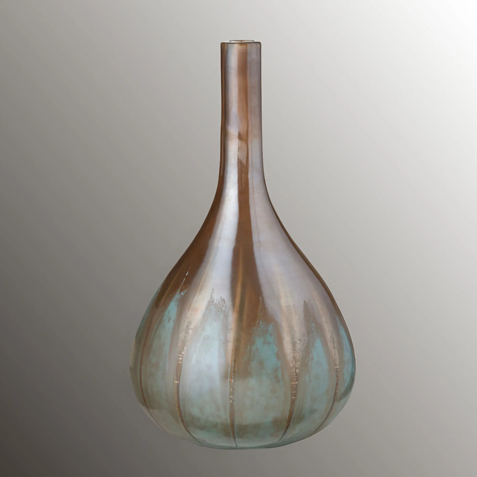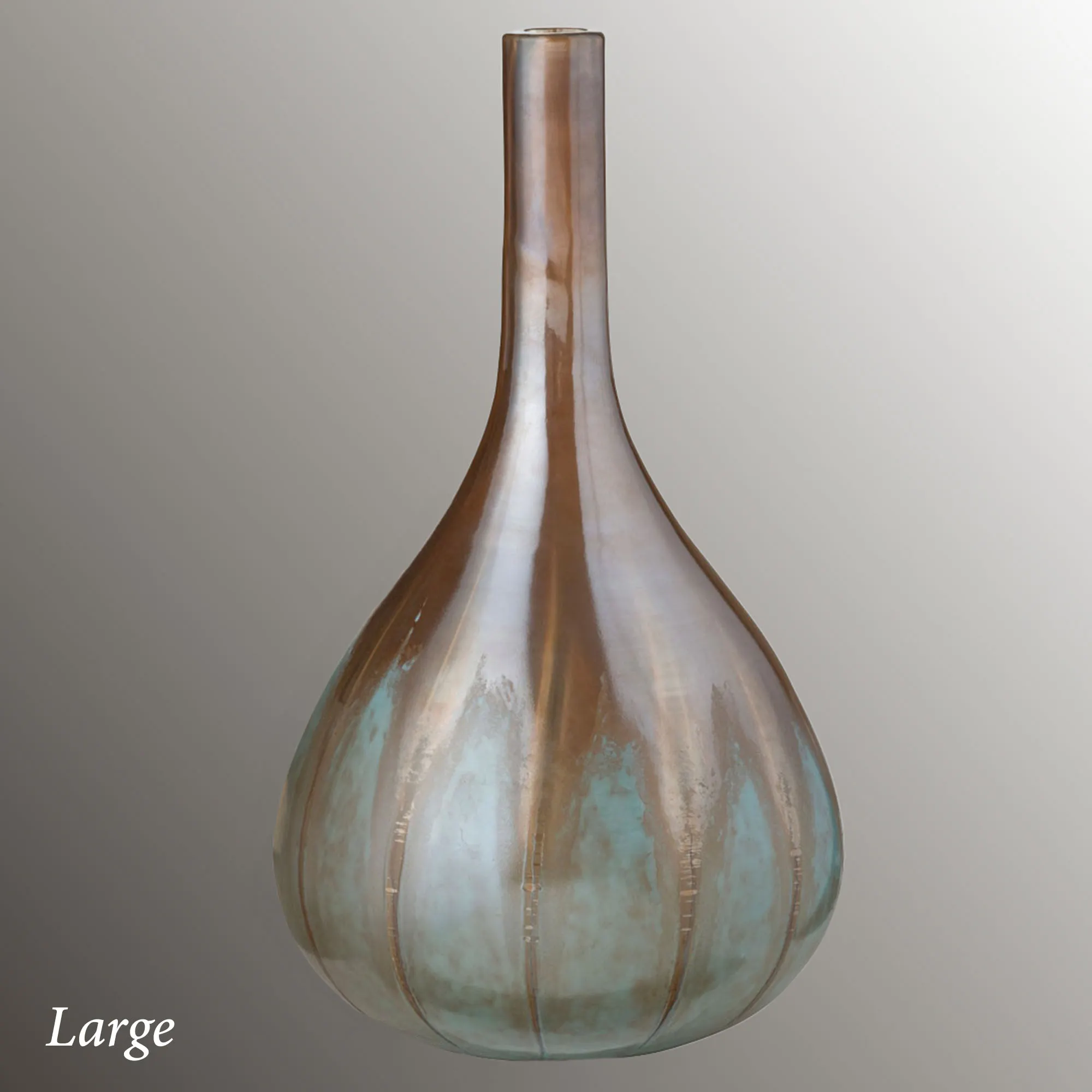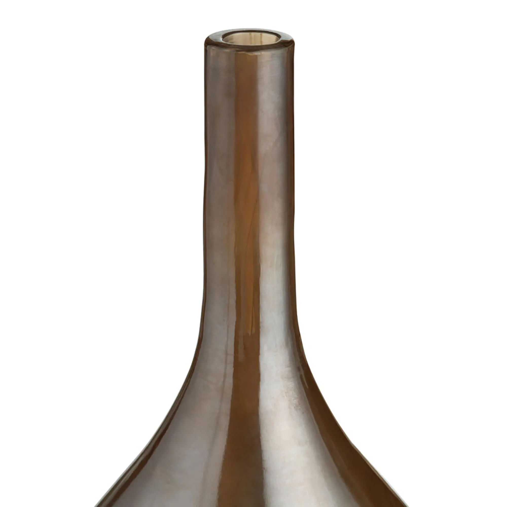 The Alina Vase decorates any space with its unique look. This brown glass vase has designs along with blue and green accents on the bottom half. Vases are sold individually. Small is 8.5"dia.x10"H. Large is 9"dia.x16"H.
