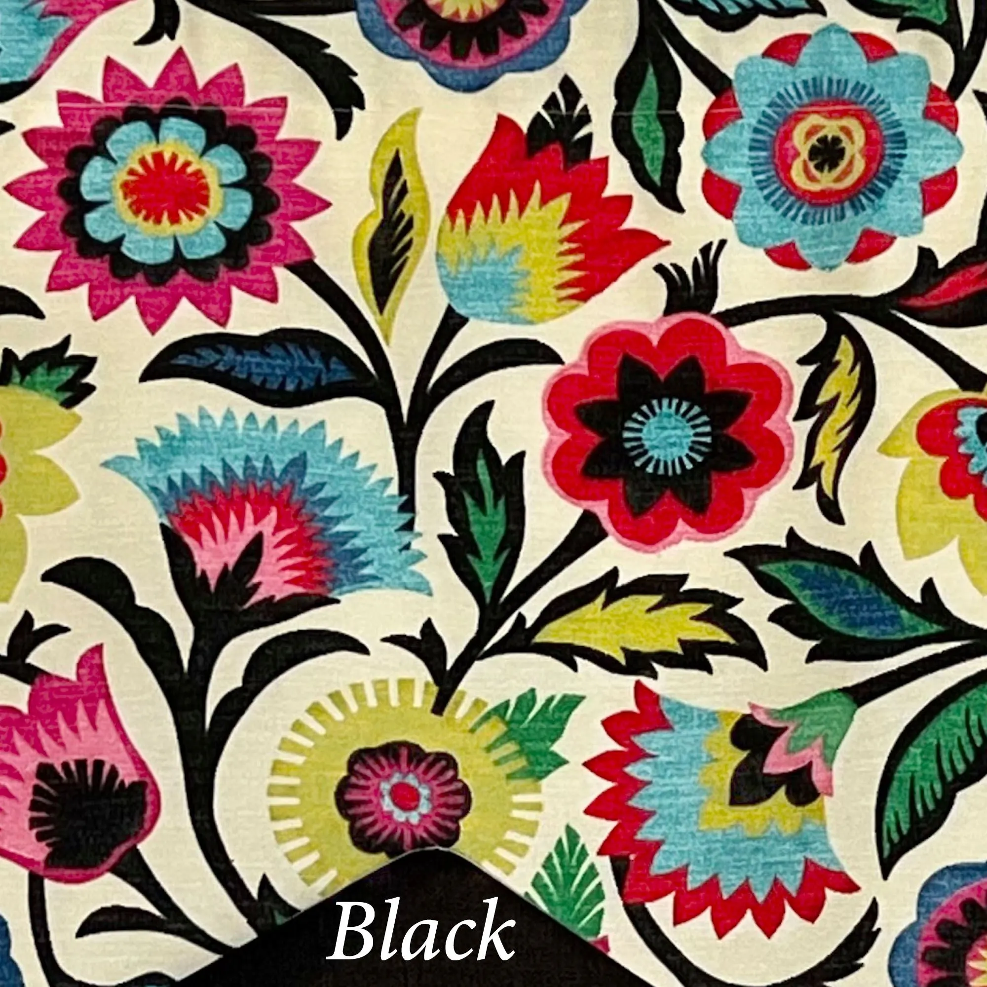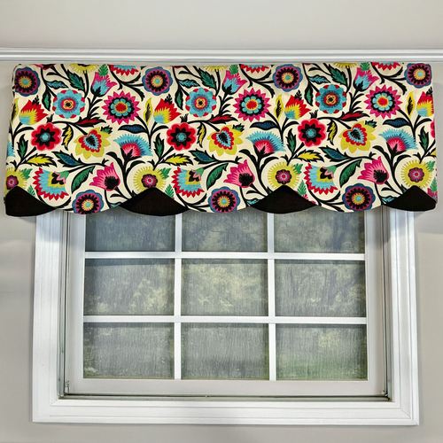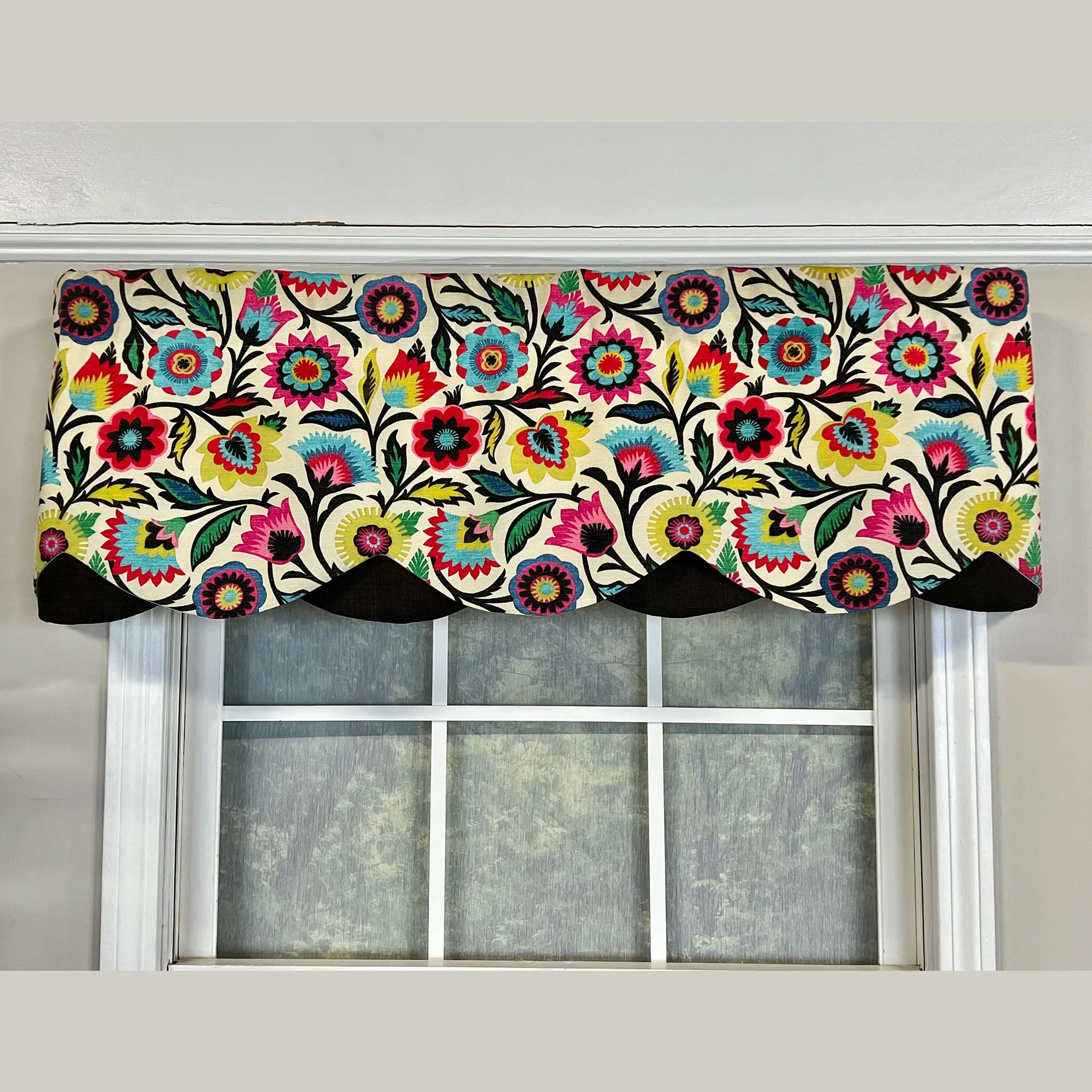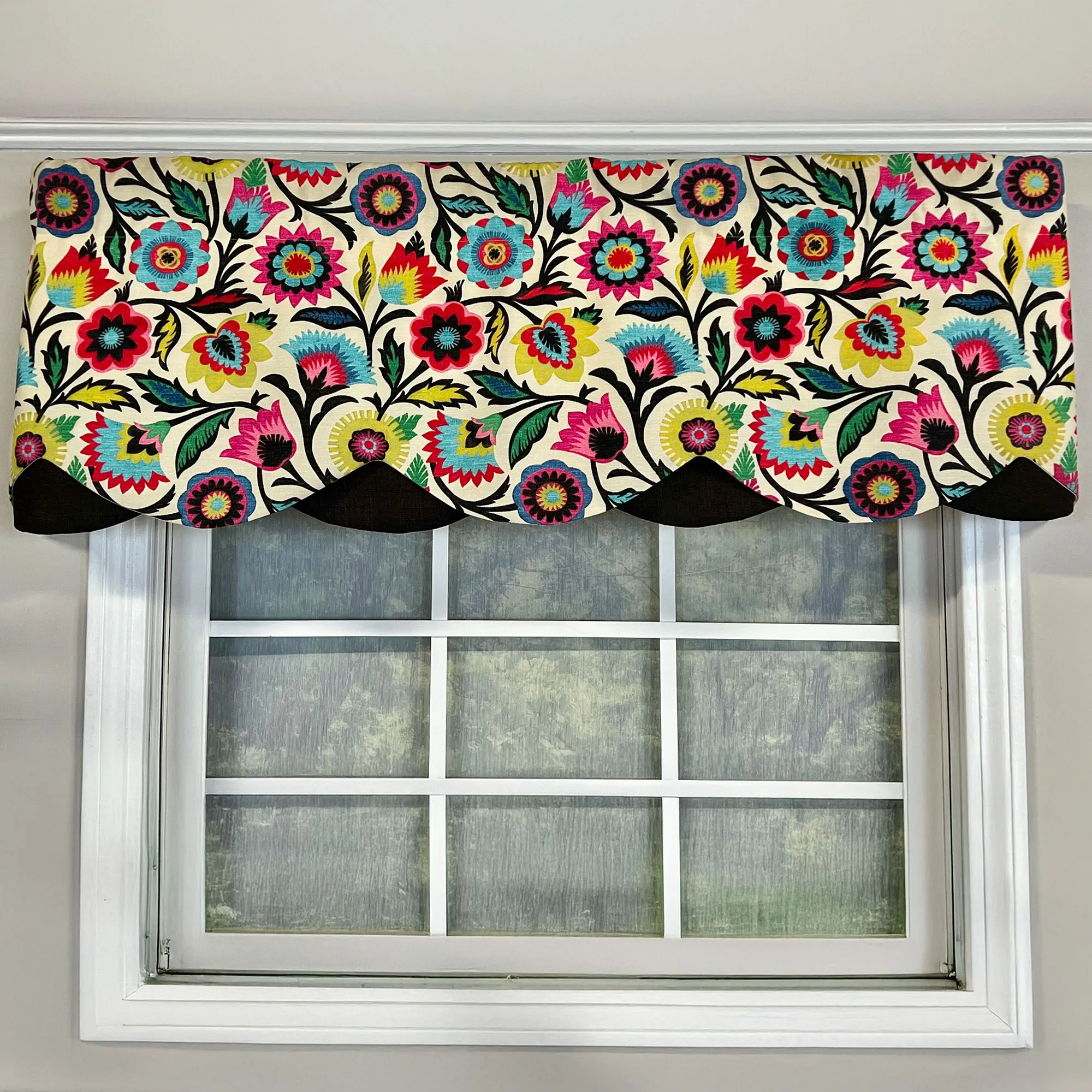 Bold blossoms color the Allaire Flora Petticoat Window Valance with panache. With a layered design, the ivory cotton petticoat-style valance features bright printed flowers and a solid color bottom layer. Scalloped edges finish each layer, and the lining is polyester/cotton. Rust has hues of rust, orange, gold, gray, ember glow, teal, and fern. Black has hues of black, red, green, pink, and blue. Rod pocket measures 3". Valance is 51"Wx16"L. Spot clean only. Made in the USA with imported materials.