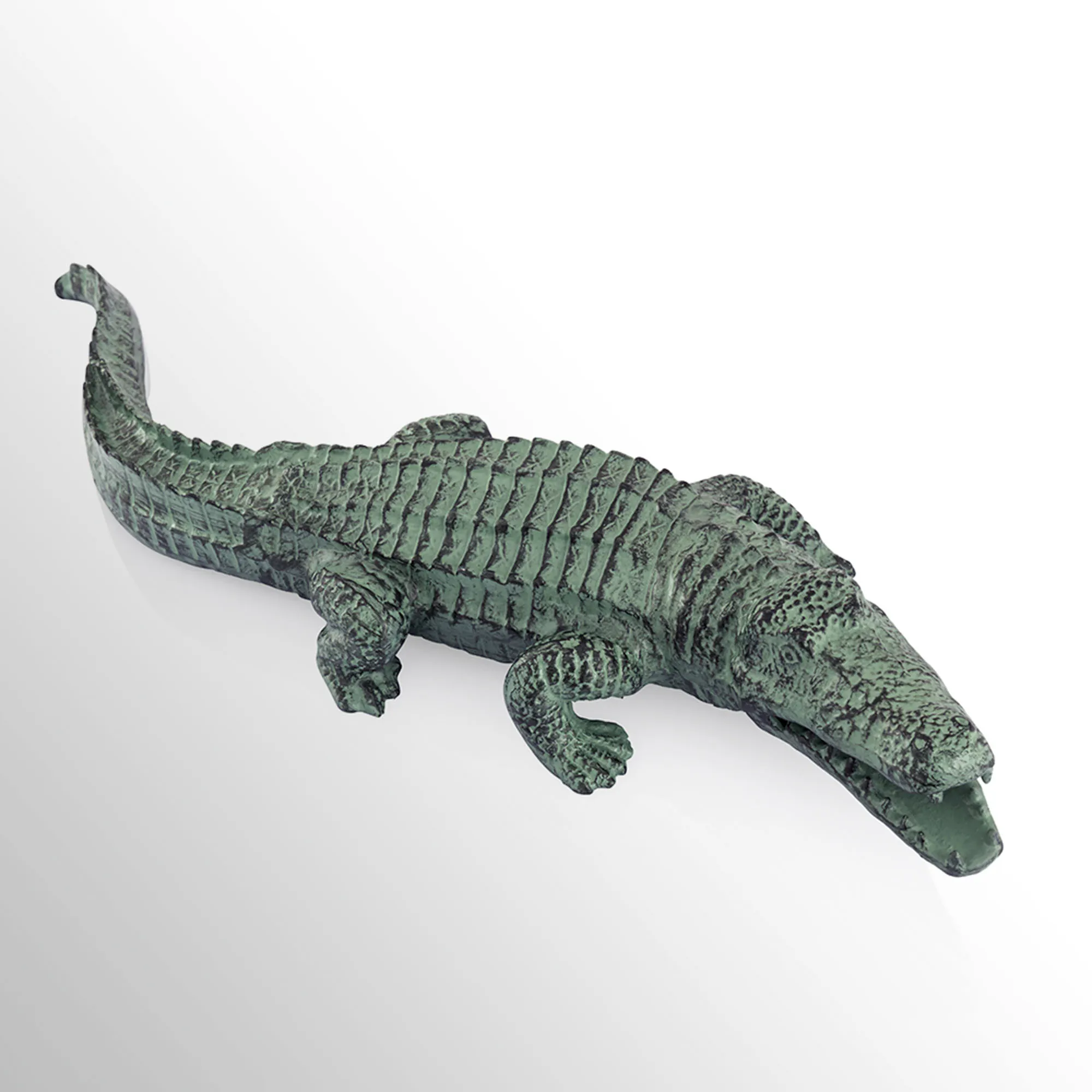 This Alligator will smile wide at the sights in your indoor or outdoor space year round. Hand-cast from aluminum, the alligator sculpture features a hand-rubbed verdi green and black finish. Overall, the alligator sculpture measures 33"Wx11"Dx5.5"H.